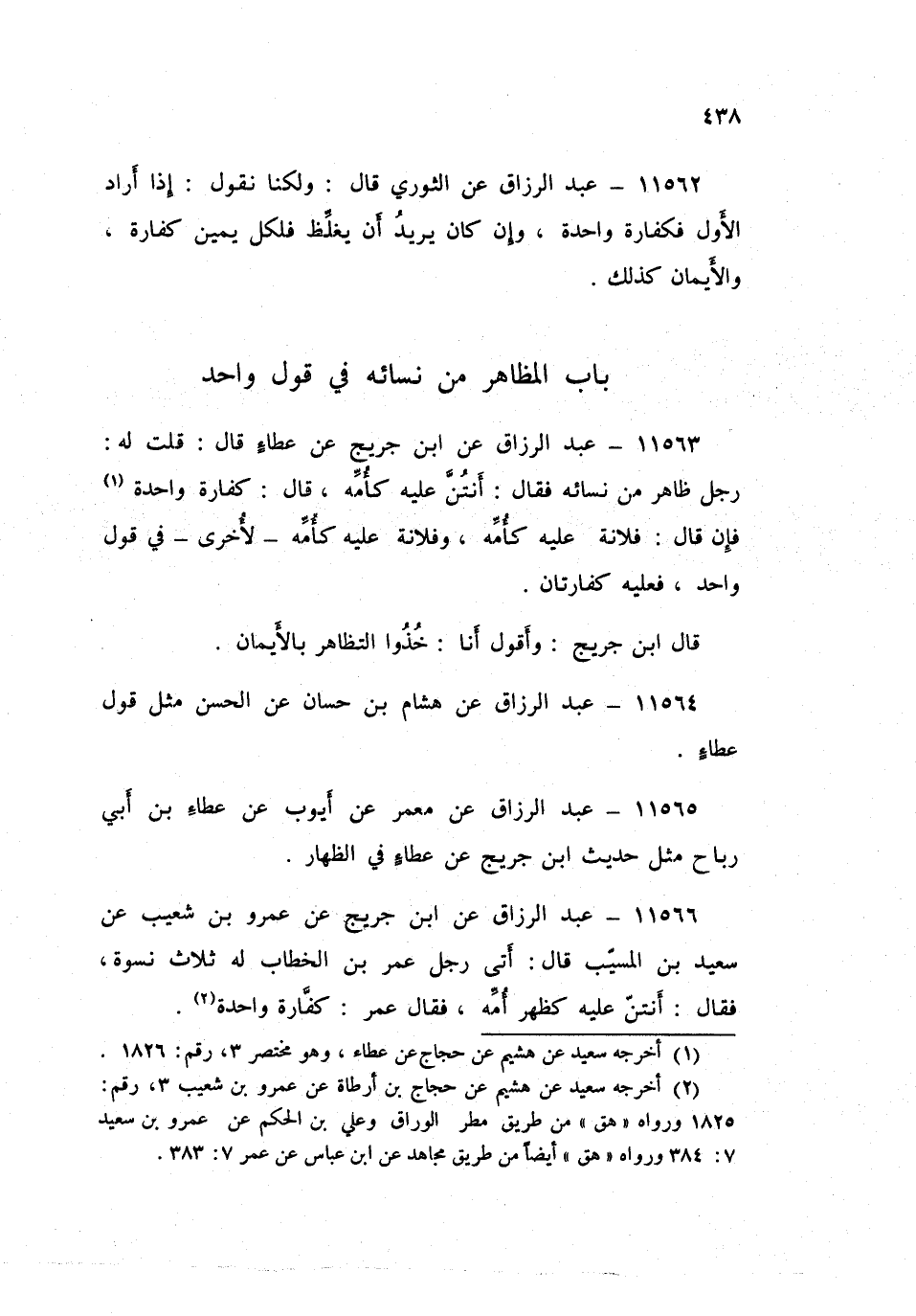 ١١٥٦٦ - عَنِ ابْنِ جُرَيْجٍ، عَنْ عَمْرِو بْنِ شُعَيْبٍ، عَنْ سَعِيدِ بْنِ الْمُسَيِّبِ قَالَ: أَتَى رَجُلٌ عُمَرَ بْنَ الْخَطَّابِ لَهُ ثَلَاثُ نِسْوَةٍ، فَقَالَ: أَنْتُنَّ عَلَيْهِ كَظَهْرِ أُمِّهِ، فَقَالَ عُمَرُ: «كَفَّارَةٌ وَاحِدَةٌ»