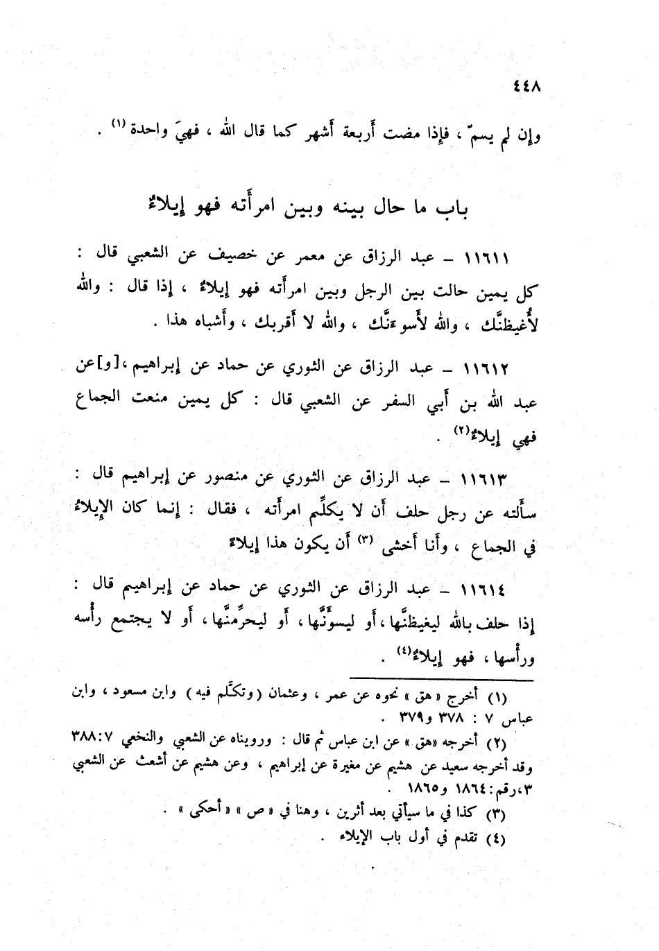 ١١٦١٤ - عَنِ الثَّوْرِيِّ، عَنْ حَمَّادٍ، عَنْ إِبْرَاهِيمَ قَالَ: «إِذَا حَلَفَ بِاللَّهِ لَيَغِيظَنَّهَا، أَوْ لَيَسُوءَنَّهَا، أَوْ لَيُحَرِّمَنَّهَا، أَوْ لَا يَجْتَمِعُ رَأْسُهُ وَرَأْسُهَا فَهُوَ إِيلَاءٌ»