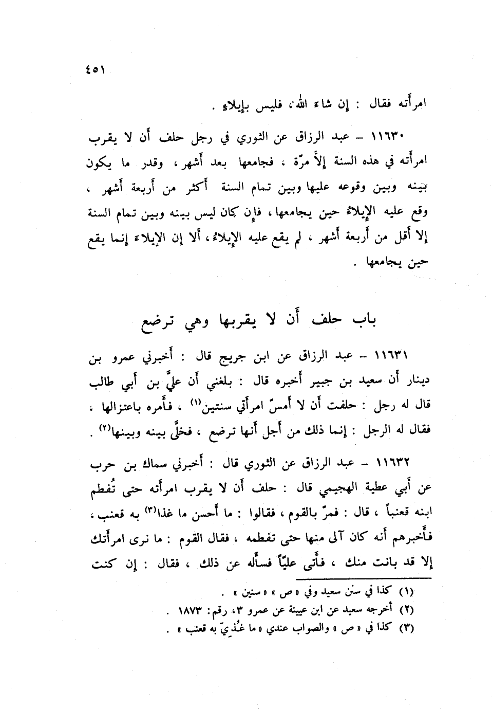 ١١٦٣١ - عَنِ ابْنِ جُرَيْجٍ قَالَ: أَخْبَرَنِي عَمْرُو بْنُ دِينَارٍ، أَنَّ سَعِيدَ بْنَ جُبَيْرٍ، أَخْبَرَهُ قَالَ: بَلَغَنِي أَنَّ عَلِيَّ بْنَ أَبِي طَالْبٍ قَالَ لَهُ رَجُلٌ: «حَلَفْتُ أَنْ لَا أَمَسَّ امْرَأَتِي سَنَتَيْنِ، فَأَمَرَهُ بَاعْتِزَالِهَا»، فَقَالَ لَهُ الرَّجُلُ: «إِنَّمَا ذَلِكَ مِنْ أَجْلِ أَنَّهَا تُرْضِعُ، فَخَلَّى بَيْنَهُ وَبَيْنَهَا»