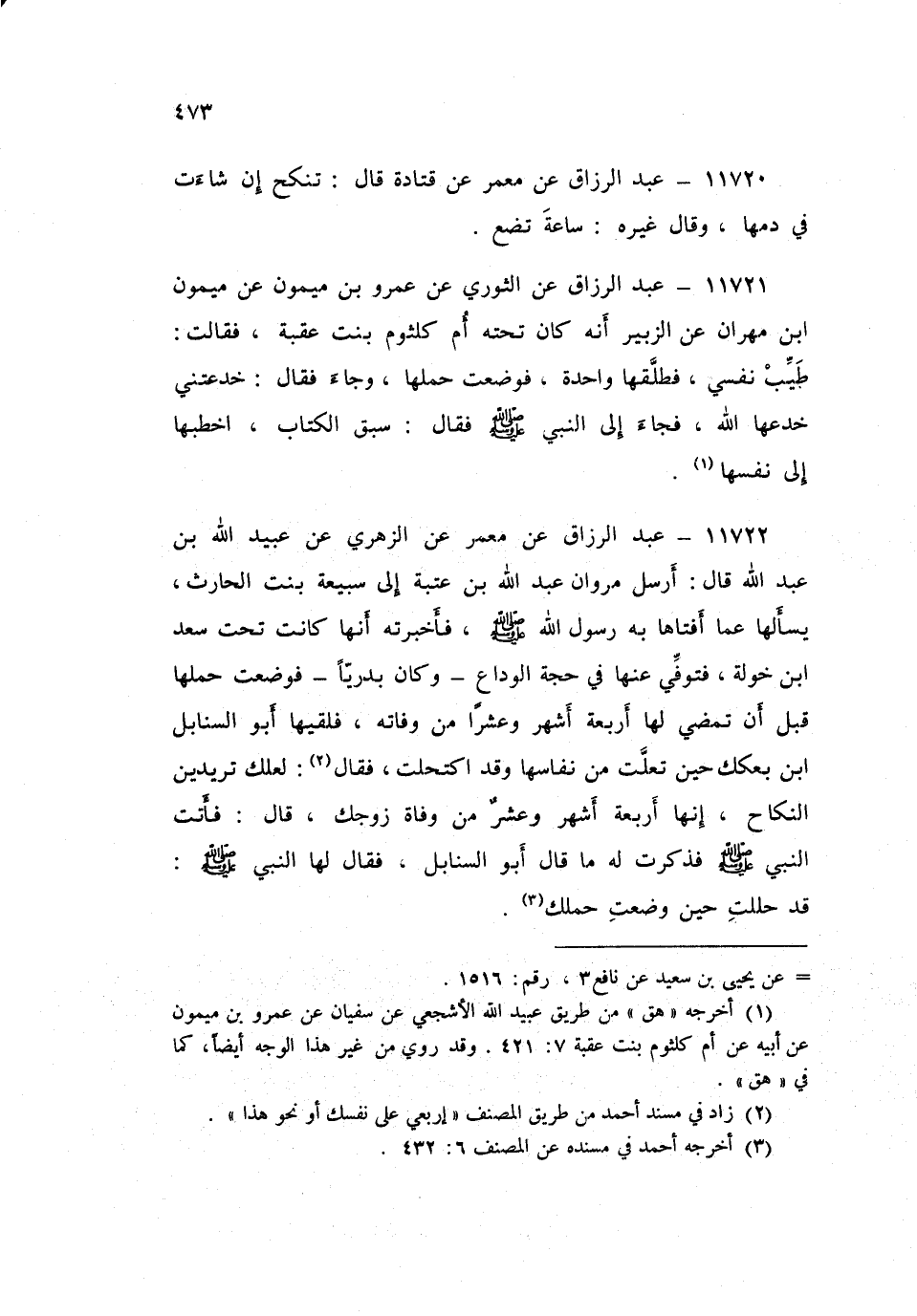 ١١٧٢٢ - عَنْ مَعْمَرٍ، عَنِ الزُّهْرِيِّ، عَنْ عُبَيْدِ اللَّهِ بْنِ عَبْدِ اللَّهِ قَالَ: أَرْسَلَ مَرْوَانُ عَبْدَ اللَّهِ بْنَ عُتْبَةَ إِلَى سُبَيْعَةَ بِنْتِ الْحَارِثِ يَسْأَلُهَا عَمَّا أَفْتَاهَا بِهِ رَسُولُ اللَّهِ صَلَّى اللهُ عَلَيْهِ وَسَلَّمَ، فَأَخْبَرَتْهُ أَنَّهَا كَانَتْ تَحْتَ سَعْدِ بْنِ خَوْلَةَ فَتُوُفِّيَ عَنْهَا فِي حَجَّةِ الْوَدَاعِ، وَكَانَ بَدْرِيًّا فَوَضَعَتْ حَمْلَهَا قَبْلَ أَنْ تَمْضِيَ لَهَا أَرْبَعَةُ أَشْهُرٍ وَعَشْرٌ مِنْ وَفَاتِهِ، فَلَقِيَهَا أَبُو السَّنَابِلِ بْنُ بَعْكَكٍ حِينَ تَعَلَّتْ مِنْ نِفَاسِهَا، وَقَدِ اكْتَحَلَتْ، فَقَالَ: لَعَلَّكِ تُرِيدِينَ النِّكَاحَ إِنَّهَا أَرْبَعَةُ أَشْهُرٍ وَعَشْرٌ مِنْ وَفَاةِ زَوْجِكِ قَالَ: فَأَتَتِ النَّبِيَّ صَلَّى اللهُ عَلَيْهِ وَسَلَّمَ فَذَكَرَتْ لَهُ مَا قَالَ أَبُو السَّنَابِلِ، فَقَالَ لَهَا النَّبِيُّ صَلَّى اللهُ عَلَيْهِ وَسَلَّمَ: «قَدْ حَلَلْتِ حِينَ وَضَعْتِ حَمْلَكِ»