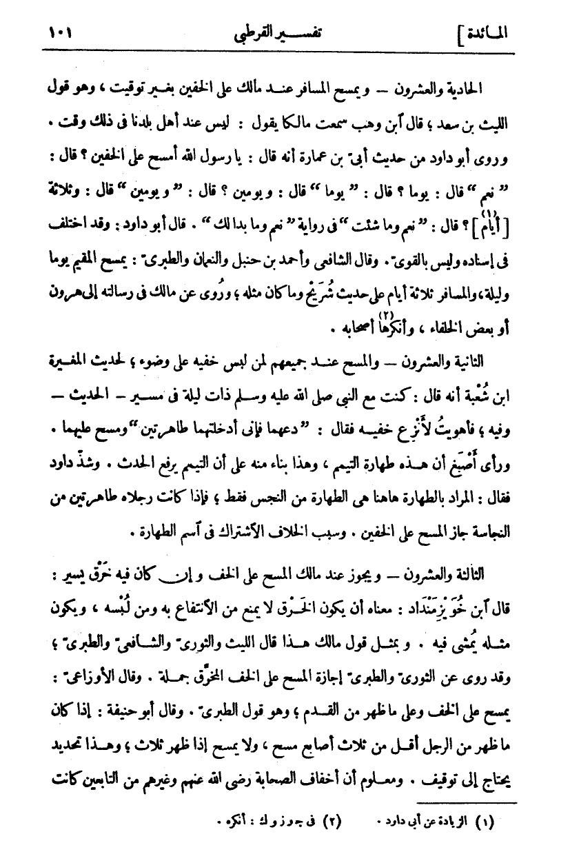 الْحَادِيَةُ وَالْعِشْرُونَ- وَيَمْسَحُ الْمُسَافِرُ عِنْدَ مَالِكٍ عَلَى الْخُفَّيْنِ بِغَيْرِ تَوْقِيتٍ، وَهُوَ قَوْلُ اللَّيْثِ بْنِ سَعْدٍ، قَالَ ابْنُ وَهْبٍ سَمِعْتُ مَالِكًا يَقُولُ: لَيْسَ عِنْدَ أَهْلِ بَلَدِنَا فِي ذَلِكَ وَقْتٌ. وَرَوَى أَبُو دَاوُدَ مِنْ حَدِيثِ أُبَيِّ بْنِ عِمَارَةَ أَنَّهُ قَالَ: يَا رَسُولَ اللَّهِ أَمْسَحُ عَلَى الْخُفَّيْنِ؟ قَالَ: (نَعَمْ) قَالَ: يَوْمًا؟ قَالَ: (يَوْمًا) قَالَ: وَيَوْمَيْنِ؟ قَالَ: (وَيَوْمَيْنِ) قَالَ: وَثَلَاثَةَ] أيام [؟ «١» قال: (نعم وما شئت) في رِوَايَةٍ (نَعَمْ وَمَا بَدَا لَكَ). قَالَ أَبُو دَاوُدَ: وَقَدِ اخْتُلِفَ فِي إِسْنَادِهِ وَلَيْسَ بِالْقَوِيِّ. وَقَالَ الشَّافِعِيُّ وَأَحْمَدُ بْنُ حَنْبَلٍ وَالنُّعْمَانُ وَالطَّبَرِيُّ: يَمْسَحُ الْمُقِيمُ يَوْمًا وَلَيْلَةً، وَالْمُسَافِرُ ثَلَاثَةَ أَيَّامٍ عَلَى حَدِيثِ شُرَيْحٍ وَمَا كَانَ مِثْلَهُ، وَرُوِيَ عن مالك في رسالته إلى هرون أَوْ بَعْضِ الْخُلَفَاءِ، وَأَنْكَرَهَا «٢» أَصْحَابُهُ. الثَّانِيَةُ وَالْعِشْرُونَ- وَالْمَسْحُ عِنْدَ جَمِيعِهِمْ لِمَنْ لَبِسَ خُفَّيْهِ عَلَى وضوء، لحديث المغيرة ابن شُعْبَةَ أَنَّهُ قَالَ: كُنْتُ مَعَ النَّبِيِّ صَلَّى اللَّهُ عَلَيْهِ وَسَلَّمَ ذَاتَ لَيْلَةٍ فِي مَسِيرٍ- الْحَدِيثَ- وَفِيهِ، فَأَهْوَيْتُ لِأَنْزِعَ خُفَّيْهِ فَقَالَ: (دَعْهُمَا فَإِنِّي أَدْخَلْتُهُمَا طَاهِرَتَيْنِ) وَمَسَحَ عَلَيْهِمَا. وَرَأَى أَصْبَغُ أَنَّ هَذِهِ طَهَارَةُ التَّيَمُّمِ، وَهَذَا بِنَاءً مِنْهُ عَلَى أَنَّ التَّيَمُّمَ يَرْفَعُ الْحَدَثَ. وَشَذَّ دَاوُدُ فقال: المراد بالطهارة ها هنا هِيَ الطَّهَارَةُ مِنَ النَّجَسِ فَقَطْ، فَإِذَا كَانَتْ رِجْلَاهُ طَاهِرَتَيْنِ مِنَ النَّجَاسَةِ جَازَ الْمَسْحُ عَلَى الْخُفَّيْنِ. وَسَبَبُ الْخِلَافِ الِاشْتِرَاكُ فِي اسْمِ الطَّهَارَةِ. الثَّالِثَةُ وَالْعِشْرُونَ- وَيَجُوزُ عِنْدَ مَالِكٍ الْمَسْحُ عَلَى الْخُفِّ وَإِنْ كَانَ فِيهِ خَرْقٌ يَسِيرٌ: قَالَ ابْنُ خُوَيْزِ مَنْدَادٍ: مَعْنَاهُ أَنْ يَكُونَ الْخَرْقُ لَا يَمْنَعُ مِنِ الِانْتِفَاعِ بِهِ وَمِنْ لُبْسِهِ، وَيَكُونُ مِثْلُهُ يُمْشَى فِيهِ. وَبِمِثْلِ قَوْلِ مَالِكٍ هَذَا قَالَ اللَّيْثُ وَالثَّوْرِيُّ وَالشَّافِعِيُّ وَالطَّبَرِيُّ، وَقَدْ رُوِيَ عَنِ الثَّوْرِيِّ وَالطَّبَرِيِّ إِجَازَةُ الْمَسْحِ عَلَى الْخُفِّ الْمُخَرَّقِ جُمْلَةً. وَقَالَ الْأَوْزَاعِيُّ: يُمْسَحُ عَلَى الْخُفِّ وَعَلَى مَا ظَهَرَ مِنَ الْقَدَمِ، وَهُوَ قَوْلُ الطَّبَرِيِّ. وَقَالَ أَبُو حَنِيفَةَ: إِذَا كَانَ مَا ظَهَرَ مِنَ الرِّجْلِ أَقَلُّ مِنْ ثَلَاثِ أصابع مسح، ولا يمسح ذا ظَهَرَ ثَلَاثٌ، وَهَذَا تَحْدِيدٌ يَحْتَاجُ إِلَى تَوْقِيفٍ. وَمَعْلُومٌ أَنَّ أَخْفَافَ الصَّحَابَةِ رَضِيَ اللَّهُ عَنْهُمْ وغيرهم من التابعين كانت