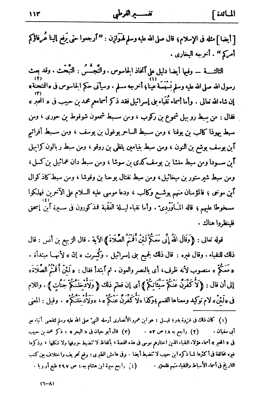 ] أَيْضًا [مِثْلُهُ فِي الْإِسْلَامِ، قَالَ صَلَّى اللَّهُ عَلَيْهِ وَسَلَّمَ لِهَوَازِنَ: (ارْجِعُوا حَتَّى يَرْفَعَ إِلَيْنَا عُرَفَاؤُكُمْ أَمْرَكُمْ). أَخْرَجَهُ الْبُخَارِيُّ. الثَّالِثَةُ- وَفِيهَا أَيْضًا دَلِيلٌ عَلَى اتِّخَاذِ الْجَاسُوسِ. وَالتَّجَسُّسُ: التَّبَحُّثُ. وَقَدْ بَعَثَ رَسُولُ اللَّهِ صَلَّى اللَّهُ عَلَيْهِ وَسَلَّمَ بَسْبَسَةَ عَيْنًا «١»، أَخْرَجَهُ مُسْلِمٌ. وَسَيَأْتِي حُكْمُ الْجَاسُوسِ فِي" الْمُمْتَحِنَةِ" «٢» إِنْ شَاءَ اللَّهُ تَعَالَى. وَأَمَّا أَسْمَاءُ نُقَبَاءِ بَنِي إِسْرَائِيلَ فَقَدْ ذَكَرَ أَسْمَاءَهُمْ مُحَمَّدُ بْنُ حَبِيبٍ فِي" الْمُحَبَّرِ" «٣» فَقَالَ: مِنْ سِبْطِ رُوبِيلَ شموعُ بْنُ ركوبَ، وَمِنْ سِبْطِ شَمْعُونَ شوقوطُ بْنُ حُورِيِّ، وَمِنْ سِبْطِ يَهُوذَا كَالِبُ بْنُ يُوقِنَا، وَمِنْ سِبْطِ السَّاحِرِ يوغولُ بن يوسف، ومن سبط أفراثيم ابن يُوسُفَ يُوشَعُ بْنُ النُّونِ، وَمِنْ سِبْطِ بِنْيَامِينَ يلظَى بْنُ روقو، وَمِنْ سِبْطِ ربالُونَ كرابيلُ ابن سودَا وَمِنْ سِبْطِ منشَا بْنِ يُوسُفَ كدي بْنُ سوشا، وَمِنْ سِبْطِ دَانَ عمائِيلُ بْنُ كسلَ، وَمِنْ سِبْطِ شيرَ ستورُ بْنُ مِيخَائِيلَ، وَمِنْ سِبْطِ نفتَالَ يُوحَنَّا بْنُ وقوشا، وَمِنْ سبط كاذكوال ابن موخى، فالمؤمنان مِنْهُمْ يُوشَعُ وَكَالِبُ، وَدَعَا مُوسَى عَلَيْهِ السَّلَامُ عَلَى الْآخَرِينَ فَهَلَكُوا مَسْخُوطًا عَلَيْهِمْ، قَالَهُ الْمَاوَرْدِيُّ. وَأَمَّا نُقَبَاءُ لَيْلَةِ الْعَقَبَةِ فَمَذْكُورُونَ فِي سِيرَةِ ابْنِ «٤» إِسْحَاقَ فَلْيُنْظَرُوا هُنَاكَ. قَوْلُهُ تَعَالَى: (وَقالَ اللَّهُ إِنِّي مَعَكُمْ لَئِنْ أَقَمْتُمُ الصَّلاةَ) الآية. قَالَ الرَّبِيعُ بْنُ أَنَسٍ: قَالَ ذَلِكَ لِلنُّقَبَاءِ. وَقَالَ غَيْرُهُ: قَالَ ذَلِكَ لِجَمِيعِ بَنِي إِسْرَائِيلَ. وكسرت" إن" لأنها مبتدأة." مَعَكُمْ" منصوب لِأَنَّهُ ظَرْفٌ، أَيْ بِالنَّصْرِ وَالْعَوْنِ. ثُمَّ ابْتَدَأَ فَقَالَ:" لَئِنْ أَقَمْتُمُ الصَّلاةَ" إِلَى أَنْ قَالَ" لَأُكَفِّرَنَّ عَنْكُمْ سَيِّئاتِكُمْ" أَيْ إِنْ فَعَلْتُمْ ذَلِكَ (وَلَأُدْخِلَنَّكُمْ جَنَّاتٍ). وَاللَّامُ فِي" لَئِنْ" لَامُ تَوْكِيدٍ وَمَعْنَاهَا الْقَسَمُ، وَكَذَا" لَأُكَفِّرَنَّ عَنْكُمْ"،" وَلَأُدْخِلَنَّكُمْ". وَقِيلَ: المعنى