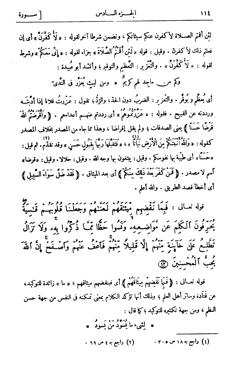لَئِنْ أَقَمْتُمُ الصَّلَاةَ لَأُكَفِّرَنَّ عَنْكُمْ سَيِّئَاتِكُمْ، وَتَضَمَّنَ شَرْطًا آخَرَ لِقَوْلِهِ:" لَأُكَفِّرَنَّ" أَيْ إِنْ فَعَلْتُمْ ذَلِكَ لَأُكَفِّرَنَّ. وَقِيلَ: قَوْلُهُ" لَئِنْ أَقَمْتُمُ الصَّلاةَ" جَزَاءً لِقَوْلِهِ:" إِنِّي مَعَكُمْ" وَشَرْطٌ لِقَوْلِهِ:" لَأُكَفِّرَنَّ" وَالتَّعْزِيرُ: التَّعْظِيمُ وَالتَّوْقِيرُ، وَأَنْشَدَ أَبُو عُبَيْدَةَ: