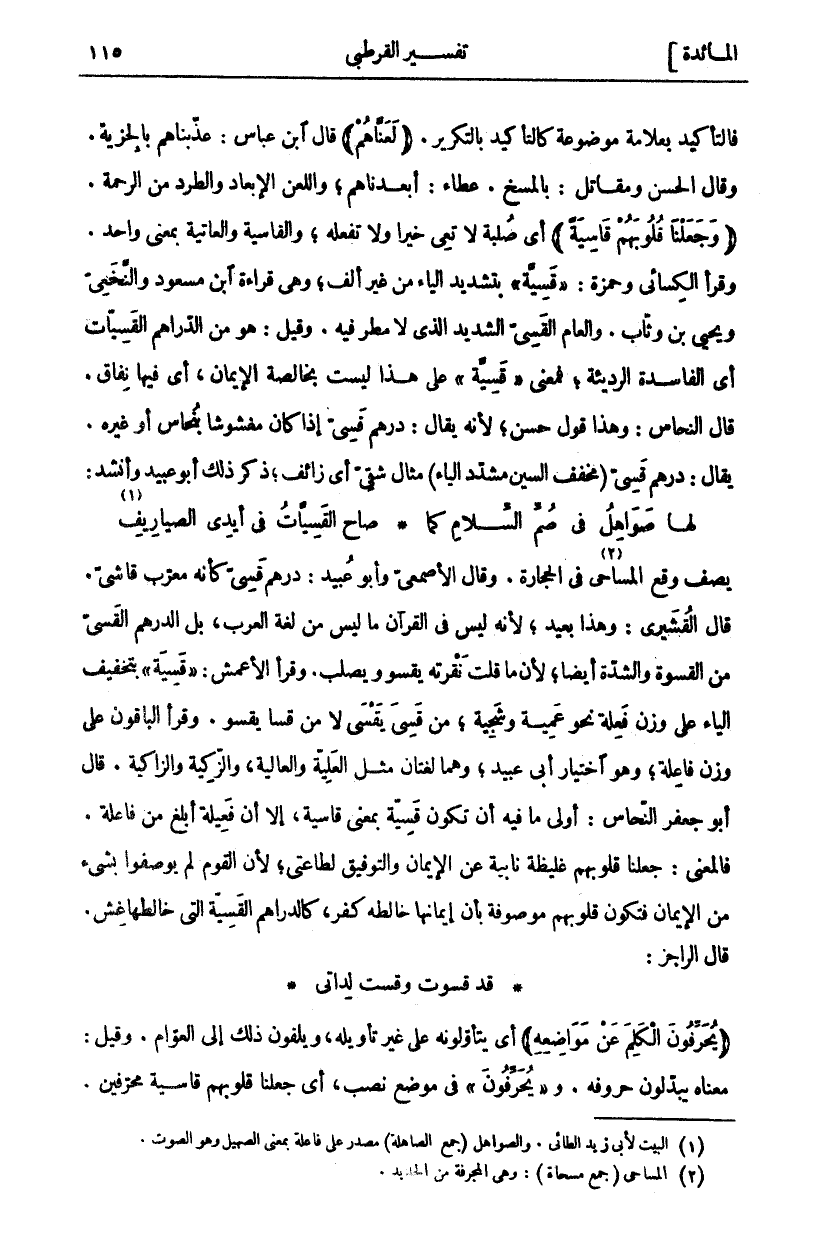 فَالتَّأْكِيدُ بِعَلَامَةٍ مَوْضُوعَةٍ كَالتَّأْكِيدِ بِالتَّكْرِيرِ. (لَعَنَّاهُمْ) قَالَ ابْنُ عَبَّاسٍ: عَذَّبْنَاهُمْ بِالْجِزْيَةِ. وَقَالَ الْحَسَنُ وَمُقَاتِلٌ: بِالْمَسْخِ. عَطَاءٌ: أَبْعَدْنَاهُمْ وَاللَّعْنُ الْإِبْعَادُ وَالطَّرْدُ مِنَ الرَّحْمَةِ. (وَجَعَلْنا قُلُوبَهُمْ قاسِيَةً) أَيْ صُلْبَةً لَا تَعِي خَيْرًا وَلَا تَفْعَلُهُ، وَالْقَاسِيَةُ وَالْعَاتِيَةُ بِمَعْنَى وَاحِدٍ. وَقَرَأَ الْكِسَائِيُّ وَحَمْزَةُ:" قَسِيَّةً" بِتَشْدِيدِ الْيَاءِ مِنْ غَيْرِ أَلِفٍ، وَهِيَ قِرَاءَةُ ابْنِ مَسْعُودٍ وَالنَّخَعِيِّ وَيَحْيَى بْنِ وَثَّابٍ. وَالْعَامُ الْقَسِيُّ الشَّدِيدُ الَّذِي لَا مَطَرَ فِيهِ. وَقِيلَ: هُوَ مِنَ الدَّرَاهِمِ الْقَسِيَّاتِ أَيِ الْفَاسِدَةِ الرَّدِيئَةِ، فَمَعْنَى" قَسِيَّةً" عَلَى هَذَا لَيْسَتْ بِخَالِصَةِ الْإِيمَانِ، أَيْ فِيهَا نِفَاقٌ. قَالَ النَّحَّاسُ: وَهَذَا قَوْلٌ حَسَنٌ، لِأَنَّهُ يُقَالُ: دِرْهَمٌ قَسِيٌّ إِذَا كَانَ مَغْشُوشًا بِنُحَاسٍ أَوْ غَيْرِهِ. يُقَالُ: دِرْهَمٌ قَسِيٌّ (مُخَفَّفُ السِّينِ مُشَدَّدُ الْيَاءِ) مِثَالُ شَقِيٍّ أَيْ زَائِفٍ، ذَكَرَ ذلك أبو عبيد وأنشد: