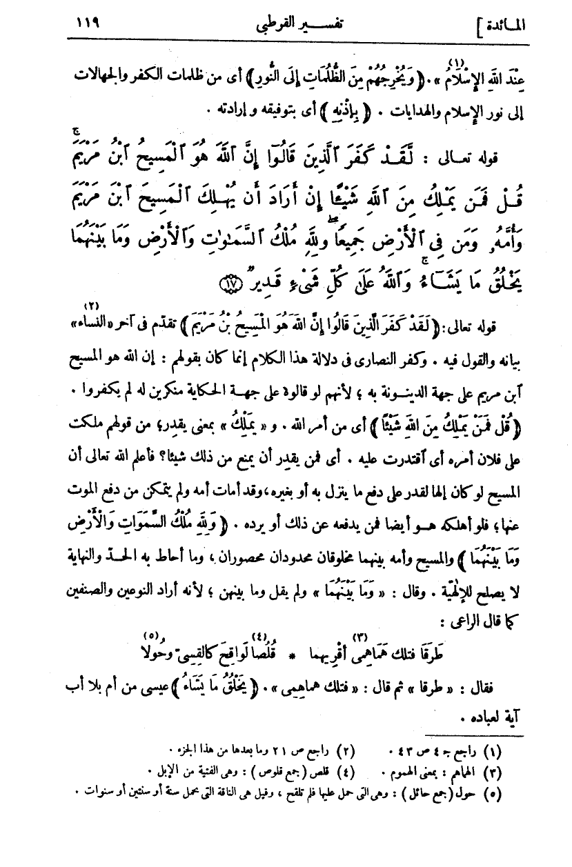 قَوْلُهُ تَعَالَى: (لَقَدْ كَفَرَ الَّذِينَ قالُوا إِنَّ اللَّهَ هُوَ الْمَسِيحُ ابْنُ مَرْيَمَ) تَقَدَّمَ فِي آخِرِ" النِّسَاءِ" «٢» بَيَانُهُ وَالْقَوْلُ فِيهِ. وَكُفْرُ النَّصَارَى فِي دَلَالَةِ هَذَا الْكَلَامِ إِنَّمَا كَانَ بِقَوْلِهِمْ: إِنَّ اللَّهَ هُوَ الْمَسِيحُ ابْنُ مَرْيَمَ عَلَى جِهَةِ الدَّيْنُونَةِ بِهِ، لِأَنَّهُمْ لَوْ قَالُوهُ عَلَى جِهَةِ الْحِكَايَةِ مُنْكِرِينَ لَهُ لَمْ يَكْفُرُوا. (قُلْ فَمَنْ يَمْلِكُ مِنَ اللَّهِ شَيْئاً) أَيْ مِنْ أَمْرِ اللَّهِ. وَ" يَمْلِكُ" بِمَعْنَى يَقْدِرُ، مِنْ قَوْلِهِمْ مَلَكْتُ عَلَى فُلَانٍ أَمْرَهُ أَيِ اقْتَدَرْتُ عَلَيْهِ. أَيْ فَمَنْ يَقْدِرُ أَنْ يَمْنَعَ مِنْ ذَلِكَ شَيْئًا؟ فَأَعْلَمَ اللَّهُ تَعَالَى أَنَّ الْمَسِيحَ لَوْ كَانَ إِلَهًا لَقَدَرَ عَلَى دَفْعِ مَا يَنْزِلُ بِهِ أَوْ بِغَيْرِهِ، وَقَدْ أَمَاتَ أُمَّهُ وَلَمْ يَتَمَكَّنْ مِنْ دَفْعِ الْمَوْتِ عَنْهَا، فَلَوْ أَهْلَكَهُ هُوَ أَيْضًا فَمَنْ يَدْفَعُهُ عَنْ ذَلِكَ أَوْ يَرُدُّهُ. (وَلِلَّهِ مُلْكُ السَّماواتِ وَالْأَرْضِ وَما بَيْنَهُما) وَالْمَسِيحُ وَأُمُّهُ بَيْنَهُمَا مَخْلُوقَانِ مَحْدُودَانِ مَحْصُورَانِ، وَمَا أَحَاطَ بِهِ الْحَدُّ وَالنِّهَايَةُ لَا يَصْلُحُ لِلْإِلَهِيَّةِ. وَقَالَ" وَما بَيْنَهُما" وَلَمْ يَقُلْ وَمَا بَيْنَهُنَّ، لِأَنَّهُ أَرَادَ النَّوْعَيْنِ وَالصِّنْفَيْنِ كَمَا قَالَ الرَّاعِي: