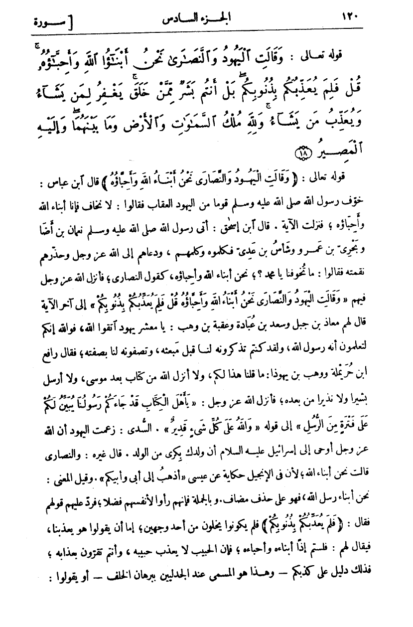 " إِلَى آخِرِ الْآيَةِ. قَالَ لَهُمْ مُعَاذُ بْنُ جَبَلٍ وَسَعْدُ بْنُ عُبَادَةَ وَعُقْبَةُ بْنُ وَهْبٍ: يَا مَعْشَرَ يَهُودٍ اتَّقُوا اللَّهَ، فَوَاللَّهِ إِنَّكُمْ لَتَعْلَمُونَ أَنَّهُ رَسُولُ اللَّهِ، وَلَقَدْ كُنْتُمْ تَذْكُرُونَهُ لَنَا قَبْلَ مبعثه، وتصفونه لنا بصفته، فقال رافع ابن حُرَيْمِلَةَ وَوَهْبُ بْنُ يَهُوذَا: مَا قُلْنَا هَذَا لَكُمْ، وَلَا أَنْزَلَ اللَّهُ مِنْ كِتَابٍ بَعْدَ مُوسَى، وَلَا أَرْسَلَ بَشِيرًا وَلَا نَذِيرًا مِنْ بَعْدِهِ، فَأَنْزَلَ اللَّهُ عَزَّ وَجَلَّ:" يَا أَهْلَ الْكِتابِ قَدْ جاءَكُمْ رَسُولُنا يُبَيِّنُ لَكُمْ عَلى فَتْرَةٍ مِنَ الرُّسُلِ" إِلَى قَوْلِهِ:" وَاللَّهُ عَلى كُلِّ شَيْءٍ قَدِيرٌ". السُّدِّيُّ: زَعَمَتِ الْيَهُودُ أَنَّ اللَّهَ عَزَّ وَجَلَّ أَوْحَى إِلَى إِسْرَائِيلَ عَلَيْهِ السَّلَامُ أَنَّ وَلَدَكَ بِكْرِيٌّ مِنَ الْوَلَدِ. قَالَ غَيْرُهُ: وَالنَّصَارَى قَالَتْ نَحْنُ أَبْنَاءُ اللَّهِ، لِأَنَّ فِي الْإِنْجِيلِ حِكَايَةً عَنْ عِيسَى" أَذْهَبُ إِلَى أَبِي وَأَبِيكُمْ". وَقِيلَ: الْمَعْنَى: نَحْنُ أَبْنَاءُ رُسُلِ اللَّهِ، فَهُوَ عَلَى حَذْفٍ مُضَافٍ. وَبِالْجُمْلَةِ. فَإِنَّهُمْ رَأَوْا لِأَنْفُسِهِمْ فَضْلًا، فَرَدَّ عَلَيْهِمْ قَوْلُهُمْ فَقَالَ (فَلِمَ يُعَذِّبُكُمْ بِذُنُوبِكُمْ) فَلَمْ يَكُونُوا يَخْلُونَ مِنْ أَحَدِ وَجْهَيْنِ، إِمَّا أَنْ يَقُولُوا هُوَ يُعَذِّبُنَا، فَيُقَالُ لَهُمْ: فَلَسْتُمْ إِذًا أَبْنَاءَهُ وَأَحِبَّاءَهُ، فَإِنَّ الْحَبِيبَ لَا يُعَذِّبُ حَبِيبَهُ، وَأَنْتُمْ تُقِرُّونَ بِعَذَابِهِ، فَذَلِكَ دَلِيلٌ عَلَى كَذِبِكُمْ- وَهَذَا هُوَ الْمُسَمَّى عِنْدَ الْجَدَلِيِّينَ بِبُرْهَانِ الْخُلْفِ- أَوْ يَقُولُوا