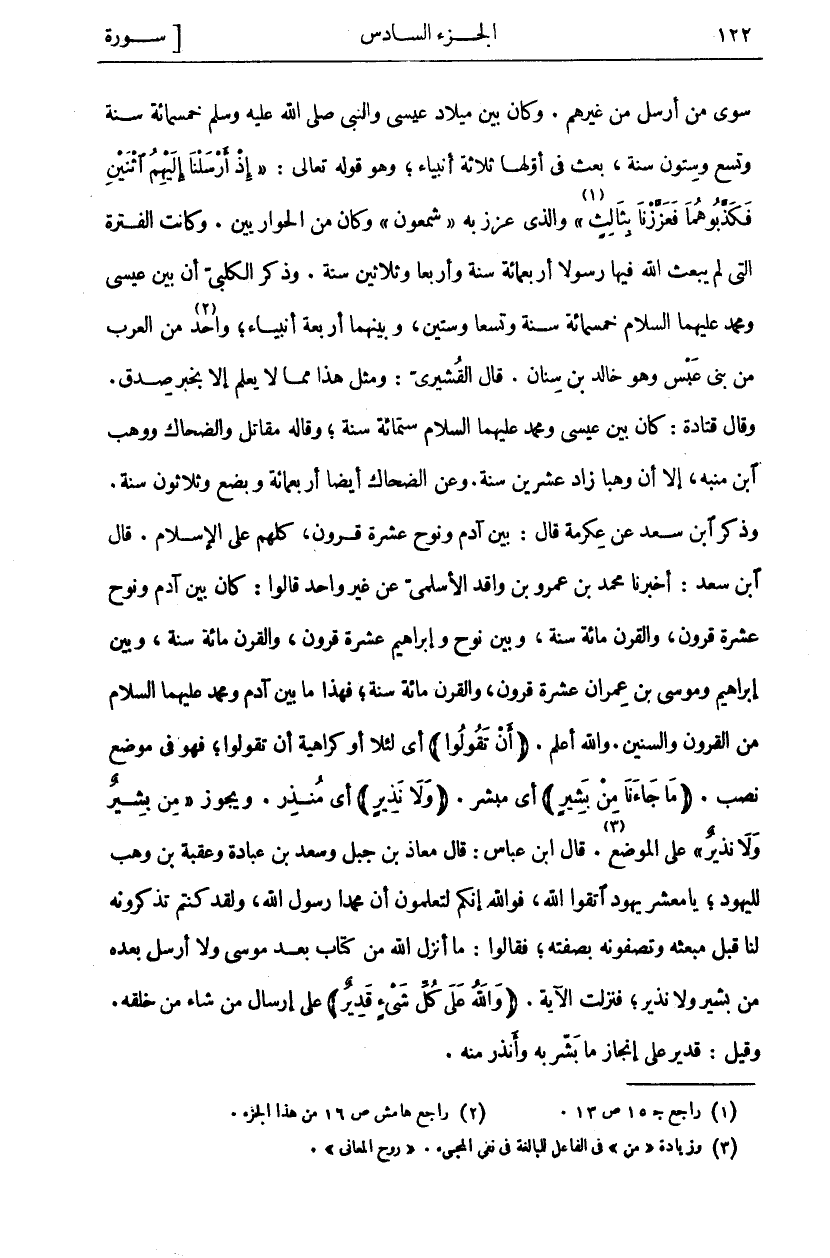 سِوَى مَنْ أُرْسِلَ مِنْ غَيْرِهِمْ. وَكَانَ بَيْنَ مِيلَادِ عِيسَى وَالنَّبِيِّ صَلَّى اللَّهُ عَلَيْهِ وَسَلَّمَ خَمْسُمِائَةِ سَنَةٍ وَتِسْعٌ وَسِتُّونَ سَنَةً، بُعِثَ فِي أَوَّلِهَا ثَلَاثَةُ أَنْبِيَاءَ، وَهُوَ قَوْلُهُ تَعَالَى:" إِذْ أَرْسَلْنا إِلَيْهِمُ اثْنَيْنِ فَكَذَّبُوهُما فَعَزَّزْنا بِثالِثٍ" «١» [يس: ١٤] وَالَّذِي عُزِّزَ بِهِ" شَمْعُونُ" وَكَانَ مِنَ الْحَوَارِيِّينَ. وَكَانَتِ الْفَتْرَةُ الَّتِي لَمْ يَبْعَثِ اللَّهُ فِيهَا رَسُولًا أَرْبَعَمِائَةِ سَنَةٍ وَأَرْبَعًا وَثَلَاثِينَ سَنَةً. وَذَكَرَ الْكَلْبِيُّ أَنَّ بَيْنَ عِيسَى وَمُحَمَّدٍ عَلَيْهِمَا السَّلَامُ خمسمائة سنة وتسعا وستين، وَبَيْنَهُمَا أَرْبَعَةُ أَنْبِيَاءَ، وَاحِدٌ «٢» مِنَ الْعَرَبِ مِنْ بَنِي عَبْسٍ وَهُوَ خَالِدُ بْنُ سِنَانَ. قَالَ القشيري: ومثل هذا مما لم لَا يُعْلَمُ إِلَّا بِخَبَرِ صِدْقٍ. وَقَالَ قَتَادَةُ: كَانَ بَيْنَ عِيسَى وَمُحَمَّدٍ عَلَيْهِمَا السَّلَامُ سِتُّمِائَةِ سنة، وقاله مقاتل والضحاك ووهب ابن مُنَبِّهٍ، إِلَّا أَنَّ وَهْبًا زَادَ عِشْرِينَ سَنَةً. وَعَنِ الضَّحَّاكِ أَيْضًا أَرْبَعُمِائَةٍ وَبِضْعٌ وَثَلَاثُونَ سَنَةً. وَذَكَرَ ابْنُ سَعْدٍ عَنْ عِكْرِمَةَ قَالَ: بَيْنَ آدَمَ وَنُوحٍ عَشَرَةُ قُرُونٍ، كُلُّهُمْ عَلَى الْإِسْلَامِ. قَالَ ابْنُ سَعْدٍ: أَخْبَرَنَا مُحَمَّدُ بْنُ عَمْرِو بْنِ وَاقِدٍ الْأَسْلَمِيُّ عَنْ غَيْرِ وَاحِدٍ قَالُوا: كَانَ بَيْنَ آدَمَ وَنُوحٍ عَشَرَةُ قُرُونٍ، وَالْقَرْنُ مِائَةُ سَنَةٍ، وَبَيْنَ نُوحٍ وَإِبْرَاهِيمَ عَشَرَةُ قُرُونٍ، وَالْقَرْنُ مِائَةُ سَنَةٍ، وَبَيْنَ إِبْرَاهِيمَ وَمُوسَى بْنِ عِمْرَانَ عَشَرَةُ قُرُونٍ، وَالْقَرْنُ مِائَةُ سَنَةٍ، فَهَذَا مَا بَيْنَ آدَمَ وَمُحَمَّدٍ عَلَيْهِمَا السَّلَامُ مِنَ الْقُرُونِ وَالسِّنِينَ. وَاللَّهُ أَعْلَمُ. (أَنْ تَقُولُوا) أَيْ لِئَلَّا أَوْ كَرَاهِيَةَ أَنْ تَقُولُوا، فَهُوَ فِي مَوْضِعِ نَصْبٍ." مَا جاءَنا مِنْ بَشِيرٍ" أَيْ مُبَشِّرٍ." وَلا نَذِيرٍ" أَيْ مُنْذِرٍ. وَيَجُوزُ" مِنْ بَشِيرٍ وَلا نَذِيرٍ" عَلَى الْمَوْضِعِ «٣». قَالَ ابْنُ عَبَّاسٍ: قَالَ مُعَاذُ بْنُ جَبَلٍ وَسَعْدُ بْنُ عُبَادَةَ وَعُقْبَةُ بْنُ وَهْبٍ لِلْيَهُودِ، يَا مَعْشَرَ يَهُودٍ اتَّقُوا اللَّهَ، فَوَاللَّهِ إِنَّكُمْ لَتَعْلَمُونَ أَنَّ مُحَمَّدًا رَسُولُ اللَّهِ، وَلَقَدْ كُنْتُمْ تَذْكُرُونَهُ لَنَا قَبْلَ مَبْعَثِهِ وَتَصِفُونَهُ بِصِفَتِهِ، فَقَالُوا: مَا أَنْزَلَ اللَّهُ مِنْ كِتَابٍ بَعْدَ مُوسَى وَلَا أَرْسَلَ بَعْدَهُ مِنْ بَشِيرٍ وَلَا نَذِيرٍ، فَنَزَلَتِ الْآيَةُ. (وَاللَّهُ عَلى كُلِّ شَيْءٍ قَدِيرٌ) عَلَى إِرْسَالِ مَنْ شَاءَ مِنْ خَلْقِهِ. وَقِيلَ: قَدِيرٌ عَلَى إنجاز ما بشر به وأنذر منه.