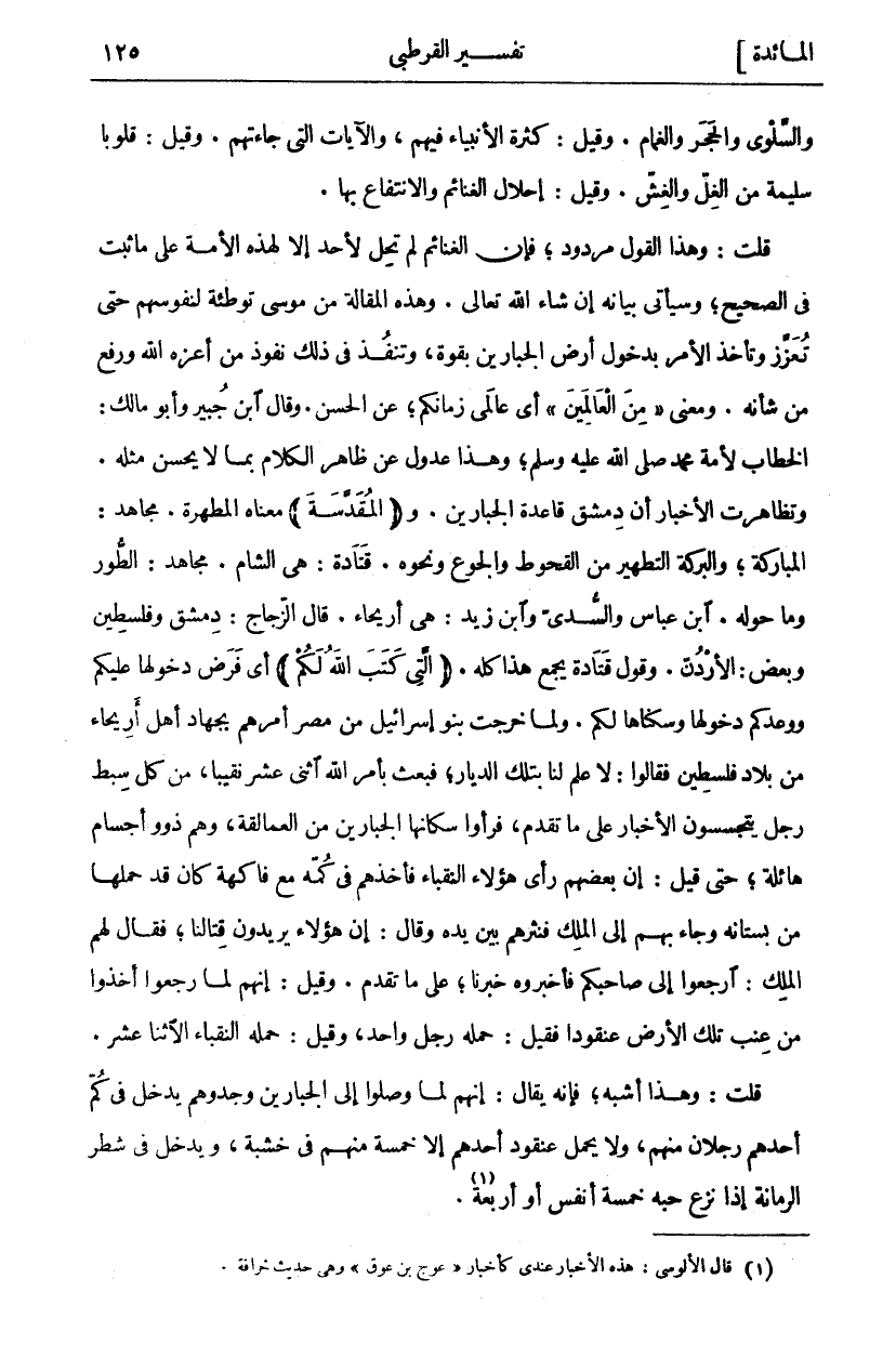 وَالسَّلْوَى وَالْحَجَرُ وَالْغَمَامُ. وَقِيلَ: كَثْرَةُ الْأَنْبِيَاءِ فِيهِمْ، وَالْآيَاتِ الَّتِي جَاءَتْهُمْ. وَقِيلَ: قُلُوبًا سَلِيمَةً مِنَ الْغِلِّ وَالْغِشِّ. وَقِيلَ: إِحْلَالُ الْغَنَائِمِ وَالِانْتِفَاعُ بِهَا. قُلْتُ: وَهَذَا الْقَوْلُ مَرْدُودٌ، فَإِنَّ الْغَنَائِمَ لَمْ تَحِلْ لِأَحَدٍ إِلَّا لِهَذِهِ الْأُمَّةِ عَلَى مَا ثَبَتَ فِي الصَّحِيحِ، وَسَيَأْتِي بَيَانُهُ إِنْ شَاءَ اللَّهُ تَعَالَى. وَهَذِهِ الْمَقَالَةُ مِنْ مُوسَى تَوْطِئَةٌ لِنُفُوسِهِمْ حَتَّى تُعَزَّزَ وَتَأْخُذَ الْأَمْرَ بِدُخُولِ أَرْضِ الْجَبَّارِينَ بِقُوَّةٍ، وَتَنْفُذَ فِي ذَلِكَ نُفُوذَ مَنْ أَعَزَّهُ اللَّهُ وَرَفَعَ مِنْ شَأْنِهِ. وَمَعْنَى" مِنَ الْعالَمِينَ" أَيْ عَالَمِي زَمَانِكُمْ، عَنِ الْحَسَنِ. وَقَالَ ابْنُ جُبَيْرٍ وَأَبُو مَالِكٍ: الْخِطَابُ لِأُمَّةِ مُحَمَّدٍ صَلَّى اللَّهُ عَلَيْهِ وَسَلَّمَ، وَهَذَا عُدُولٌ عَنْ ظَاهِرِ الْكَلَامِ بِمَا لَا يَحْسُنُ مِثْلُهُ. وَتَظَاهَرَتِ الاخبار أن دمشق قاعدة الجبارين. و" الْمُقَدَّسَةَ" مَعْنَاهُ الْمُطَهَّرَةُ. مُجَاهِدٌ: الْمُبَارَكَةُ، وَالْبَرَكَةُ التَّطْهِيرُ مِنَ الْقُحُوطِ وَالْجُوعِ وَنَحْوِهِ. قَتَادَةُ: هِيَ الشَّامُ. مُجَاهِدٌ: الطُّورُ وَمَا حَوْلَهُ. ابْنُ عَبَّاسٍ وَالسُّدِّيُّ وَابْنُ زَيْدٍ: هِيَ أَرِيحَاءُ. قَالَ الزَّجَّاجُ: دِمَشْقُ وَفِلَسْطِينُ وَبَعْضُ: الْأُرْدُنِ. وَقَوْلُ قَتَادَةَ يَجْمَعُ هَذَا كُلَّهُ. (الَّتِي كَتَبَ اللَّهُ لَكُمْ) أَيْ فَرَضَ دُخُولَهَا عَلَيْكُمْ وَوَعَدَكُمْ دُخُولَهَا وَسُكْنَاهَا لَكُمْ. وَلَمَّا خَرَجَتْ بَنُو إِسْرَائِيلَ مِنْ مِصْرَ أَمَرَهُمْ بِجِهَادِ أَهْلِ أَرِيحَاءَ مِنْ بِلَادِ فِلَسْطِينَ فَقَالُوا: لَا عِلْمَ لَنَا بِتِلْكَ الدِّيَارِ، فَبَعَثَ بِأَمْرِ اللَّهِ اثْنَيْ عَشَرَ نَقِيبًا، مِنْ كُلِّ سِبْطٍ رَجُلٌ يَتَجَسَّسُونَ الْأَخْبَارَ عَلَى مَا تَقَدَّمَ، فَرَأَوْا سُكَّانَهَا الْجَبَّارِينَ مِنَ الْعَمَالِقَةِ، وَهُمْ ذَوُو أَجْسَامٍ هَائِلَةٍ، حَتَّى قِيلَ: إِنَّ بَعْضَهُمْ رَأَى هَؤُلَاءِ النُّقَبَاءَ فَأَخَذَهُمْ فِي كُمِّهِ مَعَ فَاكِهَةٍ كَانَ قَدْ حَمَلَهَا مِنْ بُسْتَانِهِ وَجَاءَ بِهِمْ إِلَى الْمَلِكِ فَنَثَرَهُمْ بَيْنَ يَدِهِ وَقَالَ: إِنَّ هَؤُلَاءِ يُرِيدُونَ قِتَالَنَا، فَقَالَ لَهُمُ الْمَلِكُ: ارْجِعُوا إِلَى صَاحِبِكُمْ فَأَخْبِرُوهُ خَبَرَنَا، عَلَى مَا تَقَدَّمَ. وَقِيلَ: إِنَّهُمْ لَمَّا رَجَعُوا أَخَذُوا مِنْ عِنَبِ تِلْكَ الْأَرْضَ عُنْقُودًا فَقِيلَ: حَمَلَهُ رَجُلٌ وَاحِدٌ، وَقِيلَ: حَمَلَهُ النُّقَبَاءُ الِاثْنَا عَشَرَ. قُلْتُ: وَهَذَا أَشْبَهُ، فَإِنَّهُ يُقَالُ: إِنَّهُمْ لَمَّا وَصَلُوا إِلَى الْجَبَّارِينَ وَجَدُوهُمْ يَدْخُلُ فِي كُمِّ أَحَدِهِمْ رَجُلَانِ مِنْهُمْ، وَلَا يَحْمِلُ عنقود أحدهم إلا خمسة منهم في خشية، وَيَدْخُلُ فِي شَطْرِ الرُّمَّانَةِ إِذَا نُزِعَ حَبُّهُ خمسة أنفس أو أربعة «١».