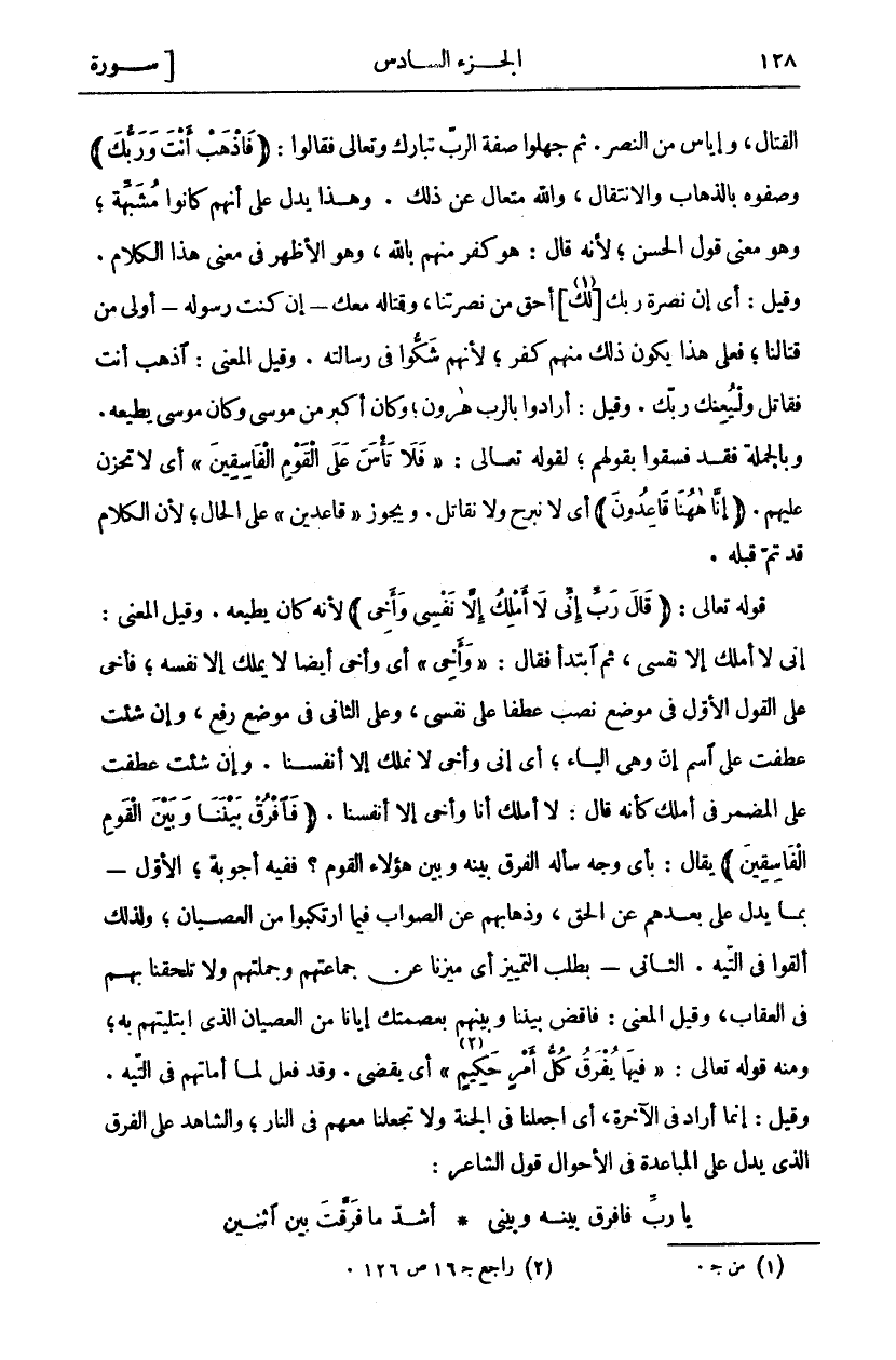الْقِتَالِ، وَإِيَاسٌ مِنَ النَّصْرِ. ثُمَّ جَهِلُوا صِفَةَ الرَّبِّ تَبَارَكَ وَتَعَالَى فَقَالُوا" فَاذْهَبْ أَنْتَ وَرَبُّكَ) " وَصَفُوهُ بِالذَّهَابِ وَالِانْتِقَالِ، وَاللَّهُ مُتَعَالٍ عَنْ ذَلِكَ. وَهَذَا يَدُلُّ عَلَى أَنَّهُمْ كَانُوا مُشَبِّهَةً، وَهُوَ مَعْنَى قَوْلِ الْحَسَنِ، لِأَنَّهُ قَالَ: هُوَ كُفْرٌ مِنْهُمْ بِاللَّهِ، وَهُوَ الْأَظْهَرُ فِي مَعْنَى الْكَلَامِ. وَقِيلَ: أَيْ أَنَّ نُصْرَةَ رَبِّكَ [لَكَ] «١» أَحَقُّ مِنْ نُصْرَتِنَا، وَقِتَالَهُ مَعَكَ- إِنْ كُنْتَ رَسُولَهُ- أَوْلَى مِنْ قِتَالِنَا، فَعَلَى هَذَا يَكُونُ ذَلِكَ مِنْهُمْ كُفْرٌ، لِأَنَّهُمْ شَكُّوا فِي رِسَالَتِهِ. وَقِيلَ الْمَعْنَى: اذْهَبْ أَنْتَ فَقَاتِلْ وَلْيُعِنْكَ رَبُّكَ. وَقِيلَ: أرادوا بالرب هرون، وَكَانَ أَكْبَرَ مِنْ مُوسَى وَكَانَ مُوسَى يُطِيعُهُ. وَبِالْجُمْلَةِ فَقَدْ فَسَقُوا بِقَوْلِهِمْ، لِقَوْلِهِ تَعَالَى:" فَلا تَأْسَ عَلَى الْقَوْمِ الْفاسِقِينَ" أَيْ لَا تَحْزَنْ عَلَيْهِمْ. (إِنَّا هاهُنا قاعِدُونَ) أَيْ لَا نَبْرَحُ وَلَا نُقَاتِلُ. وَيَجُوزُ" قَاعِدِينَ" عَلَى الْحَالِ، لِأَنَّ الْكَلَامَ قَدْ تَمَّ قَبْلَهُ. قَوْلُهُ تَعَالَى: (قالَ رَبِّ إِنِّي لَا أَمْلِكُ إِلَّا نَفْسِي وَأَخِي) لِأَنَّهُ كَانَ يُطِيعُهُ. وَقِيلَ الْمَعْنَى: إِنِّي لَا أَمْلِكُ إِلَّا نَفْسِي، ثُمَّ ابْتَدَأَ فَقَالَ:" وَأَخِي". أَيْ وَأَخِي أَيْضًا لَا يَمْلِكُ إِلَّا نَفْسَهُ، فَأَخِي عَلَى الْقَوْلِ الْأَوَّلِ فِي مَوْضِعِ نَصْبٍ عَطْفًا عَلَى نَفْسِي، وَعَلَى الثَّانِي فِي مَوْضِعِ رَفْعٍ، وَإِنْ شِئْتَ عَطَفْتَ عَلَى اسْمِ إِنَّ وَهِيَ الْيَاءُ، أَيْ إِنِّي وَأَخِي لَا نَمْلِكُ إِلَّا أَنْفُسَنَا. وَإِنْ شِئْتَ عَطَفْتَ عَلَى الْمُضْمَرِ فِي أَمْلِكُ كَأَنَّهُ قَالَ: لَا أَمْلِكُ أَنَا وَأَخِي إِلَّا أَنْفُسَنَا. (فَافْرُقْ بَيْنَنا وَبَيْنَ الْقَوْمِ الْفاسِقِينَ) يُقَالُ: بِأَيِ وَجْهٍ سَأَلَهُ الْفَرْقَ بَيْنَهُ وَبَيْنَ هَؤُلَاءِ الْقَوْمِ؟ فَفِيهِ أَجْوِبَةٌ، الْأَوَّلُ- بِمَا يَدُلُّ عَلَى بُعْدِهِمْ عَنِ الْحَقِّ، وَذَهَابِهِمْ عَنِ الصَّوَابِ فِيمَا ارْتَكَبُوا مِنَ الْعِصْيَانِ، وَلِذَلِكَ أُلْقُوا فِي التِّيهِ. الثَّانِي- بِطَلَبِ التَّمْيِيزِ أَيْ مَيِّزْنَا عَنْ جَمَاعَتِهِمْ وَجُمْلَتِهِمْ وَلَا تُلْحِقْنَا بِهِمْ فِي الْعِقَابِ، وَقِيلَ الْمَعْنَى: فَاقْضِ بَيْنَنَا وَبَيْنَهُمْ بِعِصْمَتِكَ إِيَّانَا مِنَ الْعِصْيَانِ الَّذِي ابْتَلَيْتَهُمْ بِهِ، وَمِنْهُ قول تعالى:" فِيها يُفْرَقُ كُلُّ أَمْرٍ حَكِيمٍ" «٢»] الدخان: ٤] أَيْ يُقْضَى. وَقَدْ فَعَلَ لَمَّا أَمَاتَهُمْ فِي التِّيهِ. وَقِيلَ: إِنَّمَا أَرَادَ فِي الْآخِرَةِ، أَيِ اجْعَلْنَا فِي الْجَنَّةِ وَلَا تَجْعَلْنَا مَعَهُمْ فِي النَّارِ، وَالشَّاهِدُ عَلَى الْفَرْقِ الَّذِي يَدُلُّ عَلَى الْمُبَاعَدَةِ فِي الْأَحْوَالِ قَوْلُ الشَّاعِرِ: