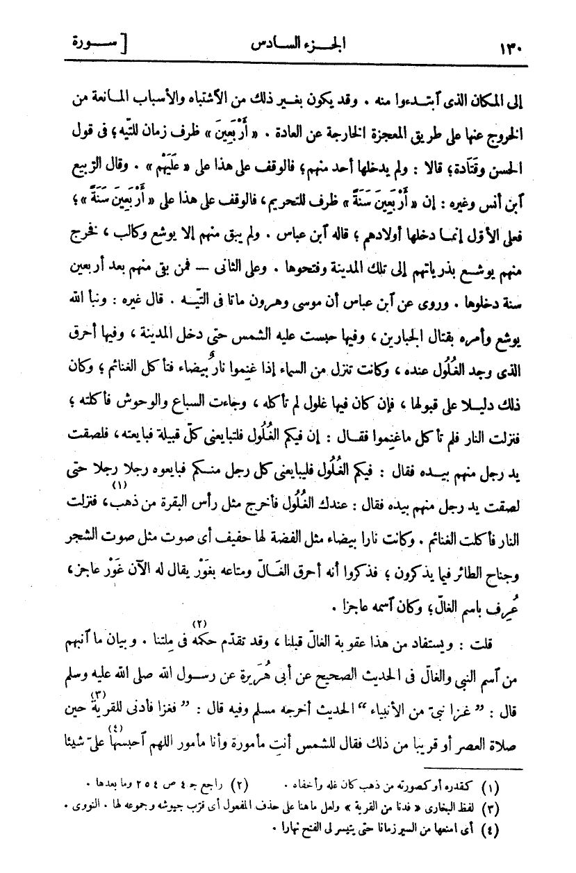 إِلَى الْمَكَانِ الَّذِي ابْتَدَءُوا مِنْهُ. وَقَدْ يَكُونُ بِغَيْرِ ذَلِكَ مِنِ الِاشْتِبَاهِ وَالْأَسْبَابِ الْمَانِعَةِ مِنَ الْخُرُوجِ عَنْهَا عَلَى طَرِيقِ الْمُعْجِزَةِ الْخَارِجَةِ عَنِ الْعَادَةِ." أَرْبَعِينَ" ظَرْفَ زَمَانٍ لِلتِّيهِ، فِي قَوْلِ الْحَسَنِ وَقَتَادَةَ، قَالَا: وَلَمْ يَدْخُلْهَا أَحَدٌ مِنْهُمْ، فَالْوَقْفُ عَلَى هَذَا عَلَى" عَلَيْهِمْ". وَقَالَ الرَّبِيعُ ابن أَنَسٍ وَغَيْرُهُ: إِنَّ" أَرْبَعِينَ سَنَةً" ظَرْفٌ لِلتَّحْرِيمِ، فَالْوَقْفُ عَلَى هَذَا عَلَى" أَرْبَعِينَ سَنَةً"، فَعَلَى الْأَوَّلِ إِنَّمَا دَخَلَهَا أَوْلَادُهُمْ، قَالَهُ ابْنُ عَبَّاسٍ. وَلَمْ يَبْقَ مِنْهُمْ إِلَّا يُوشَعُ وَكَالِبُ، فَخَرَجَ مِنْهُمْ يُوشَعُ بِذُرِّيَّاتِهِمْ إِلَى تِلْكَ الْمَدِينَةِ وَفَتَحُوهَا. وَعَلَى الثَّانِي- فَمَنْ بَقِيَ مِنْهُمْ بَعْدَ أَرْبَعِينَ سَنَةً دَخَلُوهَا. وَرُوِيَ عَنِ ابْنِ عَبَّاسٍ أَنَّ موسى وهرون مَاتَا فِي التِّيهِ. قَالَ غَيْرُهُ: وَنَبَّأَ اللَّهُ يُوشَعَ وَأَمَرَهُ بِقِتَالِ الْجَبَّارِينَ، وَفِيهَا حُبِسَتْ عَلَيْهِ الشَّمْسُ حَتَّى دَخَلَ الْمَدِينَةَ، وَفِيهَا أُحْرِقَ الَّذِي وُجِدَ الْغُلُولُ عِنْدَهُ، وَكَانَتْ تَنْزِلُ مِنَ السَّمَاءِ إِذَا غَنِمُوا نَارٌ بَيْضَاءُ فَتَأْكُلُ الْغَنَائِمَ، وَكَانَ ذَلِكَ دَلِيلًا عَلَى قَبُولِهَا، فَإِنْ كَانَ فِيهَا غُلُولٌ لَمْ تَأْكُلْهُ، وَجَاءَتِ السِّبَاعُ وَالْوُحُوشُ فَأَكَلَتْهُ، فَنَزَلَتِ النَّارُ فَلَمْ تَأْكُلْ مَا غَنِمُوا فَقَالَ: إِنَّ فِيكُمُ الْغُلُولَ فَلْتُبَايِعْنِي كُلُّ قَبِيلَةٍ فَبَايَعَتْهُ، فَلَصِقَتْ يَدُ رَجُلٍ مِنْهُمْ بِيَدِهِ فَقَالَ: فِيكُمُ الْغُلُولُ فَلْيُبَايِعْنِي كُلُّ رَجُلٍ مِنْكُمْ فَبَايَعُوهُ رَجُلًا رَجُلًا حَتَّى لَصِقَتْ يَدُ رَجُلٍ مِنْهُمْ بِيَدِهِ فقال: عند الْغُلُولُ فَأَخْرَجَ مِثْلَ رَأْسِ الْبَقَرَةِ مِنْ ذَهَبٍ «١»، فَنَزَلَتِ النَّارُ فَأَكَلَتِ الْغَنَائِمَ. وَكَانَتْ نَارًا بَيْضَاءَ مِثْلَ الْفِضَّةِ لَهَا حَفِيفٌ أَيْ صَوْتٌ مِثْلُ صَوْتِ الشَّجَرِ وَجَنَاحِ الطَّائِرِ فِيمَا يَذْكُرُونَ، فَذَكَرُوا أَنَّهُ أُحْرِقَ الْغَالُّ وَمَتَاعُهُ بِغَوْرٍ يُقَالُ لَهُ الآن غور عَاجِزٌ، عُرِفَ بِاسْمِ الْغَالِّ، وَكَانَ اسْمُهُ عَاجِزًا. قُلْتُ: وَيُسْتَفَادُ مِنْ هَذَا عُقُوبَةُ الْغَالِّ قَبْلَنَا، وَقَدْ تَقَدَّمَ حُكْمُهُ «٢» فِي مِلَّتِنَا. وَبَيَانُ مَا انْبَهَمَ مِنِ اسْمِ النَّبِيِّ وَالْغَالِّ فِي الْحَدِيثِ الصَّحِيحِ عَنْ أَبِي هُرَيْرَةَ عَنْ رَسُولِ اللَّهِ صَلَّى اللَّهُ عَلَيْهِ وَسَلَّمَ قَالَ: (غَزَا نَبِيٌّ مِنَ الْأَنْبِيَاءِ) الْحَدِيثُ أَخْرَجَهُ مُسْلِمٌ وَفِيهِ قَالَ: (فَغَزَا فَأَدْنَى لِلْقَرْيَةِ «٣» حِينَ صَلَاةِ الْعَصْرِ أَوْ قَرِيبًا مِنْ ذَلِكَ فَقَالَ لِلشَّمْسِ أَنْتِ مَأْمُورَةٌ وأنا مأمور اللهم أحبسها «٤» على شيئا