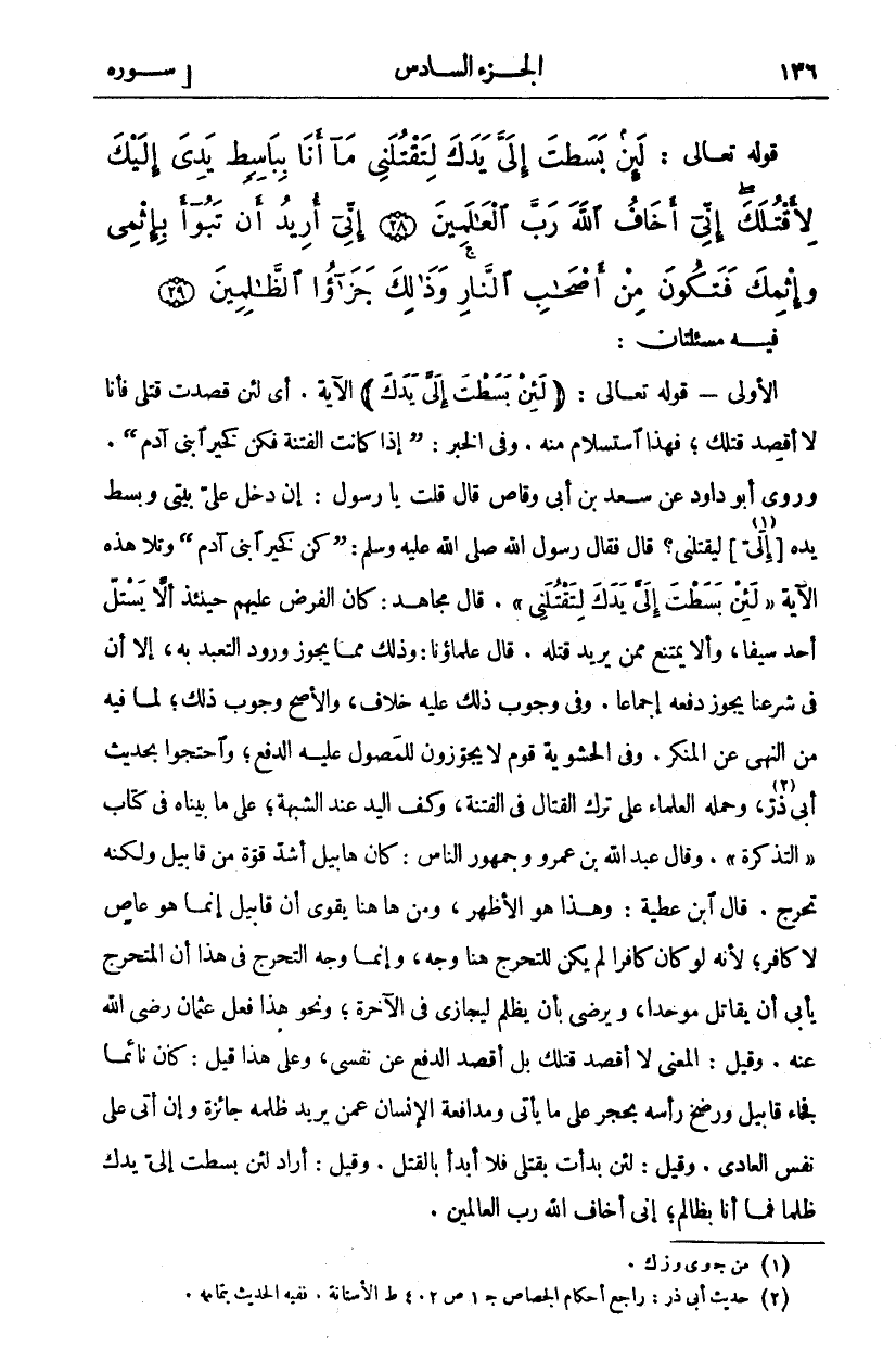 فِيهِ مَسْأَلَتَانِ: الْأُولَى- قَوْلُهُ تَعَالَى: (لَئِنْ بَسَطْتَ إِلَيَّ يَدَكَ) الْآيَةَ. أَيْ لَئِنْ قَصَدْتَ قَتْلِي فَأَنَا لَا أَقْصِدُ قَتْلَكَ، فَهَذَا اسْتِسْلَامٌ مِنْهُ. وَفِي الْخَبَرِ: (إِذَا كَانَتِ الْفِتْنَةُ فَكُنْ كَخَيْرِ ابْنَيْ آدَمَ). وَرَوَى أَبُو دَاوُدَ عَنْ سَعْدِ بْنِ أَبِي وَقَّاصٍ قَالَ قُلْتُ يَا رسول: إِنْ دَخَلَ عَلَيَّ بَيْتِي وَبَسَطَ يَدَهُ] إِلَيَّ [«١» لِيَقْتُلَنِي؟ قَالَ فَقَالَ رَسُولُ اللَّهِ صَلَّى اللَّهُ عَلَيْهِ وَسَلَّمَ: (كُنْ كَخَيْرِ ابْنَيْ آدَمَ) وَتَلَا هَذِهِ الْآيَةَ" لَئِنْ بَسَطْتَ إِلَيَّ يَدَكَ لِتَقْتُلَنِي". قَالَ مُجَاهِدٌ: كَانَ الْفَرْضُ عَلَيْهِمْ حِينَئِذٍ أَلَّا يَسْتَلَّ أَحَدٌ سَيْفًا، وَأَلَّا يَمْتَنِعَ مِمَّنْ يُرِيدُ قَتْلَهُ. قَالَ عُلَمَاؤُنَا: وَذَلِكَ مِمَّا يَجُوزُ وُرُودُ التَّعَبُّدِ بِهِ، إِلَّا أَنَّ فِي شَرْعِنَا يَجُوزُ دَفْعُهُ إِجْمَاعًا. وَفِي وُجُوبٍ ذَلِكَ عَلَيْهِ خِلَافٌ، وَالْأَصَحُّ وُجُوبُ ذَلِكَ، لِمَا فِيهِ مِنَ النَّهْيِ عَنِ الْمُنْكَرِ. وَفِي الْحَشْوِيَّةِ قَوْمٌ لَا يُجَوِّزُونَ لِلْمَصُولِ عَلَيْهِ الدَّفْعَ، وَاحْتَجُّوا بِحَدِيثِ أَبِي ذَرٍّ «٢»، وَحَمَلَهُ الْعُلَمَاءُ عَلَى تَرْكِ الْقِتَالِ فِي الْفِتْنَةِ، وَكَفِّ الْيَدِ عِنْدَ الشُّبْهَةِ، عَلَى مَا بَيَّنَّاهُ فِي كِتَابِ" التَّذْكِرَةِ". وَقَالَ عَبْدُ اللَّهِ بْنُ عَمْرٍو وَجُمْهُورُ النَّاسِ: كَانَ هَابِيلُ أَشَدَّ قُوَّةً مِنْ قَابِيلَ وَلَكِنَّهُ تَحَرَّجَ. قَالَ ابْنُ عَطِيَّةَ: وهذا هو الأظهر، ومن ها هنا يَقْوَى أَنَّ قَابِيلَ إِنَّمَا هُوَ عَاصٍ لَا كَافِرٌ، لِأَنَّهُ لَوْ كَانَ كَافِرًا لَمْ يَكُنْ لِلتَّحَرُّجِ هُنَا وَجْهٌ، وَإِنَّمَا وَجْهُ التَّحَرُّجِ فِي هَذَا أَنَّ الْمُتَحَرِّجَ يَأْبَى أَنْ يُقَاتِلَ مُوَحِّدًا، وَيَرْضَى بِأَنْ يُظْلَمَ لِيُجَازَى فِي الْآخِرَةِ، وَنَحْوَ هَذَا فَعَلَ عُثْمَانُ رَضِيَ اللَّهُ عَنْهُ. وَقِيلَ: الْمَعْنَى لَا أَقْصِدُ قَتْلَكَ بَلْ أَقْصِدُ الدَّفْعَ عَنْ نَفْسِي، وَعَلَى هَذَا قِيلَ: كَانَ نَائِمًا فَجَاءَ قَابِيلُ وَرَضَخَ رَأْسَهُ بِحَجَرٍ عَلَى مَا يَأْتِي وَمُدَافَعَةُ الْإِنْسَانِ عَمَّنْ يُرِيدُ ظُلْمَهُ جَائِزَةٌ وَإِنْ أَتَى عَلَى نَفْسِ الْعَادِي. وَقِيلَ: لَئِنْ بَدَأْتَ بِقَتْلِي فَلَا أَبْدَأُ بِالْقَتْلِ. وَقِيلَ: أَرَادَ لَئِنْ بَسَطْتَ إِلَيَّ يَدَكَ ظُلْمًا فَمَا أَنَا بظالم، إني أخاف الله رب العالمين.