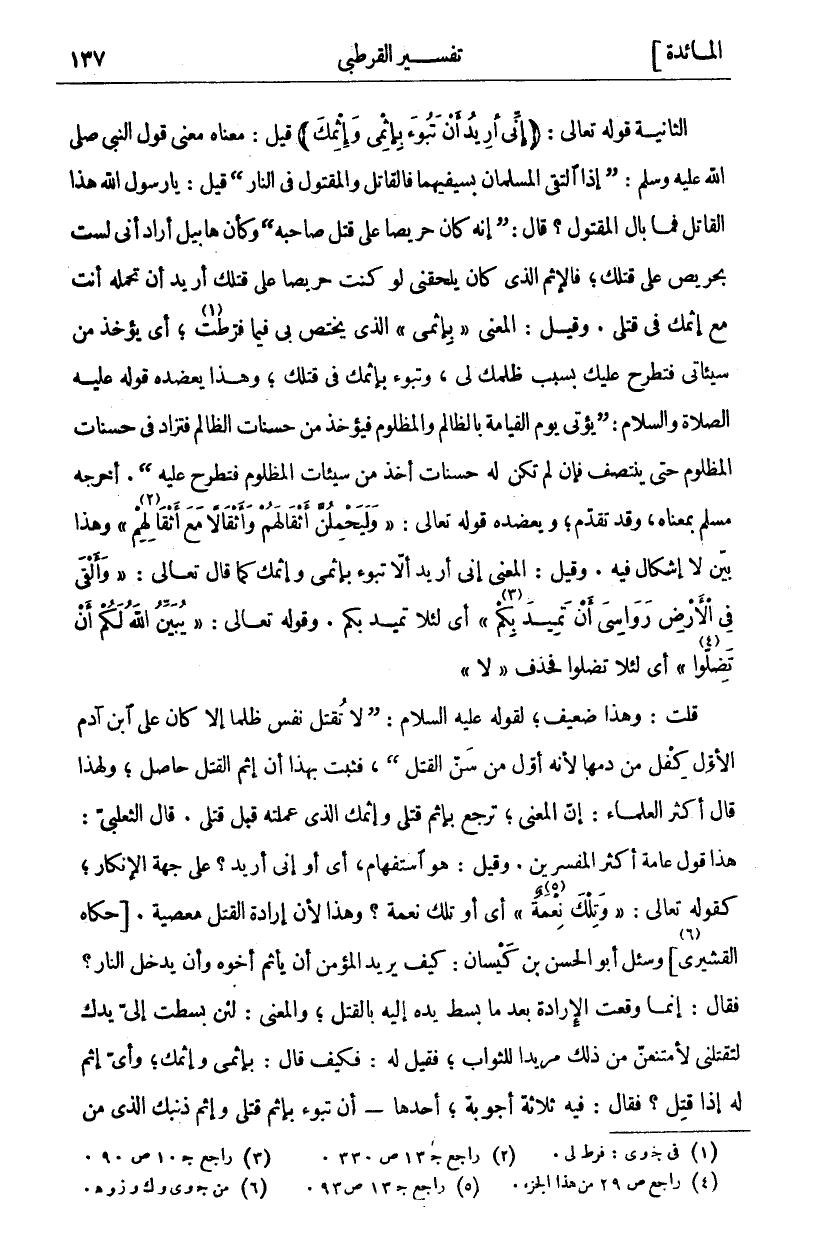 الثَّانِيَةُ قَوْلُهُ تَعَالَى: (إِنِّي أُرِيدُ أَنْ تَبُوءَ بِإِثْمِي وَإِثْمِكَ) قِيلَ: مَعْنَاهُ مَعْنَى قَوْلِ النَّبِيِّ صَلَّى اللَّهُ عَلَيْهِ وَسَلَّمَ: (إِذَا الْتَقَى الْمُسْلِمَانِ بِسَيْفَيْهِمَا فَالْقَاتِلُ وَالْمَقْتُولُ فِي النَّارِ) قِيلَ: يَا رَسُولَ اللَّهِ هَذَا الْقَاتِلُ فَمَا بَالُ الْمَقْتُولِ؟ قَالَ: (إِنَّهُ كَانَ حَرِيصًا عَلَى قَتْلِ صَاحِبِهِ) وَكَانَ هَابِيلُ أَرَادَ أَنِّي لَسْتُ بِحَرِيصٍ عَلَى قَتْلِكَ، فَالْإِثْمُ الَّذِي كَانَ يَلْحَقُنِي لَوْ كُنْتُ حَرِيصًا عَلَى قَتْلِكَ أُرِيدُ أَنْ تَحْمِلَهُ أَنْتَ مَعَ إِثْمِكَ فِي قَتْلِي. وَقِيلَ: الْمَعْنَى" بِإِثْمِي" الَّذِي يَخْتَصُّ بِي فِيمَا فَرَّطْتُ «١»، أَيْ يُؤْخَذُ مِنْ سَيِّئَاتِي فَتُطْرَحُ عَلَيْكَ بِسَبَبِ ظُلْمِكَ لِي، وَتَبُوءَ بِإِثْمِكَ فِي قَتْلِكَ، وَهَذَا يُعَضِّدُهُ قَوْلُهُ عَلَيْهِ الصَّلَاةُ وَالسَّلَامُ: (يُؤْتَى يَوْمَ الْقِيَامَةِ بِالظَّالِمِ وَالْمَظْلُومِ فَيُؤْخَذُ مِنْ حَسَنَاتِ الظَّالِمِ فَتُزَادُ فِي حَسَنَاتِ الْمَظْلُومِ حَتَّى يَنْتَصِفَ فَإِنْ لَمْ تَكُنْ لَهُ حَسَنَاتٌ أُخِذَ مِنْ سَيِّئَاتِ الْمَظْلُومِ فَتُطْرَحُ عَلَيْهِ (. أَخْرَجَهُ مُسْلِمٌ بِمَعْنَاهُ، وَقَدْ تَقَدَّمَ، وَيُعَضِّدُهُ قَوْلُهُ تَعَالَى:) وَلَيَحْمِلُنَّ أَثْقالَهُمْ وَأَثْقالًا مَعَ أَثْقالِهِمْ «٢» (. وَهَذَا بَيِّنٌ لَا إِشْكَالَ فِيهِ. وَقِيلَ: الْمَعْنَى إِنِّي أُرِيدُ أَلَّا تَبُوءَ بِإِثْمِي وَإِثْمِكَ كَمَا قَالَ تَعَالَى:" وَأَلْقى فِي الْأَرْضِ رَواسِيَ أَنْ تَمِيدَ بِكُمْ" «٣»] النحل: ١٥] أي لئلا تميد بكم. وقول تعالى:" يُبَيِّنُ اللَّهُ لَكُمْ أَنْ تَضِلُّوا" «٤»] النساء: ١٧٦] أَيْ لِئَلَّا تَضِلُّوا فَحَذَفَ" لَا". قُلْتُ: وَهَذَا ضَعِيفٌ، لِقَوْلِهِ عَلَيْهِ السَّلَامُ: (لَا تُقْتَلُ نَفْسٌ ظُلْمًا إِلَّا كَانَ عَلَى ابْنِ آدَمَ الْأَوَّلِ كِفْلٌ مِنْ دَمِهَا لِأَنَّهُ أَوَّلُ مَنْ سَنَّ الْقَتْلَ)، فَثَبَتَ بِهَذَا أَنَّ إِثْمَ الْقَتْلِ حَاصِلٌ، وَلِهَذَا قَالَ أَكْثَرُ الْعُلَمَاءِ: إِنَّ الْمَعْنَى، تَرْجِعُ بِإِثْمِ قَتْلِي وَإِثْمِكَ الَّذِي عَمِلْتُهُ قَبْلَ قَتْلِي. قَالَ الثَّعْلَبِيُّ: هَذَا قَوْلُ عَامَّةِ أَكْثَرِ الْمُفَسِّرِينَ. وَقِيلَ: هُوَ اسْتِفْهَامٌ، أَيْ أَوَ إِنِّي أُرِيدُ؟ عَلَى جِهَةِ الْإِنْكَارِ، كَقَوْلِهِ تَعَالَى:" وَتِلْكَ نِعْمَةٌ" «٥» أَيْ أَوَ تِلْكَ نِعْمَةٌ؟ وَهَذَا لِأَنَّ إِرَادَةَ القتل معصية.] حكاه القشيري [«٦» وسيل أَبُو الْحَسَنِ بْنُ كَيْسَانَ: كَيْفَ يُرِيدُ الْمُؤْمِنُ أَنْ يَأْثَمَ أَخُوهُ وَأَنْ يَدْخُلَ النَّارَ؟ فَقَالَ: إنما وقعت الإرادة بعد ما بَسَطَ يَدَهُ إِلَيْهِ بِالْقَتْلِ، وَالْمَعْنَى: لَئِنْ بَسَطْتَ إِلَيَّ يَدَكَ لِتَقْتُلَنِي لَأَمْتَنِعَنَّ مِنْ ذَلِكَ مُرِيدًا لِلثَّوَابِ، فَقِيلَ لَهُ: فَكَيْفَ قَالَ: بِإِثْمِي وَإِثْمِكَ، وَأَيُ إِثْمٍ لَهُ إِذَا قُتِلَ؟ فَقَالَ: فِيهِ ثَلَاثَةُ أَجْوِبَةٍ، أَحَدُهَا- أَنْ تَبُوءَ بِإِثْمِ قَتْلِي وإثم ذنبك الذي من