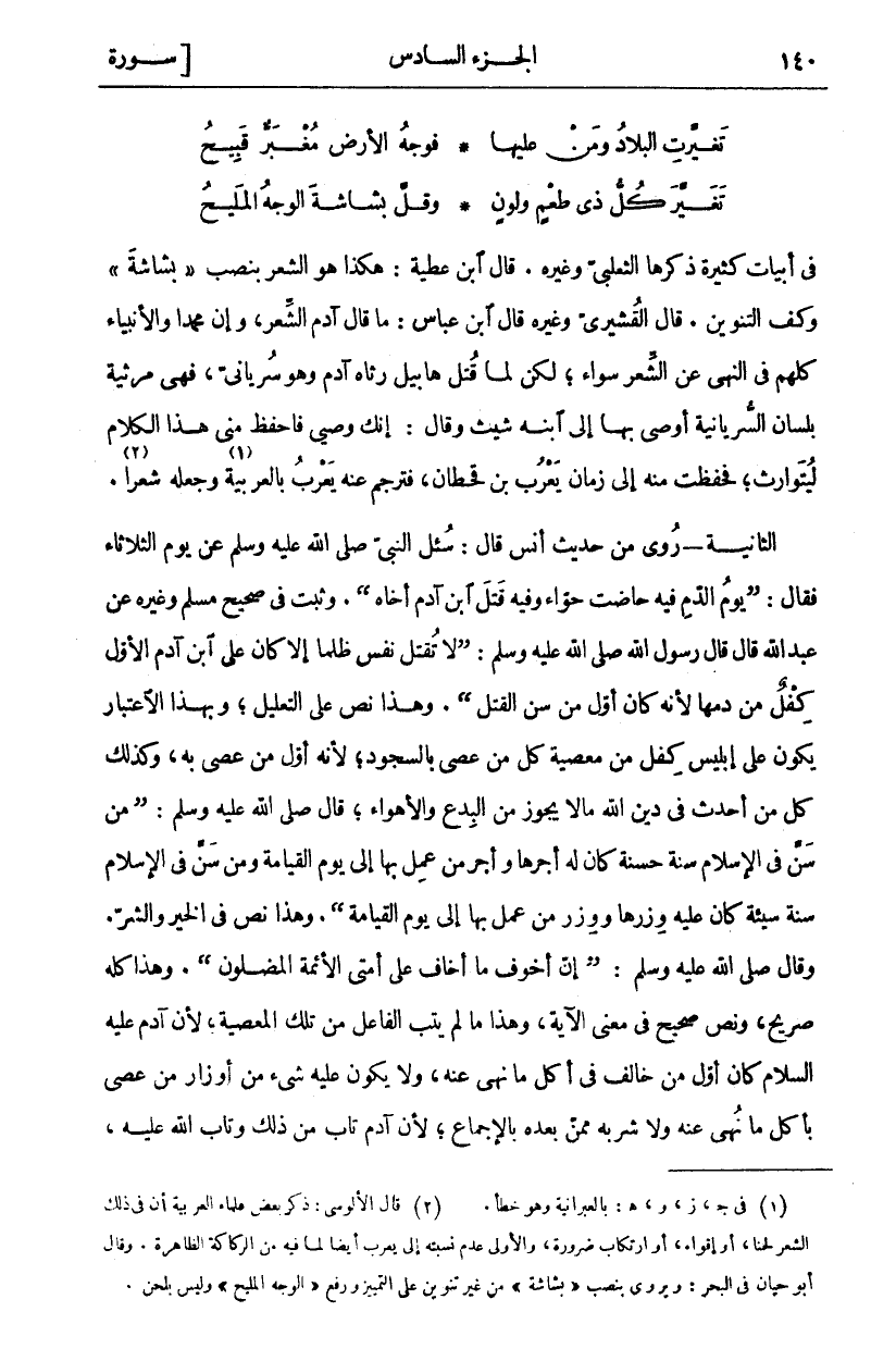 فِي أَبْيَاتٍ كَثِيرَةٍ ذَكَرَهَا الثَّعْلَبِيُّ وَغَيْرُهُ. قَالَ ابْنُ عَطِيَّةَ: هَكَذَا هُوَ الشِّعْرُ بِنَصْبِ" بَشَاشَةً" وَكَفِّ التَّنْوِينِ. قَالَ الْقُشَيْرِيُّ وَغَيْرُهُ قَالَ ابْنُ عَبَّاسٍ: مَا قَالَ آدَمُ الشِّعْرَ، وَإِنَّ مُحَمَّدًا وَالْأَنْبِيَاءَ كُلَّهُمْ فِي النَّهْيِ عَنِ الشِّعْرِ سَوَاءٌ، لَكِنْ لَمَّا قُتِلَ هَابِيلُ رَثَاهُ آدَمُ وَهُوَ سُرْيَانِيُّ، فَهِيَ مَرْثِيَّةٌ بِلِسَانِ السُّرْيَانِيَّةِ أَوْصَى بِهَا إِلَى ابْنِهِ شِيثَ وَقَالَ: إِنَّكَ وَصِيِّي فَاحْفَظْ مِنِّي هَذَا الْكَلَامَ لِيُتَوَارَثَ، فَحُفِظَتْ مِنْهُ إِلَى زَمَانِ يَعْرُبَ بْنِ قَحْطَانَ، فَتَرْجَمَ عَنْهُ يَعْرُبُ بِالْعَرَبِيَّةِ «١» وَجَعَلَهُ شِعْرًا «٢». الثَّانِيَةُ- رُوِيَ مِنْ حَدِيثِ أَنَسٍ قَالَ: سُئِلَ النَّبِيُّ صَلَّى اللَّهُ عَلَيْهِ وَسَلَّمَ عَنْ يَوْمِ الثُّلَاثَاءِ فَقَالَ: (يَوْمُ الدَّمِ فِيهِ حَاضَتْ حَوَّاءُ وَفِيهِ قَتَلَ ابْنُ آدَمَ أَخَاهُ). وَثَبَتَ فِي صَحِيحِ مُسْلِمٍ وَغَيْرِهِ عَنْ عَبْدِ اللَّهِ قَالَ قَالَ رَسُولُ اللَّهِ صَلَّى اللَّهُ عَلَيْهِ وَسَلَّمَ: (لا تُقْتَلُ نَفْسٌ ظُلْمًا إِلَّا كَانَ عَلَى ابْنِ آدَمَ الْأَوَّلِ كِفْلٌ مِنْ دَمِهَا لِأَنَّهُ كَانَ أَوَّلَ مَنْ سَنَّ الْقَتْلَ). وَهَذَا نَصٌّ عَلَى التَّعْلِيلِ، وَبِهَذَا الِاعْتِبَارِ يَكُونُ عَلَى إِبْلِيسَ كِفْلٌ مِنْ مَعْصِيَةِ كُلِّ مَنْ عَصَى بِالسُّجُودِ، لِأَنَّهُ أَوَّلُ مَنْ عَصَى بِهِ، وَكَذَلِكَ كُلُّ مَنْ أَحْدَثَ فِي دِينِ اللَّهِ مَا لَا يَجُوزُ مِنَ الْبِدَعِ وَالْأَهْوَاءِ، قَالَ صَلَّى اللَّهُ عَلَيْهِ وَسَلَّمَ: (مَنْ سَنَّ فِي الْإِسْلَامِ سُنَّةً حَسَنَةً كَانَ لَهُ أَجْرُهَا وَأَجْرُ مَنْ عَمِلَ بِهَا إِلَى يَوْمِ الْقِيَامَةِ وَمَنْ سَنَّ فِي الْإِسْلَامِ سُنَّةً سَيِّئَةً كَانَ عَلَيْهِ وِزْرُهَا وَوِزْرُ مَنْ عَمِلَ بِهَا إِلَى يَوْمِ الْقِيَامَةِ (. وَهَذَا نَصٌّ فِي الْخَيْرِ وَالشَّرِّ. وَقَالَ صَلَّى اللَّهُ عَلَيْهِ وَسَلَّمَ:) إِنَّ أَخْوَفَ مَا أَخَافُ عَلَى أُمَّتِي الْأَئِمَّةُ الْمُضِلُّونَ (. وَهَذَا كُلُّهُ صَرِيحٌ، وَنَصٌّ صَحِيحٌ فِي مَعْنَى الْآيَةِ، وَهَذَا مَا لَمْ يَتُبِ الْفَاعِلُ مِنْ تِلْكَ الْمَعْصِيَةِ، لِأَنَّ آدَمَ عَلَيْهِ السَّلَامُ كَانَ أَوَّلُ مَنْ خَالَفَ فِي أَكْلِ ما نهى عنه، ولا يكون عليه شي مِنْ أَوْزَارِ مَنْ عَصَى بِأَكْلِ مَا نُهِيَ عنه ولا شربه ممن بَعْدِهِ بِالْإِجْمَاعِ، لِأَنَّ آدَمَ تَابَ مِنْ ذَلِكَ وتاب الله عليه،