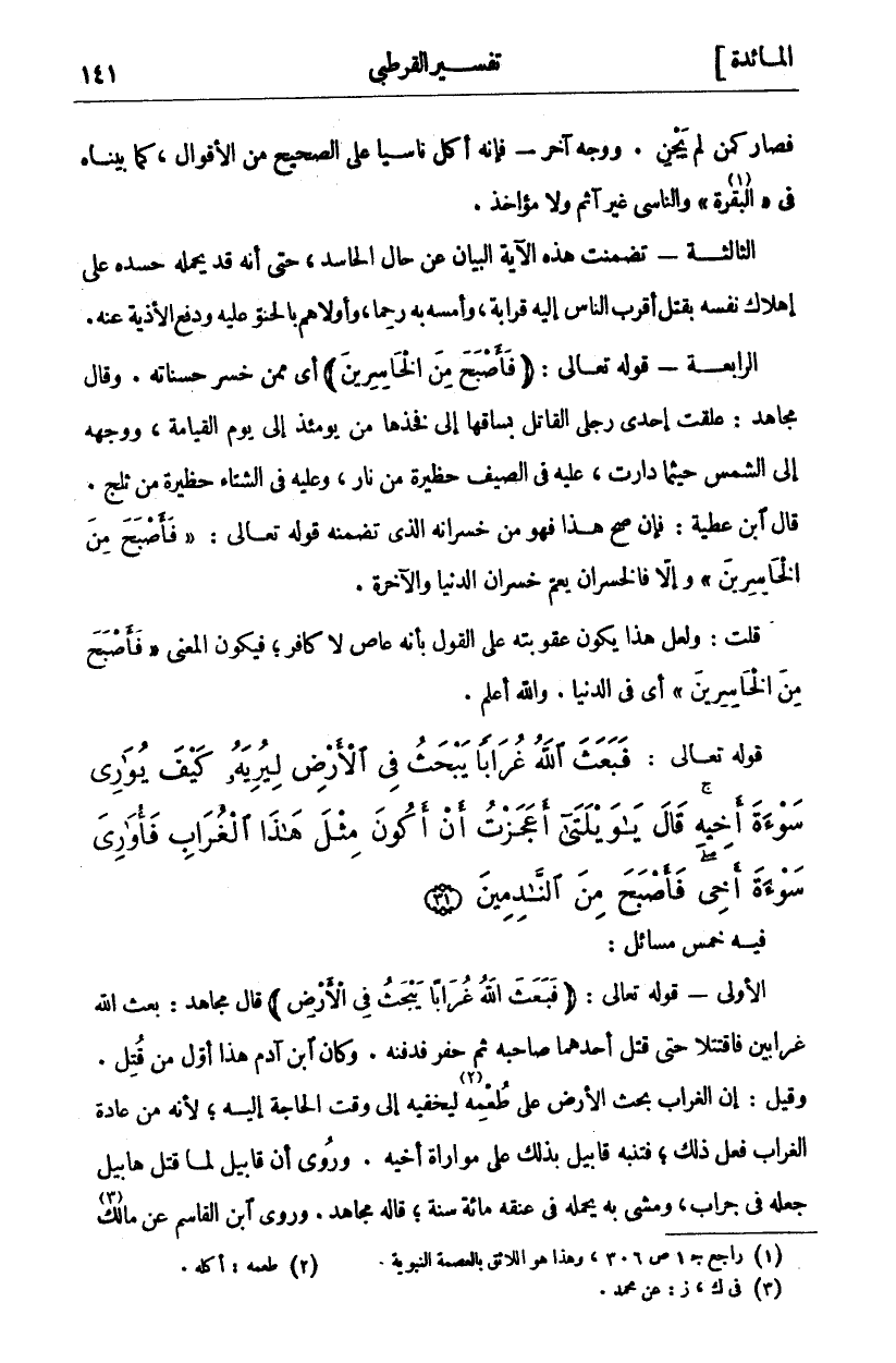 فَبَعَثَ اللَّهُ غُراباً يَبْحَثُ فِي الْأَرْضِ لِيُرِيَهُ كَيْفَ يُوارِي سَوْأَةَ أَخِيهِ قالَ يَا وَيْلَتى أَعَجَزْتُ أَنْ أَكُونَ مِثْلَ هذَا الْغُرابِ فَأُوارِيَ سَوْأَةَ أَخِي فَأَصْبَحَ مِنَ النَّادِمِينَ (٣١)