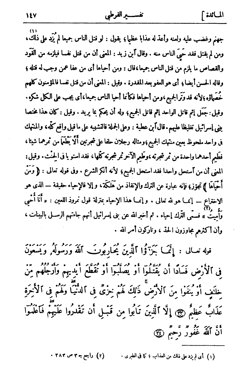 إِنَّما جَزاءُ الَّذِينَ يُحارِبُونَ اللَّهَ وَرَسُولَهُ وَيَسْعَوْنَ فِي الْأَرْضِ فَساداً أَنْ يُقَتَّلُوا أَوْ يُصَلَّبُوا أَوْ تُقَطَّعَ أَيْدِيهِمْ وَأَرْجُلُهُمْ مِنْ خِلافٍ أَوْ يُنْفَوْا مِنَ الْأَرْضِ ذلِكَ لَهُمْ خِزْيٌ فِي الدُّنْيا وَلَهُمْ فِي الْآخِرَةِ عَذابٌ عَظِيمٌ (٣٣) إِلاَّ الَّذِينَ تابُوا مِنْ قَبْلِ أَنْ تَقْدِرُوا عَلَيْهِمْ فَاعْلَمُوا أَنَّ اللَّهَ غَفُورٌ رَحِيمٌ (٣٤)