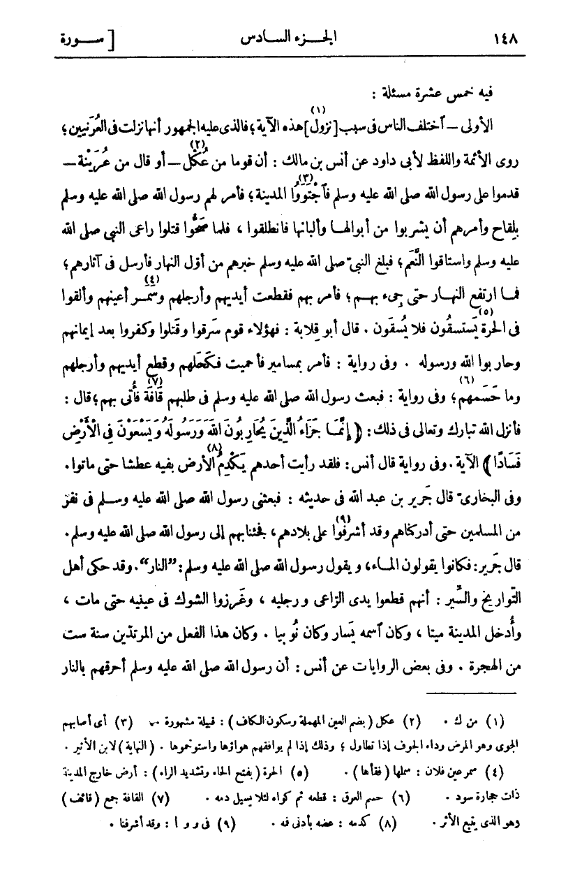 فيه خَمْسَ عَشْرَةَ مَسْأَلَةً الْأُولَى: اخْتَلَفَ النَّاسُ فِي سَبَبِ] نُزُولِ [«١» هَذِهِ الْآيَةِ، فَالَّذِي عَلَيْهِ الْجُمْهُورُ أَنَّهَا نَزَلَتْ فِي الْعُرَنِيِّينَ، رَوَى الْأَئِمَّةُ وَاللَّفْظُ لِأَبِي دَاوُدَ عَنْ أَنَسِ بْنِ مَالِكٍ: أَنَّ قَوْمًا مِنْ عُكْلَ «٢» - أَوْ قَالَ مِنْ عُرَيْنَةَ- قَدِمُوا عَلَى رَسُولِ اللَّهِ صَلَّى اللَّهُ عَلَيْهِ وَسَلَّمَ فَاجْتَوَوْا «٣» الْمَدِينَةَ، فَأَمَرَ لَهُمْ رَسُولُ اللَّهِ صَلَّى اللَّهُ عَلَيْهِ وَسَلَّمَ بِلِقَاحٍ وَأَمَرَهُمْ أَنْ يَشْرَبُوا مِنْ أَبْوَالِهَا وَأَلْبَانِهَا فَانْطَلَقُوا، فَلَمَّا صَحُّوا قَتَلُوا رَاعِيَ النَّبِيِّ صَلَّى اللَّهُ عَلَيْهِ وَسَلَّمَ وَاسْتَاقُوا النَّعَمَ، فَبَلَغَ النَّبِيَّ صَلَّى اللَّهُ عَلَيْهِ وَسَلَّمَ خَبَرُهُمْ مِنْ أَوَّلِ النَّهَارِ فَأَرْسَلَ فِي آثارهم، فلما ارتفع النهار حتى جئ بِهِمْ، فَأَمَرَ بِهِمْ فَقُطِّعَتْ أَيْدِيهِمْ وَأَرْجُلُهُمْ وَسَمَرَ «٤» أَعْيُنَهُمْ وَأُلْقُوا فِي الْحَرَّةِ «٥» يَسْتَسْقُونَ فَلَا يُسْقَوْنَ. قَالَ أَبُو قِلَابَةَ: فَهَؤُلَاءِ قَوْمٌ سَرَقُوا وَقَتَلُوا وَكَفَرُوا بَعْدَ إِيمَانِهِمْ وَحَارَبُوا اللَّهَ وَرَسُولَهُ. وَفِي رِوَايَةٍ: فَأَمَرَ بِمَسَامِيرَ فَأُحْمِيَتْ فَكَحَلَهُمْ وَقَطَعَ أَيْدِيَهُمْ وَأَرْجُلَهُمْ وَمَا حَسَمَهُمْ «٦»، وَفِي رِوَايَةٍ: فَبَعَثَ رَسُولُ اللَّهِ صَلَّى اللَّهُ عَلَيْهِ وَسَلَّمَ فِي طَلَبِهِمْ قَافَةً «٧» فَأُتِيَ بِهِمْ قَالَ: فَأَنْزَلَ اللَّهُ تَبَارَكَ وَتَعَالَى فِي ذَلِكَ:" إِنَّما جَزاءُ الَّذِينَ يُحارِبُونَ اللَّهَ وَرَسُولَهُ وَيَسْعَوْنَ فِي الْأَرْضِ فَساداً" الْآيَةَ. وَفِي رِوَايَةٍ قَالَ أَنَسٌ: فَلَقَدْ رَأَيْتُ أَحَدَهُمْ يَكْدِمُ «٨» الْأَرْضَ بِفِيهِ عَطَشًا حَتَّى مَاتُوا. وَفِي الْبُخَارِيِّ قَالَ جَرِيرُ بْنُ عَبْدِ اللَّهِ فِي حديثه: فَبَعَثَنِي رَسُولُ اللَّهِ صَلَّى اللَّهُ عَلَيْهِ وَسَلَّمَ فِي نَفَرٍ مِنَ الْمُسْلِمِينَ حَتَّى أَدْرَكْنَاهُمْ وَقَدْ أَشْرَفُوا «٩» عَلَى بِلَادِهِمْ، فَجِئْنَا بِهِمْ إِلَى رَسُولِ اللَّهِ صَلَّى اللَّهُ عَلَيْهِ وَسَلَّمَ. قَالَ جَرِيرٌ: فَكَانُوا يَقُولُونَ الْمَاءَ، وَيَقُولُ رَسُولُ اللَّهِ صَلَّى اللَّهُ عَلَيْهِ وَسَلَّمَ: (النَّارُ). وَقَدْ حَكَى أَهْلُ التَّوَارِيخِ وَالسِّيَرِ: أَنَّهُمْ قَطَعُوا يَدَيِ الرَّاعِيَ وَرِجْلَيْهِ، وَغَرَزُوا الشَّوْكَ فِي عَيْنَيْهِ حَتَّى مَاتَ، وَأُدْخِلَ الْمَدِينَةَ مَيِّتًا. وَكَانَ اسْمُهُ يَسَارَ وَكَانَ نُوبِيًّا. وَكَانَ هَذَا الْفِعْلُ مِنَ الْمُرْتَدِّينَ سَنَةَ سِتٍّ مِنَ الْهِجْرَةِ. وَفِي بَعْضِ الرِّوَايَاتِ عَنْ أَنَسٍ: أَنَّ رَسُولَ اللَّهِ صَلَّى اللَّهُ عَلَيْهِ وَسَلَّمَ أحرقهم بالنار