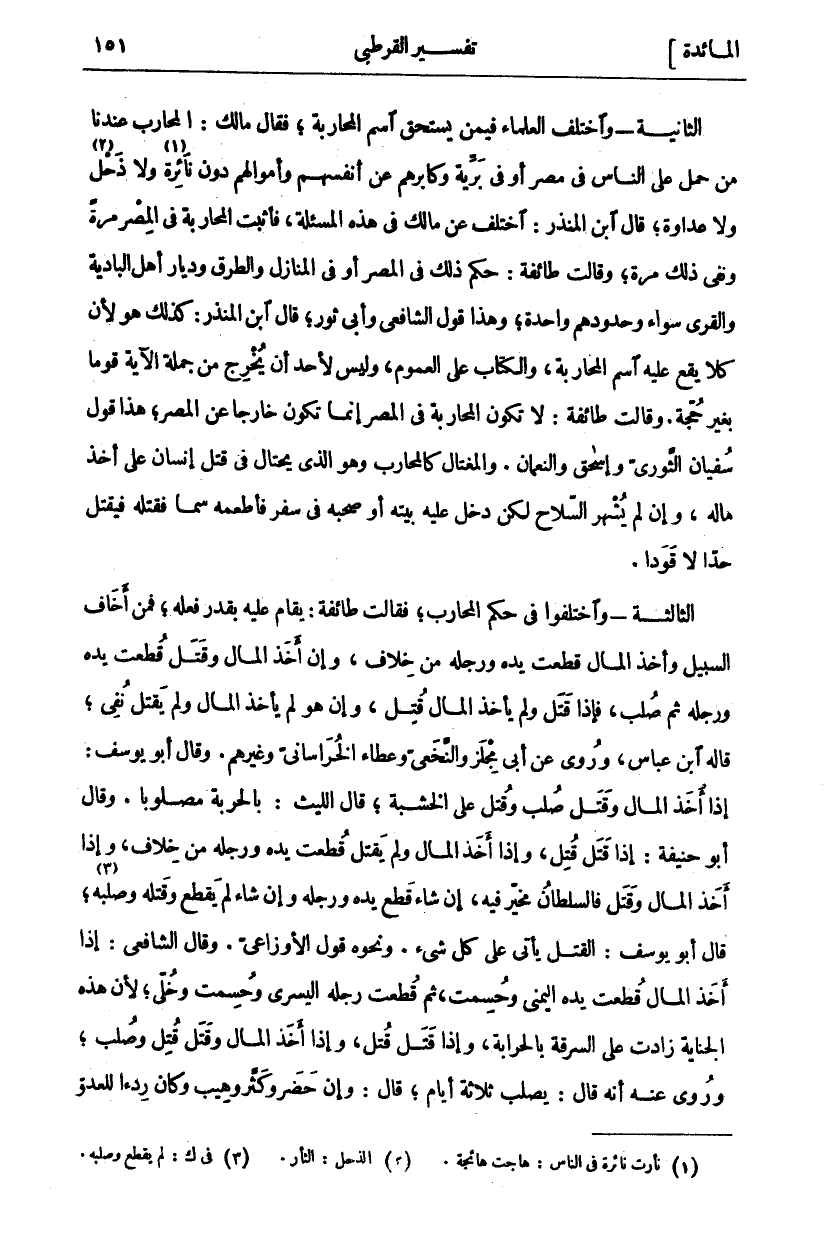الثَّانِيَةُ- وَاخْتَلَفَ الْعُلَمَاءُ فِيمَنْ يَسْتَحِقُّ اسْمَ الْمُحَارَبَةِ، فَقَالَ مَالِكٌ: الْمُحَارِبُ عِنْدَنَا مَنْ حَمَلَ عَلَى النَّاسِ فِي مِصْرَ أَوْ فِي بَرِّيَّةٍ وَكَابَرَهُمْ عَنْ أَنْفُسِهِمْ وَأَمْوَالِهِمْ دُونَ نَائِرَةٍ «١» وَلَا ذَحْلَ «٢» وَلَا عَدَاوَةَ، قَالَ ابْنُ الْمُنْذِرِ: اخْتُلِفَ عَنْ مَالِكٍ فِي هَذِهِ الْمَسْأَلَةِ، فَأَثْبَتَ الْمُحَارَبَةَ فِي الْمِصْرِ مَرَّةً وَنَفَى ذَلِكَ مَرَّةً، وَقَالَتْ طَائِفَةٌ: حُكْمُ ذَلِكَ فِي الْمِصْرِ أَوْ فِي الْمَنَازِلِ وَالطُّرُقِ وَدِيَارِ أَهْلِ الْبَادِيَةِ وَالْقُرَى سَوَاءٌ وَحُدُودُهُمْ وَاحِدَةٌ، وَهَذَا قَوْلُ الشَّافِعِيِّ وَأَبِي ثَوْرٍ، قَالَ ابْنُ الْمُنْذِرِ: كَذَلِكَ هُوَ لِأَنَّ كُلًّا يَقَعُ عَلَيْهِ اسْمُ الْمُحَارَبَةِ، وَالْكِتَابُ عَلَى الْعُمُومِ، وَلَيْسَ لِأَحَدٍ أَنْ يُخْرِجَ مِنْ جُمْلَةِ الْآيَةِ قَوْمًا بِغَيْرِ حُجَّةٍ. وَقَالَتْ طَائِفَةٌ: لَا تَكُونُ الْمُحَارَبَةُ فِي الْمِصْرِ إِنَّمَا تَكُونُ خَارِجًا عَنِ الْمِصْرِ، هَذَا قَوْلُ سُفْيَانَ الثَّوْرِيِّ وَإِسْحَاقَ وَالنُّعْمَانِ. وَالْمُغْتَالُ كَالْمُحَارِبِ وَهُوَ الَّذِي يَحْتَالُ فِي قَتْلِ إِنْسَانٍ عَلَى أَخْذِ مَالِهِ، وَإِنْ لَمْ يُشْهِرِ السِّلَاحَ لَكِنْ دَخَلَ عَلَيْهِ بَيْتَهُ أَوْ صَحِبَهُ فِي سَفَرٍ فَأَطْعَمَهُ سُمًّا فَقَتَلَهُ فَيُقْتَلُ حَدًّا لَا قَوَدًا. الثَّالِثَةُ- وَاخْتَلَفُوا فِي حُكْمِ الْمُحَارِبِ، فَقَالَتْ طَائِفَةٌ: يُقَامُ عَلَيْهِ بِقَدْرِ فِعْلِهِ، فَمَنْ أَخَافَ السَّبِيلَ وَأَخَذَ الْمَالَ قُطِعَتْ يَدُهُ وَرِجْلُهُ مِنْ خِلَافٍ، وَإِنْ أَخَذَ الْمَالَ وَقَتَلَ قُطِعَتْ يَدُهُ وَرِجْلُهُ ثُمَّ صُلِبَ، فَإِذَا قَتَلَ وَلَمْ يَأْخُذِ الْمَالَ قُتِلَ، وَإِنْ هُوَ لَمْ يَأْخُذِ الْمَالَ وَلَمْ يَقْتُلْ نُفِيَ، قَالَهُ ابْنُ عَبَّاسٍ، وَرُوِيَ عَنْ أَبِي مِجْلَزٍ وَالنَّخَعِيِّ وَعَطَاءٍ الْخُرَاسَانِيِّ وَغَيْرِهِمْ. وَقَالَ أَبُو يُوسُفَ: إِذَا أَخَذَ الْمَالَ وَقَتَلَ صُلِبَ وَقُتِلَ عَلَى الْخَشَبَةِ، قَالَ اللَّيْثُ: بِالْحَرْبَةِ مَصْلُوبًا. وَقَالَ أَبُو حَنِيفَةَ: إِذَا قَتَلَ قُتِلَ، وَإِذَا أَخَذَ الْمَالَ وَلَمْ يَقْتُلْ قُطِعَتْ يَدُهُ وَرِجْلُهُ مِنْ خِلَافٍ، وَإِذَا أَخَذَ الْمَالَ وَقَتَلَ فَالسُّلْطَانُ مُخَيَّرٌ فِيهِ، إِنْ شَاءَ قَطَعَ يَدَهُ وَرِجْلَهُ وَإِنْ شَاءَ لَمْ يَقْطَعْ وَقَتَلَهُ وَصَلَبَهُ «٣»، قَالَ أَبُو يُوسُفَ: الْقَتْلُ يَأْتِي عَلَى كُلِّ شي. وَنَحْوَهُ قَوْلُ الْأَوْزَاعِيِّ. وَقَالَ الشَّافِعِيُّ: إِذَا أَخَذَ الْمَالَ قُطِعَتْ يَدُهُ الْيُمْنَى وَحُسِمَتْ، ثُمَّ قُطِعَتْ رِجْلُهُ الْيُسْرَى وَحُسِمَتْ وَخُلِّيَ، لِأَنَّ هَذِهِ الْجِنَايَةَ زَادَتْ عَلَى السَّرِقَةِ بِالْحِرَابَةِ، وَإِذَا قَتَلَ قُتِلَ، وَإِذَا أَخَذَ الْمَالَ وَقَتَلَ قُتِلَ وَصُلِبَ، وَرُوِيَ عَنْهُ أَنَّهُ قَالَ: يُصْلَبُ ثَلَاثَةَ أَيَّامٍ، قَالَ: وَإِنْ حَضَرَ وَكَثَّرَ وَهِيبَ وَكَانَ رِدْءًا لِلْعَدُوِّ