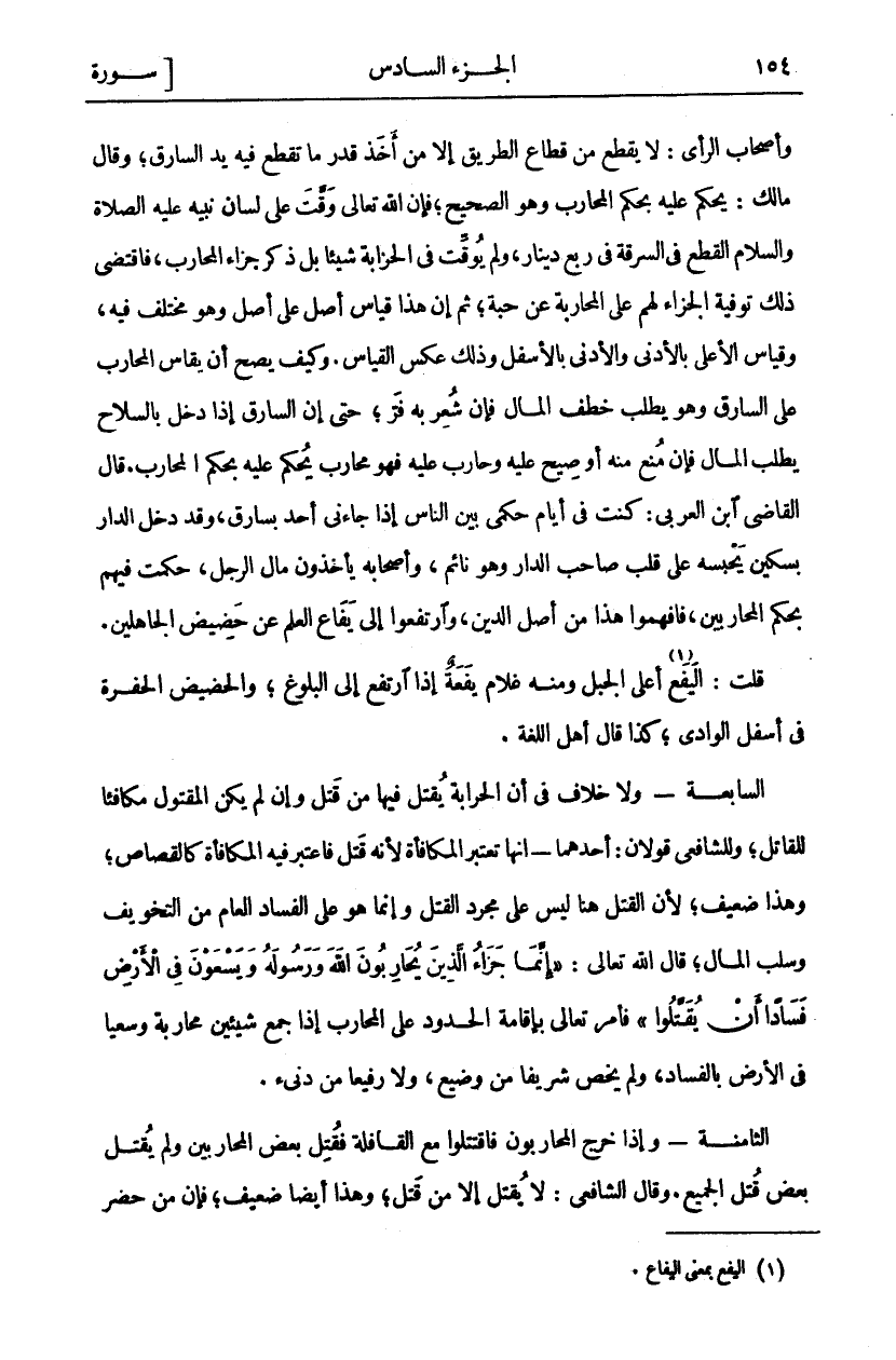 وَأَصْحَابُ الرَّأْيِ: لَا يُقْطَعُ مِنْ قُطَّاعِ الطَّرِيقِ إِلَّا مَنْ أَخَذَ قَدْرَ مَا تُقْطَعُ فِيهِ يَدُ السَّارِقِ، وَقَالَ مَالِكٌ: يُحْكَمُ عَلَيْهِ بِحُكْمِ الْمُحَارِبِ وَهُوَ الصَّحِيحُ، فَإِنَّ اللَّهَ تَعَالَى وَقَّتَ عَلَى لِسَانِ نَبِيِّهِ عَلَيْهِ الصَّلَاةُ وَالسَّلَامُ الْقَطْعَ فِي السَّرِقَةِ فِي رُبُعِ دِينَارٍ، وَلَمْ يُوَقِّتْ فِي الْحِرَابَةِ شَيْئًا، بَلْ ذَكَرَ جَزَاءَ الْمُحَارِبِ، فَاقْتَضَى ذَلِكَ تَوْفِيَةَ الْجَزَاءِ لَهُمْ عَلَى الْمُحَارَبَةِ عَنْ حَبَّةٍ، ثُمَّ إِنَّ هَذَا قِيَاسُ أَصْلٍ عَلَى أَصْلٍ وَهُوَ مُخْتَلَفٌ فِيهِ، وَقِيَاسُ الْأَعْلَى بِالْأَدْنَى وَالْأَدْنَى بِالْأَسْفَلِ وَذَلِكَ عَكْسُ الْقِيَاسِ. وَكَيْفَ يَصِحُّ أَنْ يُقَاسَ الْمُحَارِبُ عَلَى السَّارِقِ وَهُوَ يَطْلُبُ خَطْفَ الْمَالِ فَإِنْ شَعَرَ بِهِ فَرَّ، حَتَّى إِنَّ السَّارِقَ إِذَا دَخَلَ بِالسِّلَاحِ يَطْلُبُ المال فإن منع منه أو صبح عليه وحارب عليه فهو محارب يحكم عَلَيْهِ بِحُكْمِ الْمُحَارِبِ. قَالَ الْقَاضِي ابْنُ الْعَرَبِيِّ: كُنْتُ فِي أَيَّامِ حُكْمِي بَيْنَ النَّاسِ إِذَا جَاءَنِي أَحَدٌ بِسَارِقٍ، وَقَدْ دَخَلَ الدَّارَ بِسِكِّينٍ يَحْبِسُهُ عَلَى قَلْبِ صَاحِبِ الدَّارِ وَهُوَ نَائِمٌ، وَأَصْحَابُهُ يَأْخُذُونَ مَالَ الرَّجُلِ، حَكَمْتُ فِيهِمْ بِحُكْمِ الْمُحَارِبِينَ، فَافْهَمُوا هَذَا مِنْ أَصْلِ الدِّينِ، وَارْتَفِعُوا إِلَى يَفَاعِ الْعِلْمِ عَنْ حَضِيضِ الْجَاهِلِينَ. قُلْتُ: الْيَفَعُ «١» أَعْلَى الْجَبَلِ وَمِنْهُ غُلَامٌ يَفَعَةٌ إِذَا ارْتَفَعَ إِلَى الْبُلُوغِ، وَالْحَضِيضُ الْحُفْرَةُ فِي أَسْفَلِ الْوَادِي، كَذَا قَالَ أَهْلُ اللُّغَةِ. السَّابِعَةُ- وَلَا خِلَافَ فِي أَنَّ الْحِرَابَةَ يُقْتَلُ فِيهَا مَنْ قَتَلَ وَإِنْ لَمْ يَكُنِ الْمَقْتُولُ مُكَافِئًا لِلْقَاتِلِ، وَلِلشَّافِعِيِّ قَوْلَانِ: أَحَدُهُمَا- أَنَّهَا تُعْتَبَرُ الْمُكَافَأَةُ لِأَنَّهُ قَتْلٌ فَاعْتُبِرَ فِيهِ الْمُكَافَأَةُ كَالْقِصَاصِ، وَهَذَا ضَعِيفٌ، لِأَنَّ الْقَتْلَ هُنَا لَيْسَ عَلَى مُجَرَّدِ الْقَتْلِ وَإِنَّمَا هُوَ عَلَى الْفَسَادِ الْعَامِّ مِنَ التَّخْوِيفِ وَسَلْبِ الْمَالِ، قَالَ اللَّهُ تَعَالَى:" إِنَّما جَزاءُ الَّذِينَ يُحارِبُونَ اللَّهَ وَرَسُولَهُ وَيَسْعَوْنَ فِي الْأَرْضِ فَساداً أَنْ يُقَتَّلُوا" فَأَمَرَ تَعَالَى بِإِقَامَةِ الْحُدُودِ عَلَى الْمُحَارِبِ إِذَا جَمَعَ شَيْئَيْنِ مُحَارَبَةً وَسَعْيًا فِي الْأَرْضِ بِالْفَسَادِ، وَلَمْ يَخُصَّ شَرِيفًا مِنْ وضيع، ولا رفيعا من دنئ. الثَّامِنَةُ- وَإِذَا خَرَجَ الْمُحَارِبُونَ فَاقْتَتَلُوا مَعَ الْقَافِلَةِ فَقَتَلَ بَعْضُ الْمُحَارِبِينَ وَلَمْ يَقْتُلْ بَعْضٌ قُتِلَ الْجَمِيعُ. وَقَالَ الشَّافِعِيُّ: لَا يُقْتَلُ إِلَّا مَنْ قَتَلَ، وَهَذَا أَيْضًا ضَعِيفٌ، فَإِنَّ مَنْ حَضَرَ