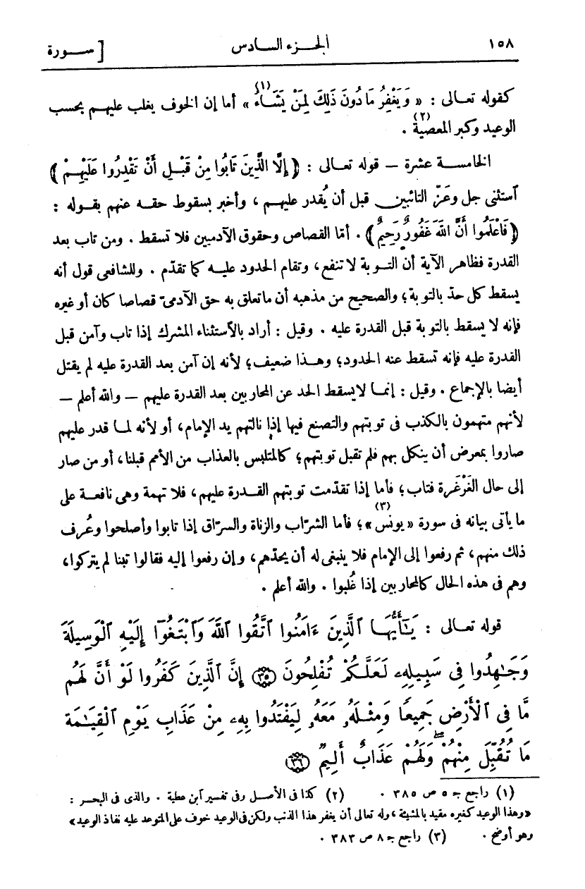 كَقَوْلِهِ تَعَالَى:" وَيَغْفِرُ مَا دُونَ ذلِكَ لِمَنْ يَشاءُ" «١»] النساء: ١١٦] أَمَّا إِنَّ الْخَوْفَ يَغْلِبُ عَلَيْهِمْ بِحَسَبِ الْوَعِيدِ وَكِبَرِ الْمَعْصِيَةِ «٢». الْخَامِسَةَ عَشْرَةَ- قَوْلُهُ تَعَالَى: (إِلَّا الَّذِينَ تابُوا مِنْ قَبْلِ أَنْ تَقْدِرُوا عَلَيْهِمْ) استثنى عز وجل التَّائِبِينَ قَبْلَ أَنْ يُقْدَرَ عَلَيْهِمْ، وَأَخْبَرَ بِسُقُوطِ حَقِّهِ عَنْهُمْ بِقَوْلِهِ:" فَاعْلَمُوا أَنَّ اللَّهَ غَفُورٌ رَحِيمٌ". أَمَّا الْقِصَاصُ وَحُقُوقُ الْآدَمِيِّينَ فَلَا تَسْقُطُ. وَمَنْ تَابَ بَعْدَ الْقُدْرَةِ فَظَاهِرُ الْآيَةِ أَنَّ التَّوْبَةَ لَا تَنْفَعُ، وَتُقَامُ الْحُدُودُ عَلَيْهِ كَمَا تَقَدَّمَ. وَلِلشَّافِعِيِّ قَوْلٌ إِنَّهُ يَسْقُطُ كُلُّ حَدٍّ بِالتَّوْبَةِ، وَالصَّحِيحُ مِنْ مَذْهَبِهِ أَنَّ مَا تَعَلَّقَ بِهِ حَقُّ الْآدَمِيِّ قِصَاصًا كَانَ أَوْ غَيْرَهُ فَإِنَّهُ لَا يَسْقُطُ بِالتَّوْبَةِ قَبْلَ الْقُدْرَةِ عَلَيْهِ. وَقِيلَ: أَرَادَ بِالِاسْتِثْنَاءِ الْمُشْرِكَ إِذَا تَابَ وَآمَنَ قَبْلَ الْقُدْرَةِ عَلَيْهِ فَإِنَّهُ تَسْقُطُ عَنْهُ الْحُدُودُ، وَهَذَا ضَعِيفٌ، لِأَنَّهُ إِنْ آمَنَ بَعْدَ الْقُدْرَةِ عَلَيْهِ لَمْ يُقْتَلْ أَيْضًا بِالْإِجْمَاعِ. وَقِيلَ: إِنَّمَا لَا يُسْقَطُ الْحَدُّ عَنِ الْمُحَارِبِينَ بَعْدَ الْقُدْرَةِ عَلَيْهِمْ- وَاللَّهُ أَعْلَمُ- لِأَنَّهُمْ مُتَّهَمُونَ بِالْكَذِبِ فِي تَوْبَتِهِمْ وَالتَّصَنُّعِ فِيهَا إِذَا نَالَتْهُمْ يَدُ الْإِمَامِ، أَوْ لِأَنَّهُ لَمَّا قُدِرَ عَلَيْهِمْ صَارُوا بِمَعْرِضٍ أَنْ يُنَكَّلَ بِهِمْ فَلَمْ تُقْبَلْ تَوْبَتُهُمْ، كَالْمُتَلَبِّسِ بِالْعَذَابِ مِنَ الْأُمَمِ قَبْلَنَا، أَوْ مَنْ صَارَ إِلَى حَالِ الْغَرْغَرَةِ فَتَابَ، فَأَمَّا إِذَا تَقَدَّمَتْ تَوْبَتُهُمُ الْقُدْرَةَ عَلَيْهِمْ، فَلَا تُهْمَةَ وَهِيَ نَافِعَةٌ عَلَى مَا يَأْتِي بَيَانُهُ فِي سُورَةِ" يُونُسَ" «٣»، فَأَمَّا الشُّرَّابُ وَالزُّنَاةُ وَالسُّرَّاقُ إِذَا تَابُوا وَأَصْلَحُوا وَعُرِفَ ذَلِكَ مِنْهُمْ، ثُمَّ رُفِعُوا إِلَى الْإِمَامِ فَلَا يَنْبَغِي لَهُ أَنْ يَحُدَّهُمْ، وَإِنْ رُفِعُوا إِلَيْهِ فَقَالُوا تُبْنَا لَمْ يُتْرَكُوا، وَهُمْ فِي هَذِهِ الْحَالِ كَالْمُحَارِبِينَ إِذَا غُلِبُوا. وَاللَّهُ أَعْلَمُ.