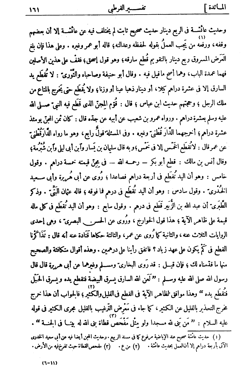 وَحَدِيثُ عَائِشَةَ فِي الرُّبُعِ دِينَارٍ حَدِيثٌ صَحِيحٌ ثَابِتٌ لَمْ يُخْتَلَفْ فِيهِ عَنْ عَائِشَةَ إِلَّا أَنَّ بَعْضَهُمْ وَقَفَهُ، وَرَفَعَهُ «١» مَنْ يَجِبُ الْعَمَلُ بِقَوْلِهِ لِحِفْظِهِ وَعَدَالَتِهِ، قَالَهُ أَبُو عُمَرَ وَغَيْرُهُ. وَعَلَى هَذَا فَإِنْ بَلَغَ الْعَرَضُ الْمَسْرُوقُ رُبُعَ دِينَارٍ بِالتَّقْوِيمِ قُطِعَ سَارِقُهُ، وَهُوَ قَوْلُ إِسْحَاقَ، فَقِفْ عَلَى هَذَيْنَ الْأَصْلَيْنِ فَهُمَا عُمْدَةُ الْبَابِ، وما أَصَحُّ مَا قِيلَ فِيهِ. وَقَالَ أَبُو حَنِيفَةَ وَصَاحِبَاهُ وَالثَّوْرِيُّ: لَا تُقْطَعُ يَدُ السَّارِقِ إِلَّا فِي عَشَرَةِ دَرَاهِمَ كَيْلًا، أَوْ دِينَارًا ذَهَبًا عَيْنًا أَوْ وَزْنًا، وَلَا يُقْطَعُ حَتَّى يَخْرُجَ بِالْمَتَاعِ مِنْ مِلْكِ الرَّجُلِ، وَحُجَّتُهُمْ حَدِيثُ ابْنِ عَبَّاسٍ، قَالَ: قُوِّمَ الْمِجَنُّ الَّذِي قَطَعَ فِيهِ النَّبِيُّ صَلَّى اللَّهُ عَلَيْهِ وَسَلَّمَ بِعَشَرَةِ دَرَاهِمَ. وَرَوَاهُ عَمْرِو بْنِ شُعَيْبٍ عَنْ أَبِيهِ عَنْ جَدِّهِ قَالَ: كَانَ ثَمَنُ الْمِجَنِّ يَوْمَئِذٍ عَشَرَةَ دَرَاهِمَ، أَخْرَجَهُمَا الدَّارَقُطْنِيُّ وَغَيْرُهُ. وَفِي الْمَسْأَلَةِ قَوْلٌ رَابِعٌ، وَهُوَ مَا رَوَاهُ الدَّارَقُطْنِيُّ عَنْ عُمَرَ قَالَ: لَا تُقْطَعُ الْخَمْسُ إِلَّا فِي خَمْسٍ، وَبِهِ قَالَ سُلَيْمَانُ بْنُ يَسَارٍ وَابْنُ أَبِي لَيْلَى وَابْنُ شُبْرُمَةَ، وَقَالَ أَنَسُ بْنُ مَالِكٍ: قَطَعَ أَبُو بَكْرٍ- رَحِمَهُ اللَّهُ- فِي مِجَنٍّ قِيمَتُهُ خَمْسَةُ دَرَاهِمَ. وَقَوْلٌ خَامِسٌ: وَهُوَ أَنَّ الْيَدَ تُقْطَعُ فِي أَرْبَعَةِ دَرَاهِمَ فَصَاعِدًا، رُوِيَ عَنْ أَبِي هُرَيْرَةَ وَأَبِي سَعِيدٍ الْخُدْرِيِّ. وَقَوْلٌ سَادِسٌ: وَهُوَ أَنَّ الْيَدَ تُقْطَعُ فِي دِرْهَمٍ فَمَا فَوْقَهُ، قَالَهُ عُثْمَانُ الْبَتِّيُّ. وَذَكَرَ الطَّبَرِيُّ أَنَّ عَبْدَ اللَّهِ بْنَ الزُّبَيْرِ قَطَعَ فِي دِرْهَمٍ. وَقَوْلٌ سَابِعٌ: وَهُوَ أَنَّ الْيَدَ تُقْطَعُ في كل ماله قِيمَةٌ عَلَى ظَاهِرِ الْآيَةِ، هَذَا قَوْلُ الْخَوَارِجِ، وَرُوِيَ عَنِ الْحَسَنِ الْبَصْرِيِّ، وَهِيَ إِحْدَى الرِّوَايَاتِ الثَّلَاثِ عَنْهُ، وَالثَّانِيَةُ كَمَا رُوِيَ عَنْ عُمَرَ، وَالثَّالِثَةُ حَكَاهَا قَتَادَةُ عَنْهُ أَنَّهُ قَالَ: تَذَاكَرْنَا الْقَطْعَ فِي كَمْ يَكُونُ عَلَى عَهْدِ زِيَادٍ؟ فَاتَّفَقَ رَأْيُنَا عَلَى دِرْهَمَيْنِ. وَهَذِهِ أَقْوَالٌ مُتَكَافِئَةٌ وَالصَّحِيحُ مِنْهَا مَا قَدَّمْنَاهُ لَكَ، فَإِنْ قِيلَ: قَدْ رَوَى الْبُخَارِيُّ وَمُسْلِمٌ وَغَيْرُهُمَا عَنْ أَبِي هُرَيْرَةَ قَالَ قَالَ رَسُولُ اللَّهِ صَلَّى اللَّهُ عَلَيْهِ وَسَلَّمَ: (لَعَنَ اللَّهُ السَّارِقَ يَسْرِقُ الْبَيْضَةَ فَتُقْطَعُ يَدُهُ وَيَسْرِقُ الْحَبْلَ فَتُقْطَعُ يَدُهُ) وَهَذَا مُوَافِقٌ لِظَاهِرِ الْآيَةِ فِي الْقَطْعِ فِي الْقَلِيلِ وَالْكَثِيرِ «٢»، فَالْجَوَابُ أَنَّ هَذَا خَرَجَ مَخْرَجَ التَّحْذِيرِ بِالْقَلِيلِ عَنِ الْكَثِيرِ، كَمَا جَاءَ فِي مَعْرِضِ التَّرْغِيبِ بِالْقَلِيلِ مَجْرَى الْكَثِيرِ فِي قَوْلِهِ عَلَيْهِ السَّلَامُ: (مَنْ بَنَى لِلَّهِ مَسْجِدًا وَلَوْ مِثْلَ مَفْحَصِ «٣» قَطَاةٍ بَنَى اللَّهُ لَهُ بَيْتًا فِي الْجَنَّةِ).