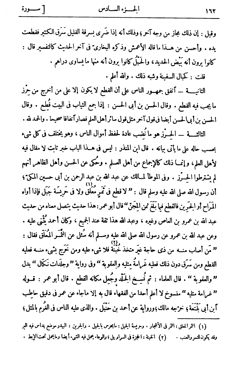 وَقِيلَ: إِنَّ ذَلِكَ مَجَازٌ مِنْ وَجْهٍ آخَرَ، وَذَلِكَ أَنَّهُ إِذَا ضَرِيَ بِسَرِقَةِ الْقَلِيلِ سَرَقَ الْكَثِيرَ فَقُطِعَتْ يَدُهُ. وَأَحْسَنُ مِنْ هَذَا مَا قَالَهُ الْأَعْمَشُ وَذَكَرَهُ الْبُخَارِيُّ فِي آخِرِ الْحَدِيثِ كَالتَّفْسِيرِ قَالَ: كَانُوا يَرَوْنَ أَنَّهُ بَيْضُ الْحَدِيدِ، وَالْحَبْلُ كَانُوا يَرَوْنَ أَنَّهُ مِنْهَا مَا يُسَاوِي دَرَاهِمَ. قُلْتُ: كَحِبَالِ السَّفِينَةِ وَشِبْهِ ذَلِكَ. وَاللَّهُ أَعْلَمُ. الثَّانِيَةُ- اتَّفَقَ جُمْهُورُ النَّاسِ عَلَى أَنَّ الْقَطْعَ لَا يَكُونُ إِلَّا عَلَى مَنْ أَخْرَجَ مِنْ حِرْزٍ مَا يَجِبُ فِيهِ الْقَطْعُ. وَقَالَ الْحَسَنُ بْنُ أَبِي الْحَسَنِ: إِذَا جَمَعَ الثِّيَابَ في البيت قطع. وَقَالَ الْحَسَنُ بْنُ أَبِي الْحَسَنِ أَيْضًا فِي قَوْلٍ آخَرَ مِثْلَ قَوْلِ سَائِرِ أَهْلِ الْعِلْمِ فصار اتفاقا صحيحا. والحمد لله. الثالثة- الحزر هُوَ مَا نُصِبَ عَادَةً لِحِفْظِ أَمْوَالِ النَّاسِ، وهو يختلف في كل شي بِحَسَبِ حَالِهِ عَلَى مَا يَأْتِي بَيَانُهُ. قَالَ ابْنُ الْمُنْذِرِ: لَيْسَ فِي هَذَا الْبَابِ خَبَرٌ ثَابِتٌ لَا مَقَالَ فِيهِ لِأَهْلِ الْعِلْمِ، وَإِنَّمَا ذَلِكَ كَالْإِجْمَاعِ مِنْ أَهْلِ الْعِلْمِ. وَحُكِيَ عَنِ الْحَسَنِ وَأَهْلِ الظَّاهِرِ أَنَّهُمْ لَمْ يَشْتَرِطُوا الْحِرْزَ. وَفِي الْمُوَطَّأِ لِمَالِكٍ عَنْ عَبْدِ اللَّهِ بْنِ عَبْدِ الرَّحْمَنِ بْنِ أَبِي حُسَيْنٍ الْمَكِّيِّ، أَنَّ رسول الله صَلَّى اللَّهُ عَلَيْهِ وَسَلَّمَ قال: (لَا قَطْعَ فِي ثَمَرٍ مُعَلَّقٍ «١» وَلَا فِي حَرِيسَةِ جَبَلٍ فَإِذَا آوَاهُ الْمُرَاحُ أَوِ الْجَرِينُ فَالْقَطْعُ فِيمَا بَلَغَ ثَمَنَ الْمِجَنِّ) قَالَ أَبُو عُمَرَ: هَذَا حَدِيثٌ يَتَّصِلُ مَعْنَاهُ مِنْ حَدِيثُ عَبْدِ اللَّهِ بْنِ عَمْرِو بْنِ الْعَاصِ وَغَيْرِهِ، وَعَبْدُ اللَّهِ هَذَا ثِقَةٌ عِنْدَ الْجَمِيعِ، وَكَانَ أَحْمَدُ يُثْنِي عَلَيْهِ. وَعَنْ عَبْدِ اللَّهِ بْنِ عَمْرٍو عَنْ رَسُولِ اللَّهِ صَلَّى اللَّهُ عَلَيْهِ وَسَلَّمَ أَنَّهُ سُئِلَ عَنِ الثَّمَرِ الْمُعَلَّقِ فَقَالَ: (مَنْ أَصَابَ مِنْهُ مِنْ ذِي حَاجَةٍ غَيْرَ مُتَّخِذٍ خُبْنَةً «٢» فلا شي عَلَيْهِ وَمَنْ خَرَجَ بِشَيْءٍ مِنْهُ فَعَلَيْهِ الْقَطْعُ وَمَنْ سَرَقَ دُونَ ذَلِكَ فَعَلَيْهِ غَرَامَةُ مِثْلَيْهِ وَالْعُقُوبَةُ) وَفِي رِوَايَةٍ (وَجَلَدَاتُ نَكَالٍ) بَدَلَ (وَالْعُقُوبَةُ). قَالَ الْعُلَمَاءُ: ثُمَّ نُسِخَ الْجَلْدُ وَجُعِلَ مَكَانَهُ الْقَطْعُ. قَالَ أَبُو عُمَرَ: قَوْلُهُ (غَرَامَةُ مِثْلَيْهِ) منسوخ لا أعلم أحد مِنَ الْفُقَهَاءِ قَالَ بِهِ إِلَّا مَا جَاءَ عن عمر في دقيق حاطب ابن أبي بلتعة، خرج مَالِكٌ، وَرِوَايَةٌ عَنْ أَحْمَدَ بْنِ حَنْبَلٍ. وَالَّذِي عليه الناس في الغرم بالمثل،