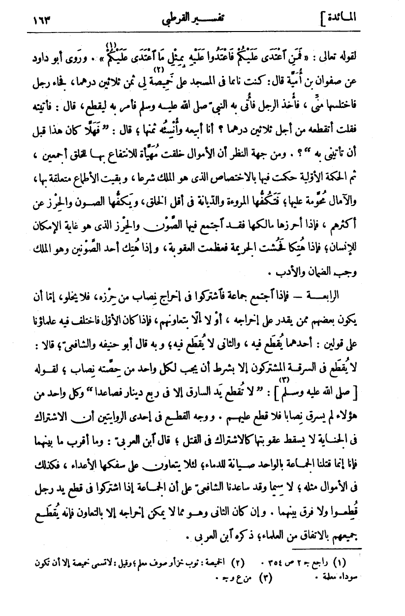 لِقَوْلِهِ تَعَالَى:" فَمَنِ اعْتَدى عَلَيْكُمْ فَاعْتَدُوا عَلَيْهِ بِمِثْلِ مَا اعْتَدى عَلَيْكُمْ" «١»] البقرة: ١٩٤]. وَرَوَى أَبُو دَاوُدَ عَنْ صَفْوَانَ بْنِ أُمَيَّةَ قَالَ: كُنْتُ نَائِمًا فِي الْمَسْجِدِ عَلَيَّ خَمِيصَةٌ «٢» لِي ثَمَنُ ثَلَاثِينَ دِرْهَمًا، فَجَاءَ رَجُلٌ فَاخْتَلَسَهَا مِنِّي، فَأُخِذَ الرَّجُلُ فَأُتِيَ بِهِ النَّبِيَّ صَلَّى اللَّهُ عَلَيْهِ وَسَلَّمَ فَأَمَرَ بِهِ لِيُقْطَعَ، قَالَ: فأتيته فقلت أتقطع مِنْ أَجْلِ ثَلَاثِينَ دِرْهَمًا؟ أَنَا أَبِيعُهُ وَأُنْسِئُهُ ثَمَنَهَا، قَالَ: (فَهَلَّا كَانَ هَذَا قَبْلَ أَنْ تَأْتِيَنِي بِهِ)؟. وَمِنْ جِهَةِ النَّظَرِ أَنَّ الْأَمْوَالَ خُلِقَتْ مُهَيَّأَةً لِلِانْتِفَاعِ بِهَا لِلْخَلْقِ أَجْمَعِينَ، ثُمَّ الْحِكْمَةُ الْأَوَّلِيَّةُ حَكَمَتْ فِيهَا بِالِاخْتِصَاصِ الَّذِي هُوَ الْمِلْكُ شَرْعًا، وَبَقِيَتِ الْأَطْمَاعُ مُتَعَلِّقَةً بِهَا، وَالْآمَالُ مُحَوَّمَةً عَلَيْهَا، فَتَكُفُّهَا الْمُرُوءَةُ وَالدِّيَانَةُ فِي أَقَلِّ الْخَلْقِ، وَيَكُفُّهَا الصَّوْنُ وَالْحِرْزُ عَنْ أَكْثَرِهِمْ، فَإِذَا أَحْرَزَهَا مَالِكُهَا فَقَدِ اجْتَمَعَ فِيهَا الصَّوْنُ وَالْحِرْزُ الَّذِي هُوَ غَايَةُ الْإِمْكَانِ لِلْإِنْسَانِ، فَإِذَا هُتِكَا فَحُشَتِ الْجَرِيمَةُ فَعَظُمَتِ الْعُقُوبَةُ، وَإِذَا هُتِكَ أَحَدُ الصَّوْنَيْنِ وَهُوَ الْمِلْكُ وَجَبَ الضَّمَانُ وَالْأَدَبُ. الرَّابِعَةُ- فَإِذَا اجْتَمَعَ جَمَاعَةٌ فَاشْتَرَكُوا فِي إِخْرَاجِ نِصَابٍ مِنْ حِرْزِهِ، فَلَا يَخْلُو، إِمَّا أَنْ يَكُونَ بعضهم ممن يقدر على إخراجه، أولا إِلَّا بِتَعَاوُنِهِمْ، فَإِذَا كَانَ الْأَوَّلُ فَاخْتَلَفَ فِيهِ عُلَمَاؤُنَا عَلَى قَوْلَيْنِ: أَحَدُهُمَا يُقْطَعُ فِيهِ، وَالثَّانِي لَا يُقْطَعُ فِيهِ، وَبِهِ قَالَ أَبُو حَنِيفَةَ وَالشَّافِعِيُّ، قَالَا: لَا يُقْطَعُ فِي السَّرِقَةِ الْمُشْتَرِكُونَ إِلَّا بِشَرْطٍ أَنْ يَجِبَ لِكُلِّ وَاحِدٍ مِنْ حِصَّتِهِ نِصَابٌ، لِقَوْلِهِ] صَلَّى اللَّهُ عَلَيْهِ وَسَلَّمَ [«٣»: (لَا تُقْطَعُ يَدُ السَّارِقِ إِلَّا فِي رُبُعِ دِينَارٍ فَصَاعِدًا) وَكُلُّ وَاحِدٍ مِنْ هَؤُلَاءِ لَمْ يَسْرِقْ نِصَابًا فَلَا قَطْعَ عَلَيْهِمْ. وَوَجْهُ الْقَطْعِ فِي إِحْدَى الرِّوَايَتَيْنِ أَنَّ الِاشْتِرَاكَ فِي الْجِنَايَةِ لَا يُسْقِطُ عُقُوبَتَهَا كَالِاشْتِرَاكِ فِي الْقَتْلِ، قَالَ ابْنُ الْعَرَبِيِّ: وَمَا أَقْرَبُ مَا بَيْنَهُمَا فَإِنَّا إِنَّمَا قَتَلْنَا الْجَمَاعَةَ بِالْوَاحِدِ صِيَانَةً لِلدِّمَاءِ، لِئَلَّا يَتَعَاوَنَ عَلَى سَفْكِهَا الْأَعْدَاءُ، فَكَذَلِكَ فِي الْأَمْوَالِ مِثْلُهُ، لَا سِيَّمَا وَقَدْ سَاعَدَنَا الشَّافِعِيُّ عَلَى أَنَّ الْجَمَاعَةَ إِذَا اشْتَرَكُوا فِي قَطْعِ يَدِ رَجُلٍ قُطِعُوا وَلَا فَرْقَ بَيْنَهُمَا. وَإِنْ كَانَ الثَّانِي وَهُوَ مِمَّا لَا يُمْكِنُ إِخْرَاجُهُ إِلَّا بِالتَّعَاوُنِ فَإِنَّهُ يُقْطَعُ جَمِيعُهُمْ بِالِاتِّفَاقِ مِنَ الْعُلَمَاءِ، ذكره ابن العربي.