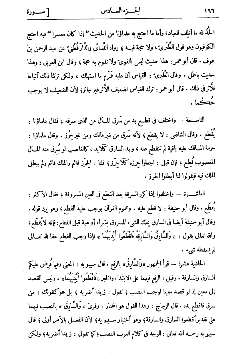 الْحَدُّ لِلَّهِ مَا أَتْلَفَ لِلْعِبَادِ، وَأَمَّا مَا احْتَجَّ بِهِ عُلَمَاؤُنَا مِنَ الْحَدِيثِ (إِذَا كَانَ معسرا) فيه احْتَجَّ الْكُوفِيُّونَ وَهُوَ قَوْلُ الطَّبَرِيِّ، وَلَا حُجَّةَ فِيهِ، رَوَاهُ النَّسَائِيُّ وَالدَّارَقُطْنِيُّ عَنْ عَبْدِ الرَّحْمَنِ بْنِ عَوْفٍ. قَالَ أَبُو عُمَرَ: هَذَا حَدِيثٌ لَيْسَ بِالْقَوِيِّ وَلَا تَقُومُ بِهِ حُجَّةٌ، وَقَالَ ابْنُ الْعَرَبِيِّ: وَهَذَا حَدِيثٌ بَاطِلٌ. وَقَالَ الطَّبَرِيُّ: الْقِيَاسُ أَنَّ عَلَيْهِ غُرْمَ مَا اسْتَهْلَكَ. وَلَكِنْ تَرَكْنَا ذَلِكَ اتِّبَاعًا لِلْأَثَرِ فِي ذَلِكَ. قَالَ أَبُو عُمَرَ: تَرْكُ الْقِيَاسِ لِضَعِيفِ الْأَثَرِ غَيْرُ جَائِزٍ، لِأَنَّ الضَّعِيفَ لَا يُوجِبُ حُكْمًا. التَّاسِعَةُ- وَاخْتُلِفَ فِي قَطْعِ يَدِ مَنْ سَرَقَ الْمَالَ مِنَ الذِي سَرَقَهُ، فَقَالَ عُلَمَاؤُنَا: يُقْطَعُ. وَقَالَ الشَّافِعِيُّ: لَا يُقْطَعُ، لِأَنَّهُ سَرَقَ مِنْ غَيْرِ مَالِكٍ وَمِنْ غَيْرِ حِرْزٍ. وَقَالَ عُلَمَاؤُنَا: حُرْمَةُ المالك عليه باقية لم تنقطع عنه، وئد السارق كلائد، كَالْغَاصِبِ لَوْ سُرِقُ مِنْهُ الْمَالُ الْمَغْصُوبُ قُطِعَ، فَإِنْ قِيلَ: اجْعَلُوا حِرْزَهُ كَلَا حِرْزٍ، قُلْنَا: الْحِرْزُ قَائِمٌ وَالْمِلْكُ قَائِمٌ وَلَمْ يَبْطُلِ الْمِلْكُ فِيهِ فَيَقُولُوا لَنَا أَبْطِلُوا الْحِرْزَ. الْعَاشِرَةُ- وَاخْتَلَفُوا إِذَا كَرَّرَ السَّرِقَةَ بَعْدَ الْقَطْعِ فِي الْعَيْنِ الْمَسْرُوقَةِ، فَقَالَ الْأَكْثَرُ: يُقْطَعُ. وَقَالَ أَبُو حَنِيفَةَ: لَا قَطْعَ عَلَيْهِ. وَعُمُومُ الْقُرْآنِ يُوجِبُ عَلَيْهِ الْقَطْعُ، وَهُوَ يَرُدُّ قَوْلَهُ. وَقَالَ أَبُو حَنِيفَةَ أَيْضًا فِي السَّارِقِ يَمْلِكُ الشَّيْءَ الْمَسْرُوقَ بِشِرَاءٍ أَوْ هِبَةٍ قَبْلَ الْقَطْعِ: فَإِنَّهُ لَا يُقْطَعُ، وَاللَّهُ تَعَالَى يَقُولُ:" وَالسَّارِقُ وَالسَّارِقَةُ فَاقْطَعُوا أَيْدِيَهُما" فَإِذَا وَجَبَ الْقَطْعُ حَقًّا لِلَّهِ تَعَالَى لَمْ يسقطه شي. الْحَادِيَةَ عَشْرَةَ- قَرَأَ الْجُمْهُورُ" وَالسَّارِقُ" بِالرَّفْعِ. قَالَ سِيبَوَيْهِ: الْمَعْنَى وَفِيمَا فُرِضَ عَلَيْكُمُ السَّارِقُ وَالسَّارِقَةُ. وَقِيلَ: الرَّفْعُ فِيهِمَا عَلَى الِابْتِدَاءِ وَالْخَبَرُ" فَاقْطَعُوا أَيْدِيَهُما". وَلَيْسَ الْقَصْدُ إِلَى مُعَيَّنٍ إِذْ لَوْ قَصَدَ مُعَيَّنًا لَوَجَبَ النَّصْبُ، تَقُولُ: زَيْدًا اضْرِبْهُ، بَلْ هُوَ كَقَوْلِكَ: مَنْ سَرَقَ فَاقْطَعْ يَدَهُ. قال الزجاج: وهذا القول هو المختار. وقرى" وَالسَّارِقُ" بِالنَّصْبِ فِيهِمَا عَلَى تَقْدِيرِ اقْطَعُوا السَّارِقَ وَالسَّارِقَةَ، وَهُوَ اخْتِيَارُ سِيبَوَيْهِ، لِأَنَّ الْفِعْلَ بِالْأَمْرِ أَوْلَى، قَالَ سِيبَوَيْهِ رَحِمَهُ اللَّهُ تَعَالَى: الْوَجْهُ فِي كَلَامِ الْعَرَبِ النَّصْبُ، كَمَا تَقُولُ: زَيْدًا اضربه، ولكن