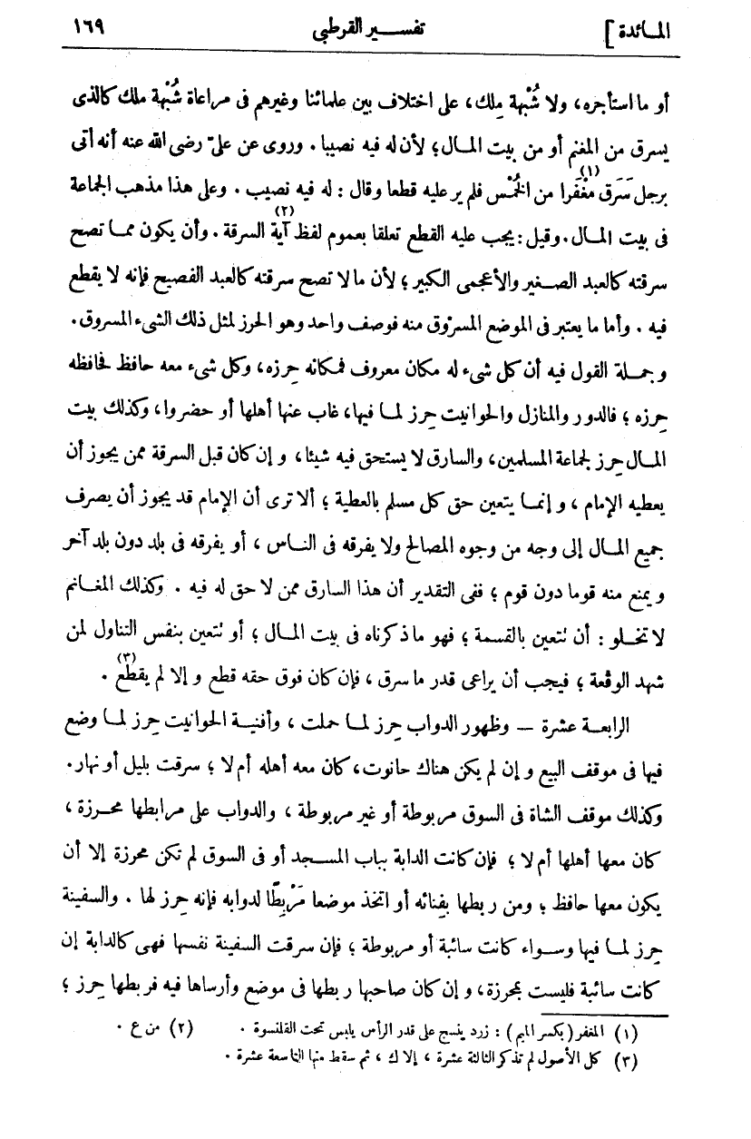 أَوْ مَا اسْتَأْجَرَهُ، وَلَا شُبْهَةُ مِلْكٍ، عَلَى اخْتِلَافٍ بَيْنَ عُلَمَائِنَا وَغَيْرِهِمْ فِي مُرَاعَاةِ شُبْهَةِ مِلْكٍ كَالَّذِي يَسْرِقُ مِنَ الْمَغْنَمِ أَوْ مِنْ بَيْتِ الْمَالِ لِأَنَّ لَهُ فِيهِ نَصِيبًا. وَرُوِيَ عَنْ عَلِيٍّ رَضِيَ اللَّهُ عَنْهُ أَنَّهُ أُتِيَ بِرَجُلٍ سَرَقَ «١» مِغْفَرًا مِنَ الْخُمُسِ فَلَمْ يَرَ عَلَيْهِ قَطْعًا وَقَالَ: لَهُ فِيهِ نَصِيبٌ. وَعَلَى هَذَا مَذْهَبُ الْجَمَاعَةِ فِي بَيْتِ الْمَالِ. وَقِيلَ: يَجِبُ عَلَيْهِ الْقَطْعُ تَعَلُّقًا بِعُمُومِ لَفْظِ آيَةِ «٢» السَّرِقَةِ. وَأَنْ يَكُونَ مِمَّا تَصِحُّ سَرِقَتُهُ كَالْعَبْدِ الصَّغِيرِ وَالْأَعْجَمِيِّ الْكَبِيرِ، لِأَنَّ مَا لَا تَصِحُّ سَرِقَتُهُ كَالْعَبْدِ الْفَصِيحِ فَإِنَّهُ لَا يُقْطَعُ فِيهِ. وَأَمَّا مَا يُعْتَبَرُ فِي الْمَوْضِعِ الْمَسْرُوقِ مِنْهُ فَوَصْفٌ وَاحِدٌ وَهُوَ الْحِرْزُ لِمِثْلِ ذَلِكَ الشَّيْءِ المسروق. وجملة القول فيه أن كل شي له مكان معروف فمكانه حرزه، وكل شي مَعَهُ حَافِظٌ فَحَافِظُهُ حِرْزُهُ، فَالدُّورُ وَالْمَنَازِلُ وَالْحَوَانِيتُ حِرْزٌ لِمَا فِيهَا، غَابَ عَنْهَا أَهْلُهَا أَوْ حَضَرُوا، وَكَذَلِكَ بَيْتُ الْمَالِ حِرْزٌ لِجَمَاعَةِ الْمُسْلِمِينَ، وَالسَّارِقُ لَا يَسْتَحِقُّ فِيهِ شَيْئًا، وَإِنْ كَانَ قَبْلَ السَّرِقَةِ مِمَّنْ يَجُوزُ أَنْ يُعْطِيَهُ الْإِمَامُ وَإِنَّمَا يَتَعَيَّنُ حَقُّ كُلِّ مُسْلِمٍ بِالْعَطِيَّةِ، أَلَا تَرَى أَنَّ الْإِمَامَ قَدْ يَجُوزُ أَنْ يَصْرِفَ جَمِيعَ الْمَالِ إِلَى وَجْهٍ مِنْ وُجُوهِ الْمَصَالِحِ وَلَا يُفَرِّقُهُ فِي النَّاسِ، أَوْ يُفَرِّقُهُ فِي بَلَدٍ دُونَ بَلَدٍ آخَرَ وَيَمْنَعُ مِنْهُ قَوْمًا دُونَ قَوْمٍ، فَفِي التَّقْدِيرِ أَنَّ هَذَا السَّارِقَ مِمَّنْ لَا حَقَّ لَهُ فِيهِ. وَكَذَلِكَ الْمَغَانِمُ لَا تَخْلُو: أَنْ تَتَعَيَّنَ بِالْقِسْمَةِ، فَهُوَ مَا ذكرناه في بيت المال، أو تتعين بنفس التناول لمن شهد الوقعة، فَيَجِبُ أَنْ يُرَاعَى قَدْرُ مَا سَرَقَ، فَإِنْ كَانَ فَوْقَ حَقِّهِ قُطِعَ وَإِلَّا لَمْ يُقْطَعْ «٣». الرَّابِعَةَ عَشْرَةَ- وَظُهُورُ الدَّوَابِّ حِرْزٌ لِمَا حَمَلَتْ، وَأَفْنِيَةُ الْحَوَانِيتِ حِرْزٌ لِمَا وُضِعَ فِيهَا فِي مَوْقِفِ الْبَيْعِ وَإِنْ لَمْ يَكُنْ هُنَاكَ حَانُوتٌ، كَانَ مَعَهُ أَهْلُهُ أَمْ لَا، سُرِقَتْ بِلَيْلٍ أَوْ نَهَارٍ. وَكَذَلِكَ مَوْقِفُ الشَّاةِ فِي السُّوقِ مَرْبُوطَةً أَوْ غَيْرَ مَرْبُوطَةٍ، وَالدَّوَابُّ عَلَى مَرَابِطِهَا مُحْرَزَةٌ، كَانَ مَعَهَا أَهْلُهَا أَمْ لَا، فَإِنْ كَانَتِ الدَّابَّةُ بِبَابِ الْمَسْجِدِ أَوْ فِي السُّوقِ لَمْ تَكُنْ مُحْرَزَةً إِلَّا أَنْ يَكُونَ مَعَهَا حَافِظٌ، وَمَنْ رَبَطَهَا بِفِنَائِهِ أَوِ اتَّخَذَ مَوْضِعًا مَرْبِطًا لِدَوَابِّهِ فَإِنَّهُ حِرْزٌ لَهَا. وَالسَّفِينَةُ حِرْزٌ لِمَا فِيهَا وَسَوَاءُ كَانَتْ سَائِبَةً أَوْ مَرْبُوطَةً، فَإِنْ سُرِقَتِ السَّفِينَةُ نَفْسُهَا فَهِيَ كَالدَّابَّةِ إِنْ كَانَتْ سَائِبَةً فَلَيْسَتْ بِمُحْرَزَةٍ، وَإِنْ كَانَ صَاحِبُهَا رَبَطَهَا فِي مَوْضِعٍ وَأَرْسَاهَا فِيهِ فَرَبْطُهَا حِرْزٌ،