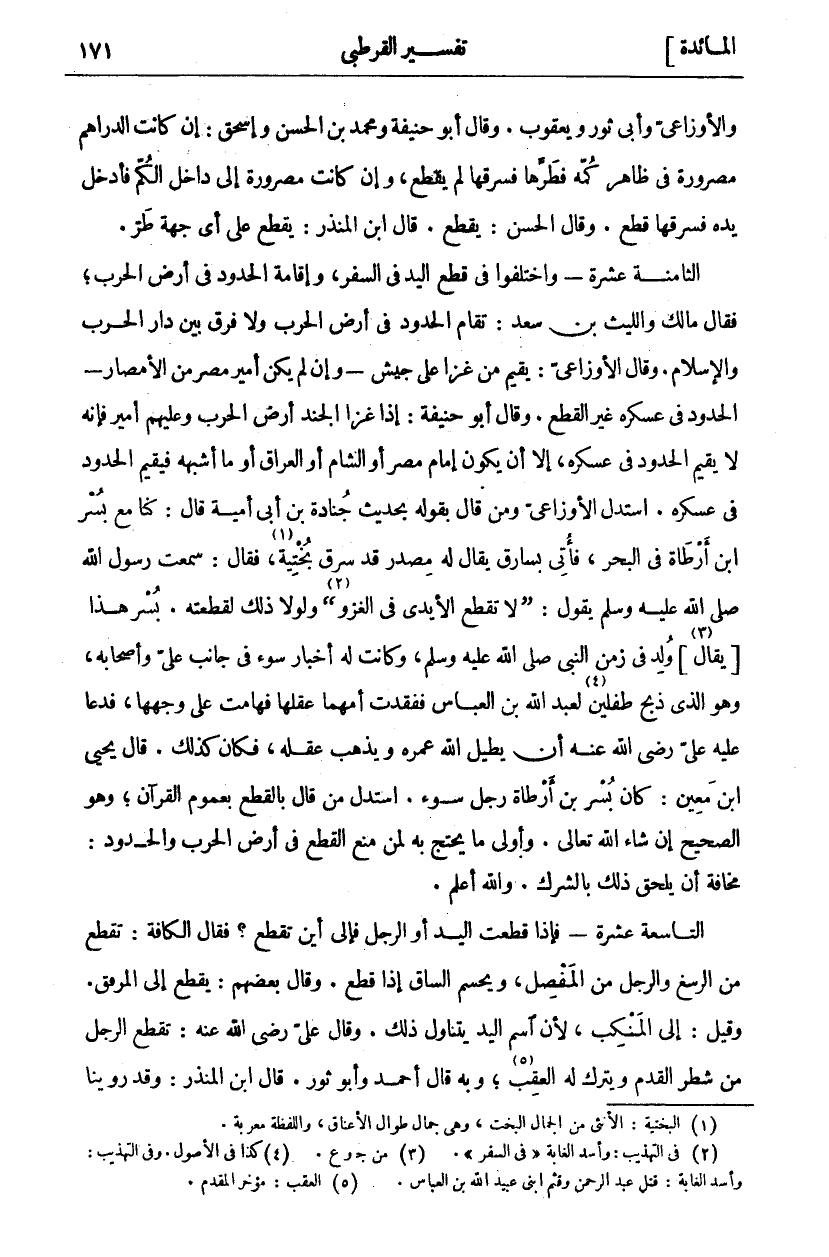 وَالْأَوْزَاعِيِّ وَأَبِي ثَوْرٍ وَيَعْقُوبَ. قَالَ أَبُو حَنِيفَةَ وَمُحَمَّدُ بْنُ الْحَسَنِ وَإِسْحَاقُ: إِنْ كَانَتِ الدَّرَاهِمُ مَصْرُورَةً فِي ظَاهِرِ كُمِّهِ فَطَرَّهَا فَسَرَقَهَا لَمْ يُقْطَعْ، وَإِنْ كَانَتْ مَصْرُورَةً إِلَى دَاخِلِ الْكُمِّ فَأَدْخَلَ يَدَهُ فَسَرَقَهَا قُطِعَ. وَقَالَ الْحَسَنُ: يُقْطَعُ. قَالَ ابْنُ الْمُنْذِرِ: يُقْطَعُ عَلَى أَيِّ جِهَةٍ طَرَّ. الثَّامِنَةَ عَشْرَةَ- وَاخْتَلَفُوا فِي قَطْعِ الْيَدِ فِي السَّفَرِ، وَإِقَامَةِ الْحُدُودِ فِي أَرْضِ الْحَرْبِ، فَقَالَ مَالِكٌ وَاللَّيْثُ بْنُ سَعْدٍ: تُقَامُ الْحُدُودُ فِي أَرْضِ الْحَرْبِ وَلَا فَرْقَ بَيْنَ دَارِ الْحَرْبِ وَالْإِسْلَامِ. وَقَالَ الْأَوْزَاعِيُّ: يُقِيمُ مَنْ غَزَا عَلَى جَيْشٍ- وَإِنْ لَمْ يَكُنْ أَمِيرَ مِصْرَ مِنَ الْأَمْصَارِ- الْحُدُودَ فِي عَسْكَرِهِ غَيْرَ الْقَطْعِ. وَقَالَ أَبُو حَنِيفَةَ: إِذَا غَزَا الْجُنْدُ أَرْضَ الْحَرْبِ وَعَلَيْهِمْ أَمِيرٌ فَإِنَّهُ لَا يُقِيمُ الْحُدُودَ فِي عَسْكَرِهِ، إِلَّا أَنْ يَكُونَ إِمَامَ مِصْرَ أَوْ الشَّامَ أَوْ الْعِرَاقَ أَوْ مَا أَشْبَهَهُ فَيُقِيمُ الْحُدُودَ فِي عَسْكَرِهِ. اسْتَدَلَّ الْأَوْزَاعِيُّ وَمَنْ قَالَ بِقَوْلِهِ بِحَدِيثِ جُنَادَةَ بْنِ أَبِي أُمَيَّةَ قَالَ: كُنَّا مَعَ بُسْرِ بْنِ أَرْطَاةَ فِي الْبَحْرِ، فَأُتِيَ بِسَارِقٍ يُقَالُ لَهُ مِصْدَرٌ قَدْ سَرَقَ بُخْتِيَّةً «١»، فَقَالَ: سَمِعْتُ رَسُولَ اللَّهِ صَلَّى اللَّهُ عَلَيْهِ وَسَلَّمَ يَقُولُ: (لَا تُقْطَعُ الْأَيْدِي في الغزو) «٢» ولولا ذلك لقطعته. يسر هَذَا] يُقَالُ [«٣» وُلِدَ فِي زَمَنِ النَّبِيِّ صَلَّى اللَّهُ عَلَيْهِ وَسَلَّمَ، وَكَانَتْ لَهُ أَخْبَارُ سُوءٍ فِي جَانِبِ عَلِيٍّ وَأَصْحَابِهِ، وَهُوَ الَّذِي ذَبَحَ طِفْلَيْنِ «٤» لِعَبْدِ اللَّهِ بْنِ الْعَبَّاسِ فَفَقَدَتْ أُمُّهُمَا عَقْلَهَا فَهَامَتْ عَلَى وَجْهِهَا، فَدَعَا عَلَيْهِ عَلِيٌّ رَضِيَ اللَّهُ عَنْهُ أَنْ يُطِيلَ اللَّهُ عُمُرَهُ ويذهب عقله، فكان كذلك. قال يحيى ابن مَعِينٍ: كَانَ بُسْرُ بْنُ أَرْطَاةَ رَجُلَ سُوءٍ. اسْتَدَلَّ مَنْ قَالَ بِالْقَطْعِ بِعُمُومِ الْقُرْآنِ، وَهُوَ الصَّحِيحُ إِنْ شَاءَ اللَّهُ تَعَالَى. وَأَوْلَى مَا يُحْتَجُّ بِهِ لِمَنْ مَنَعَ الْقَطْعَ فِي أَرْضِ الْحَرْبِ وَالْحُدُودِ: مَخَافَةَ أَنْ يَلْحَقَ ذَلِكَ بِالشِّرْكِ. وَاللَّهُ أَعْلَمُ. التَّاسِعَةَ عَشْرَةَ- فَإِذَا قُطِعَتِ الْيَدُ أَوِ الرِّجْلُ فَإِلَى أَيْنَ تُقْطَعُ؟ فَقَالَ الْكَافَّةُ: تُقْطَعُ مِنَ الرُّسْغِ وَالرِّجْلُ مِنَ الْمَفْصِلِ، وَيُحْسَمُ السَّاقُ إِذَا قُطِعَ. وَقَالَ بَعْضُهُمْ: يُقْطَعُ إِلَى الْمِرْفَقِ. وَقِيلَ: إِلَى الْمَنْكِبِ، لِأَنَّ اسْمَ الْيَدِ يَتَنَاوَلُ ذَلِكَ. وَقَالَ عَلِيٌّ رَضِيَ اللَّهُ عَنْهُ: تُقْطَعُ الرِّجْلُ مِنْ شَطْرِ الْقَدَمِ وَيُتْرَكُ لَهُ الْعَقِبُ «٥»، وَبِهِ قَالَ أَحْمَدُ وَأَبُو ثَوْرٍ. قَالَ ابن المنذر: وقد روينا