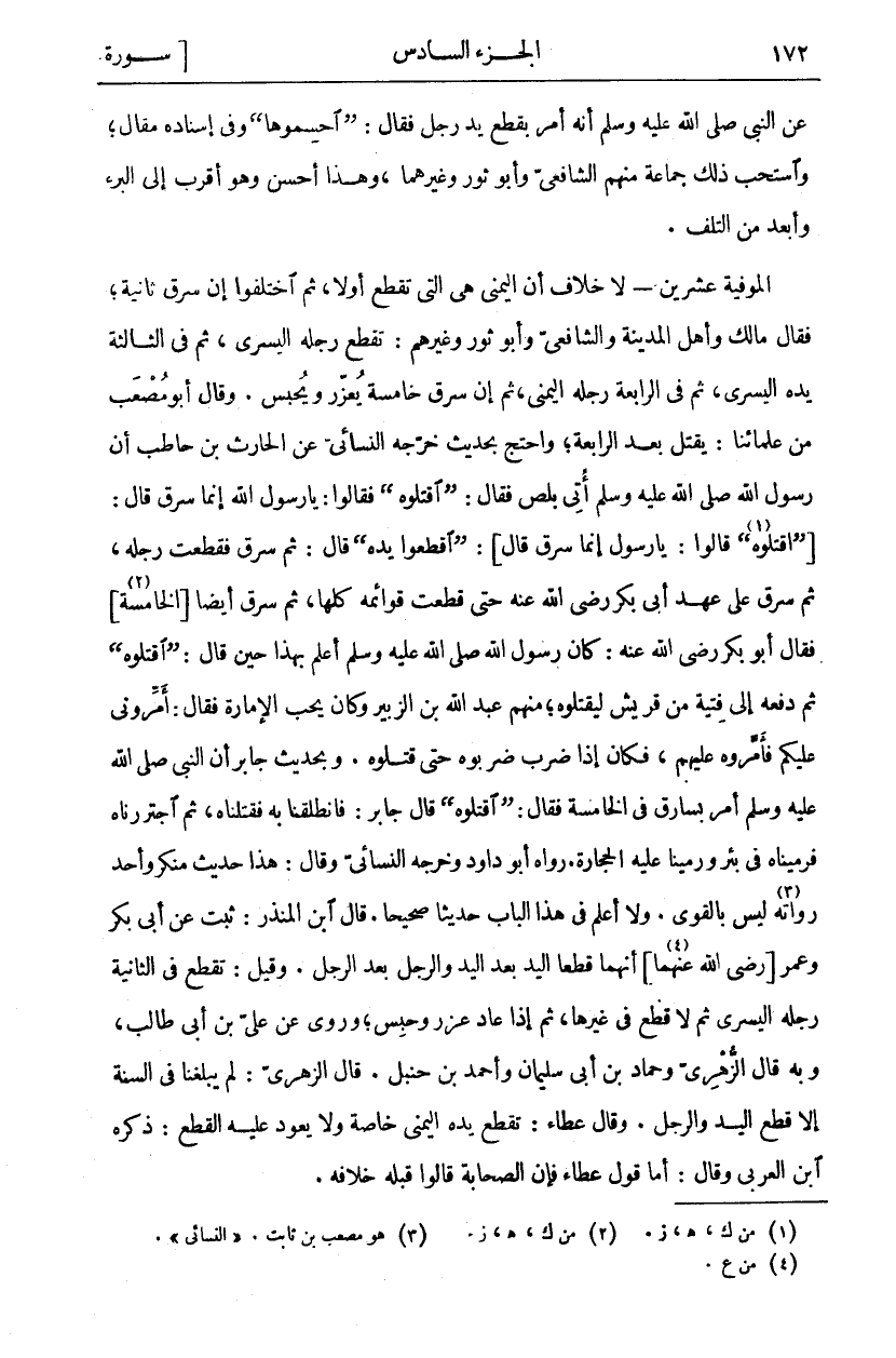 عَنِ النَّبِيِّ صَلَّى اللَّهُ عَلَيْهِ وَسَلَّمَ أَنَّهُ أَمَرَ بِقَطْعِ يَدِ رَجُلٍ فَقَالَ: (احْسِمُوهَا) وَفِي إِسْنَادِهِ مَقَالٌ، وَاسْتَحَبَّ ذَلِكَ جَمَاعَةٌ مِنْهُمِ الشَّافِعِيُّ وَأَبُو ثَوْرٍ وَغَيْرُهُمَا، وَهَذَا أَحْسَنُ وَهُوَ أَقْرَبُ إِلَى الْبُرْءِ وَأَبْعَدُ مِنَ التَّلَفِ. الْمُوَفِّيَةُ عِشْرِينَ- لَا خِلَافَ أَنَّ الْيُمْنَى هِيَ الَّتِي تُقْطَعُ أَوَّلًا، ثُمَّ اخْتَلَفُوا إِنْ سَرَقَ ثَانِيَةً، فَقَالَ مَالِكٌ وَأَهْلُ الْمَدِينَةِ وَالشَّافِعِيُّ وَأَبُو ثَوْرٍ وَغَيْرُهُمْ: تُقْطَعُ رِجْلُهُ الْيُسْرَى، ثُمَّ فِي الثَّالِثَةِ يَدُهُ الْيُسْرَى، ثُمَّ فِي الرَّابِعَةِ رِجْلُهُ الْيُمْنَى، ثُمَّ إِنْ سَرَقَ خَامِسَةً يُعَزَّرُ وَيُحْبَسُ. وَقَالَ أَبُو مُصْعَبٍ مِنْ عُلَمَائِنَا: يُقْتَلُ بَعْدَ الرَّابِعَةِ، وَاحْتَجَّ بِحَدِيثٍ خَرَّجَهُ النَّسَائِيُّ عَنِ الْحَارِثِ بْنِ حَاطِبٍ أن رسول الله صَلَّى اللَّهُ عَلَيْهِ وَسَلَّمَ أُتِيَ بِلِصٍّ فَقَالَ: (اقْتُلُوهُ) فَقَالُوا: يَا رَسُولَ اللَّهِ إِنَّمَا سَرَقَ، قَالَ:] (اقْتُلُوهُ) «١»، قَالُوا: يَا رسول إِنَّمَا سَرَقَ، قَالَ [: (اقْطَعُوا يَدَهُ)، قَالَ: ثُمَّ سَرَقَ فَقُطِعَتْ رِجْلُهُ، ثُمَّ سَرَقَ عَلَى عَهْدِ أَبِي بَكْرٍ رَضِيَ اللَّهُ عَنْهُ حَتَّى قُطِعَتْ قَوَائِمُهُ كُلُّهَا، ثُمَّ سَرَقَ أَيْضًا] الْخَامِسَةَ [«٢» فَقَالَ أَبُو بَكْرٍ رَضِيَ اللَّهُ عَنْهُ: كَانَ رَسُولُ اللَّهِ صَلَّى اللَّهُ عَلَيْهِ وَسَلَّمَ أَعْلَمَ بِهَذَا حِينَ قَالَ: (اقْتُلُوهُ) ثُمَّ دَفَعَهُ إِلَى فِتْيَةٍ مِنْ قُرَيْشٍ لِيَقْتُلُوهُ، مِنْهُمْ عَبْدُ اللَّهِ بْنُ الزُّبَيْرِ وَكَانَ يُحِبُّ الْإِمَارَةَ فَقَالَ: أَمِّرُونِي عَلَيْكُمْ فَأَمَّرُوهُ عَلَيْهِمْ، فَكَانَ إِذَا ضَرَبَ ضَرَبُوهُ حَتَّى قَتَلُوهُ. وَبِحَدِيثِ جَابِرٍ أَنَّ النَّبِيَّ صَلَّى اللَّهُ عَلَيْهِ وَسَلَّمَ أَمَرَ بِسَارِقٍ فِي الْخَامِسَةِ فَقَالَ: (اقْتُلُوهُ). قَالَ جَابِرٌ: فَانْطَلَقْنَا بِهِ فَقَتَلْنَاهُ، ثُمَّ اجْتَرَرْنَاهُ فَرَمَيْنَاهُ فِي بِئْرٍ وَرَمَيْنَا عَلَيْهِ الْحِجَارَةَ. رَوَاهُ أَبُو دَاوُدَ وَخَرَّجَهُ النَّسَائِيُّ وَقَالَ: هَذَا حَدِيثٌ مُنْكَرٌ وَأَحَدُ رُوَاتِهِ «٣» لَيْسَ بِالْقَوِيِّ. وَلَا أَعْلَمُ فِي هَذَا الْبَابِ حَدِيثًا صَحِيحًا. قَالَ ابْنُ الْمُنْذِرِ: ثَبَتَ عَنْ أَبِي بَكْرٍ وَعُمَرَ] رَضِيَ اللَّهُ عَنْهُمَا [«٤» أَنَّهُمَا قَطَعَا الْيَدَ بَعْدَ الْيَدِ وَالرِّجْلَ بَعْدَ الرِّجْلِ. وَقِيلَ: تُقْطَعُ فِي الثَّانِيَةِ رِجْلُهُ الْيُسْرَى ثُمَّ لَا قَطْعَ فِي غَيْرِهَا، ثُمَّ إِذَا عَادَ عُزِّرَ وَحُبِسَ، وَرُوِيَ عَنْ عَلِيِّ بْنِ أَبِي طَالِبٍ، وَبِهِ قَالَ الزُّهْرِيُّ وَحَمَّادُ بْنُ أَبِي سُلَيْمَانَ وَأَحْمَدُ بْنُ حَنْبَلٍ. قَالَ الزُّهْرِيُّ: لَمْ يَبْلُغْنَا فِي السُّنَّةِ إِلَّا قَطْعُ الْيَدِ وَالرِّجْلِ. وَقَالَ عَطَاءٌ: تُقْطَعُ يَدُهُ الْيُمْنَى خَاصَّةً وَلَا يَعُودُ عَلَيْهِ الْقَطْعُ: ذَكَرَهُ ابْنُ الْعَرَبِيِّ وَقَالَ: أَمَّا قَوْلُ عَطَاءٍ فإن الصحابة قالوا قبله خلافه.