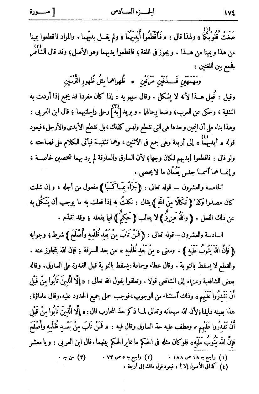 وَقِيلَ: فُعِلَ هَذَا لِأَنَّهُ لَا يُشْكِلُ. وَقَالَ سِيبَوَيْهِ: إِذَا كَانَ مُفْرَدًا قَدْ يُجْمَعُ إِذَا أَرَدْتَ بِهِ التَّثْنِيَةَ، وَحُكِيَ عَنِ الْعَرَبِ، وَضَعَا رِحَالَهُمَا. وَيُرِيدُ] بِهِ [«٣» رَحْلَيْ رَاحِلَتَيْهِمَا، قَالَ ابْنُ الْعَرَبِيِّ: وَهَذَا بِنَاءٌ عَلَى أَنَّ الْيَمِينَ وَحْدَهَا هِيَ الَّتِي تُقْطَعُ وَلَيْسَ كَذَلِكَ، بَلْ تُقْطَعُ الْأَيْدِي وَالْأَرْجُلُ، فَيَعُودُ قَوْلُهُ" أَيْدِيَهُما" «٤» إِلَى أَرْبَعَةٍ وَهِيَ جَمْعٌ فِي الِاثْنَيْنِ، وَهُمَا تَثْنِيَةٌ فَيَأْتِي الْكَلَامُ عَلَى فَصَاحَتِهِ، وَلَوْ قَالَ: فَاقْطَعُوا أَيْدِيَهُمْ لَكَانَ وَجْهًا، لِأَنَّ السَّارِقَ وَالسَّارِقَةَ لَمْ يُرِدْ بِهِمَا شَخْصَيْنِ خَاصَّةً، وَإِنَّمَا هُمَا اسْمَا جِنْسٍ يَعُمَّانِ مَا لَا يُحْصَى. الْخَامِسَةُ وَالْعِشْرُونَ- قَوْلُهُ تَعَالَى: (جَزاءً بِما كَسَبا) مَفْعُولٌ مِنْ أَجْلِهِ، وَإِنْ شِئْتَ كَانَ مَصْدَرًا وَكَذَا (نَكالًا مِنَ اللَّهِ) يُقَالُ: نَكَّلْتُ بِهِ إِذَا فَعَلْتُ بِهِ مَا يُوجِبُ أَنْ يَنْكُلَ بِهِ عَنْ ذَلِكَ الْفِعْلِ. (وَاللَّهُ عَزِيزٌ) لَا يُغَالَبُ (حَكِيمٌ) فِيمَا يَفْعَلُهُ، وَقَدْ تَقَدَّمَ. السَّادِسَةُ وَالْعِشْرُونَ- قَوْلُهُ تَعَالَى:" فَمَنْ تابَ مِنْ بَعْدِ ظُلْمِهِ وَأَصْلَحَ" شَرْطٌ، وَجَوَابُهُ" فَإِنَّ اللَّهَ يَتُوبُ عَلَيْهِ". وَمَعْنَى" مِنْ بَعْدِ ظُلْمِهِ" مِنْ بَعْدِ السَّرِقَةِ، فَإِنَّ اللَّهَ يَتَجَاوَزُ عَنْهُ. وَالْقَطْعُ لَا يَسْقُطُ بِالتَّوْبَةِ. وَقَالَ عَطَاءٌ وَجَمَاعَةٌ: يَسْقُطُ بِالتَّوْبَةِ قَبْلَ الْقُدْرَةِ عَلَى السَّارِقِ. وَقَالَهُ بَعْضُ الشَّافِعِيَّةِ وَعَزَاهُ إِلَى الشَّافِعِيِّ قَوْلًا. وَتَعَلَّقُوا بِقَوْلِ اللَّهُ تَعَالَى:" إِلَّا الَّذِينَ تابُوا مِنْ قَبْلِ أَنْ تَقْدِرُوا عَلَيْهِمْ" وَذَلِكَ اسْتِثْنَاءٌ مِنَ الْوُجُوبِ، فَوَجَبَ حَمْلُ جَمِيعِ الْحُدُودِ عَلَيْهِ. وَقَالَ عُلَمَاؤُنَا: هَذَا بِعَيْنِهِ دَلِيلُنَا، لِأَنَّ اللَّهَ سُبْحَانَهُ وَتَعَالَى لَمَّا ذَكَرَ حَدَّ الْمُحَارِبِ قَالَ:" إِلَّا الَّذِينَ تابُوا مِنْ قَبْلِ أَنْ تَقْدِرُوا عَلَيْهِمْ" وَعَطَفَ عَلَيْهِ حَدَّ السَّارِقِ وَقَالَ فِيهِ:" فَمَنْ تابَ مِنْ بَعْدِ ظُلْمِهِ وَأَصْلَحَ فَإِنَّ اللَّهَ يَتُوبُ عَلَيْهِ" فَلَوْ كَانَ مِثْلَهُ فِي الْحُكْمِ مَا غَايَرَ الْحُكْمَ بَيْنَهُمَا. قَالَ ابْنُ الْعَرَبِيِّ: وَيَا معشر