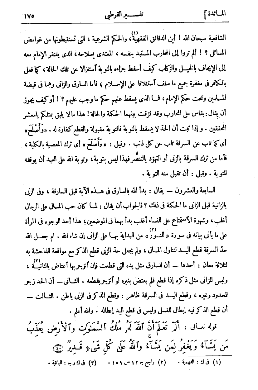 الشَّافِعِيَّةِ سُبْحَانَ اللَّهِ! أَيْنَ الدَّقَائِقُ الْفِقْهِيَّةُ «١»، وَالْحِكَمُ الشَّرْعِيَّةُ، الَّتِي تَسْتَنْبِطُونَهَا مِنْ غَوَامِضِ الْمَسَائِلِ؟! أَلَمْ تروا إلى المحارب المستبد بنفسه، المعتدى بسلاحه، الَّذِي يَفْتَقِرُ الْإِمَامُ مَعَهُ إِلَى الْإِيجَافِ بِالْخَيْلِ وَالرِّكَابِ كَيْفَ أَسْقَطَ جَزَاءَهُ بِالتَّوْبَةِ اسْتِنْزَالًا عَنْ تِلْكَ الْحَالَةِ، كَمَا فَعَلَ بِالْكَافِرِ فِي مَغْفِرَةِ جَمِيعِ مَا سَلَفَ اسْتِئْلَافًا عَلَى الْإِسْلَامِ، فَأَمَّا السَّارِقُ وَالزَّانِي وَهُمَا فِي قَبْضَةِ الْمُسْلِمِينَ وَتَحْتَ حُكْمِ الْإِمَامِ، فَمَا الَّذِي يُسْقِطُ عَنْهُمْ حُكْمَ مَا وَجَبَ عَلَيْهِمْ؟! أَوْ كَيْفَ يَجُوزُ أَنْ يُقَالَ: يُقَاسُ عَلَى الْمُحَارِبِ وَقَدْ فَرَّقَتْ بَيْنَهُمَا الْحِكْمَةُ وَالْحَالَةُ! هَذَا مَا لَا يَلِيقُ بِمِثْلِكُمْ يَا مَعْشَرَ الْمُحَقِّقِينَ. وَإِذَا ثَبَتَ أَنَّ الْحَدَّ لَا يَسْقُطُ بِالتَّوْبَةِ، فَالتَّوْبَةُ مَقْبُولَةٌ وَالْقَطْعُ كَفَّارَةٌ لَهُ." وَأَصْلَحَ" أَيْ كَمَا تَابَ عَنِ السَّرِقَةِ تَابَ عَنْ كُلِّ ذَنْبٍ. وَقِيلَ:" وَأَصْلَحَ" أَيْ تَرَكَ الْمَعْصِيَةَ بِالْكُلِّيَّةِ، فَأَمَّا مَنْ تَرَكَ السَّرِقَةَ بِالزِّنَى أَوِ التَّهَوُّدَ بِالتَّنَصُّرِ فَهَذَا لَيْسَ بِتَوْبَةٍ، وَتَوْبَةُ اللَّهِ عَلَى الْعَبْدِ أَنْ يُوَفِّقَهُ لِلتَّوْبَةِ. وَقِيلَ: أَنْ تُقْبَلَ مِنْهُ التَّوْبَةُ. السَّابِعَةُ وَالْعِشْرُونَ- يُقَالُ: بَدَأَ اللَّهُ بِالسَّارِقِ فِي هَذِهِ الْآيَةِ قَبْلَ السَّارِقَةِ، وَفِي الزِّنَى بِالزَّانِيَةِ قَبْلَ الزَّانِي مَا الْحِكْمَةُ فِي ذَلِكَ؟ فَالْجَوَابُ أَنْ يُقَالَ: لَمَّا كَانَ حُبُّ الْمَالِ عَلَى الرِّجَالِ أَغْلَبَ، وَشَهْوَةُ الِاسْتِمْتَاعِ عَلَى النِّسَاءِ أَغْلَبَ بَدَأَ بِهِمَا في الموضعين، هَذَا أَحَدُ الْوُجُوهِ فِي الْمَرْأَةِ عَلَى مَا يَأْتِي بَيَانُهُ فِي سُورَةِ" النُّورِ" «٢» مِنَ الْبِدَايَةِ بِهَا عَلَى الزَّانِي إِنْ شَاءَ اللَّهُ. ثُمَّ جَعَلَ اللَّهُ حَدَّ السَّرِقَةِ قَطْعَ الْيَدِ لِتَنَاوُلِ الْمَالِ، وَلَمْ يَجْعَلْ حَدَّ الزِّنَى قَطْعَ الذَّكَرِ مَعَ مُوَاقَعَةِ الْفَاحِشَةِ بِهِ لِثَلَاثَةِ مَعَانٍ: أَحَدُّهَا: أَنَّ لِلسَّارِقِ مِثْلَ يَدِهِ الَّتِي قُطِعَتْ فَإِنِ انْزَجَرَ بِهَا اعْتَاضَ بِالثَّانِيَةِ «٣»، وَلَيْسَ لِلزَّانِي مِثْلُ ذَكَرِهِ إِذَا قُطِعَ فَلَمْ يَعْتَضْ بِغَيْرِهِ لَوِ انْزَجَرَ بِقَطْعِهِ. الثَّانِي: أَنَّ الْحَدَّ زَجْرٌ لِلْمَحْدُودِ وَغَيْرِهِ، وَقَطْعُ الْيَدِ فِي السَّرِقَةِ ظَاهِرٌ: وَقَطْعُ الذَّكَرِ فِي الزِّنَى بَاطِنٌ. الثَّالِثُ- أَنَّ قَطْعَ الذَّكَرِ فِيهِ إِبْطَالٌ لِلنَّسْلِ وَلَيْسَ فِي قَطْعِ اليد إبطاله. والله أعلم.