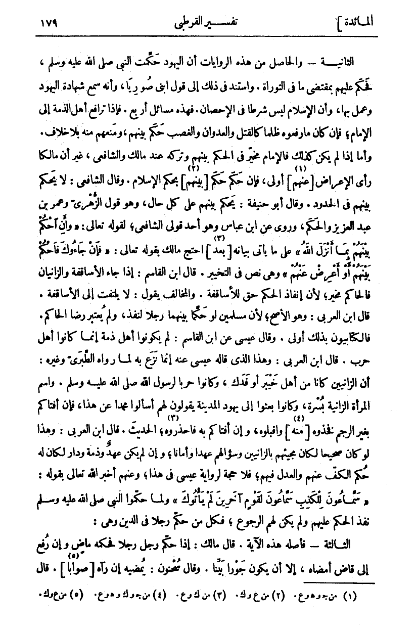 الثَّانِيَةُ- وَالْحَاصِلُ مِنْ هَذِهِ الرِّوَايَاتِ أَنَّ الْيَهُودَ حَكَّمَتِ النَّبِيَّ صَلَّى اللَّهُ عَلَيْهِ وَسَلَّمَ، فَحَكَمَ عَلَيْهِمْ بِمُقْتَضَى مَا فِي التَّوْرَاةِ. وَاسْتَنَدَ فِي ذَلِكَ إِلَى قَوْلِ ابْنَيْ صُورِيَّا، وَأَنَّهُ سَمِعَ شَهَادَةَ الْيَهُودِ وَعَمِلَ بِهَا، وَأَنَّ الْإِسْلَامَ لَيْسَ شَرْطًا فِي الْإِحْصَانِ. فَهَذِهِ مَسَائِلُ أَرْبَعٌ. فَإِذَا تَرَافَعَ أَهْلُ الذِّمَّةِ إِلَى الْإِمَامِ، فَإِنْ كَانَ مَا رَفَعُوهُ ظُلْمًا كَالْقَتْلِ وَالْعُدْوَانِ وَالْغَصْبِ حَكَمَ بَيْنَهُمْ، وَمَنَعَهُمْ مِنْهُ بِلَا خِلَافٍ. وَأَمَّا إِذَا لَمْ يَكُنْ كَذَلِكَ فَالْإِمَامُ مُخَيَّرٌ فِي الْحُكْمِ بَيْنَهُمْ وَتَرْكِهِ عِنْدَ مَالِكٍ وَالشَّافِعِيِّ، غَيْرَ أَنَّ مَالِكًا رَأَى الْإِعْرَاضَ [عَنْهُمْ] «١» أَوْلَى، فَإِنْ حَكَمَ حَكَمَ [بَيْنَهُمْ] «٢» بِحُكْمِ الْإِسْلَامِ. وَقَالَ الشَّافِعِيُّ: لَا يَحْكُمُ بَيْنَهُمْ فِي الْحُدُودِ. وَقَالَ أَبُو حَنِيفَةَ: يَحْكُمُ بَيْنَهُمْ عَلَى كُلِّ حَالٍ، وَهُوَ قَوْلُ الزُّهْرِيِّ وَعُمَرَ بْنِ عَبْدِ الْعَزِيزِ وَالْحَكَمِ، وَرُوِيَ عَنِ ابْنِ عَبَّاسٍ وَهُوَ أَحَدُ قَوْلَيِ الشَّافِعِيِّ، لِقَوْلِهِ تَعَالَى:" وَأَنِ احْكُمْ بَيْنَهُمْ بِما أَنْزَلَ اللَّهُ" [المائدة: ٤٩] عَلَى مَا يَأْتِي بَيَانُهُ [بَعْدُ] «٣»، احْتَجَّ مَالِكٌ بقوله تعالى:" فَإِنْ جاؤُكَ فَاحْكُمْ بَيْنَهُمْ أَوْ أَعْرِضْ عَنْهُمْ" [المائدة: ٤٢] وَهِيَ نَصٌّ فِي التَّخْيِيرِ. قَالَ ابْنُ الْقَاسِمِ: إِذَا جَاءَ الْأَسَاقِفَةُ وَالزَّانِيَانِ فَالْحَاكِمُ مُخَيَّرٌ، لِأَنَّ إِنْفَاذَ الْحُكْمِ حَقٌّ لِلْأَسَاقِفَةِ. وَالْمُخَالِفُ يَقُولُ: لَا يُلْتَفَتُ إِلَى الْأَسَاقِفَةِ. قَالَ ابْنُ الْعَرَبِيِّ: وَهُوَ الأصح، لان مسلمين لَوْ حَكَّمَا بَيْنَهُمَا رَجُلًا لَنَفَذَ، وَلَمْ يُعْتَبَرْ رِضَا الْحَاكِمِ. فَالْكِتَابِيُّونَ بِذَلِكَ أَوْلَى. وَقَالَ عِيسَى عَنِ ابْنِ الْقَاسِمِ: لَمْ يَكُونُوا أَهْلَ ذِمَّةٍ إِنَّمَا كَانُوا أَهْلَ حَرْبٍ. قَالَ ابْنُ الْعَرَبِيِّ: وَهَذَا الَّذِي قَالَهُ عِيسَى عَنْهُ إِنَّمَا نَزَعَ بِهِ لِمَا رَوَاهُ الطَّبَرِيُّ وَغَيْرُهُ: أَنَّ الزَّانِيَيْنِ كَانَا مِنْ أَهْلِ خَيْبَرَ أَوْ فَدَكَ، وَكَانُوا حَرْبًا لِرَسُولِ اللَّهِ صَلَّى اللَّهُ عَلَيْهِ وَسَلَّمَ. وَاسْمُ الْمَرْأَةِ الزَّانِيَةِ بُسْرَةُ، وَكَانُوا بَعَثُوا إِلَى يَهُودَ الْمَدِينَةِ يَقُولُونَ لَهُمُ اسْأَلُوا مُحَمَّدًا عَنْ هَذَا، فَإِنْ أَفْتَاكُمْ بِغَيْرِ الرَّجْمِ فَخُذُوهُ] مِنْهُ [«٤» وَاقْبَلُوهُ، وَإِنْ أَفْتَاكُمْ بِهِ فَاحْذَرُوهُ «٥»، الْحَدِيثَ. قَالَ ابْنُ الْعَرَبِيِّ: وَهَذَا لَوْ كَانَ صَحِيحًا لَكَانَ مَجِيئُهُمْ بِالزَّانِيَيْنِ وَسُؤَالُهُمْ عَهْدًا وَأَمَانًا، وَإِنْ لَمْ يكن عهد وذمة ودار لكان لَهُ حُكْمُ الْكَفِّ عَنْهُمْ وَالْعَدْلِ فِيهِمْ، فَلَا حُجَّةَ لِرِوَايَةِ عِيسَى فِي هَذَا، وَعَنْهُمْ أَخْبَرَ اللَّهُ تَعَالَى بِقَوْلِهِ:" سَمَّاعُونَ لِلْكَذِبِ سَمَّاعُونَ لِقَوْمٍ آخَرِينَ لَمْ يَأْتُوكَ" وَلَمَّا حَكَّمُوا النَّبِيَّ صَلَّى اللَّهُ عَلَيْهِ وَسَلَّمَ نَفَّذَ الْحُكْمَ عَلَيْهِمْ وَلَمْ يَكُنْ لَهُمُ الرُّجُوعُ، فَكُلُّ مَنْ حَكَّمَ رَجُلًا فِي الدِّينِ وَهِيَ: الثَّالِثَةُ- فَأَصْلُهُ هَذِهِ الْآيَةُ. قال مالك: إذا حكم رَجُلًا فَحُكْمُهُ مَاضٍ وَإِنْ رُفِعَ إِلَى قَاضٍ أَمْضَاهُ، إِلَّا أَنْ يَكُونَ جَوْرًا بَيِّنًا. وَقَالَ سحنون: يمضيه إن رآه] صوابا [«٦». قال