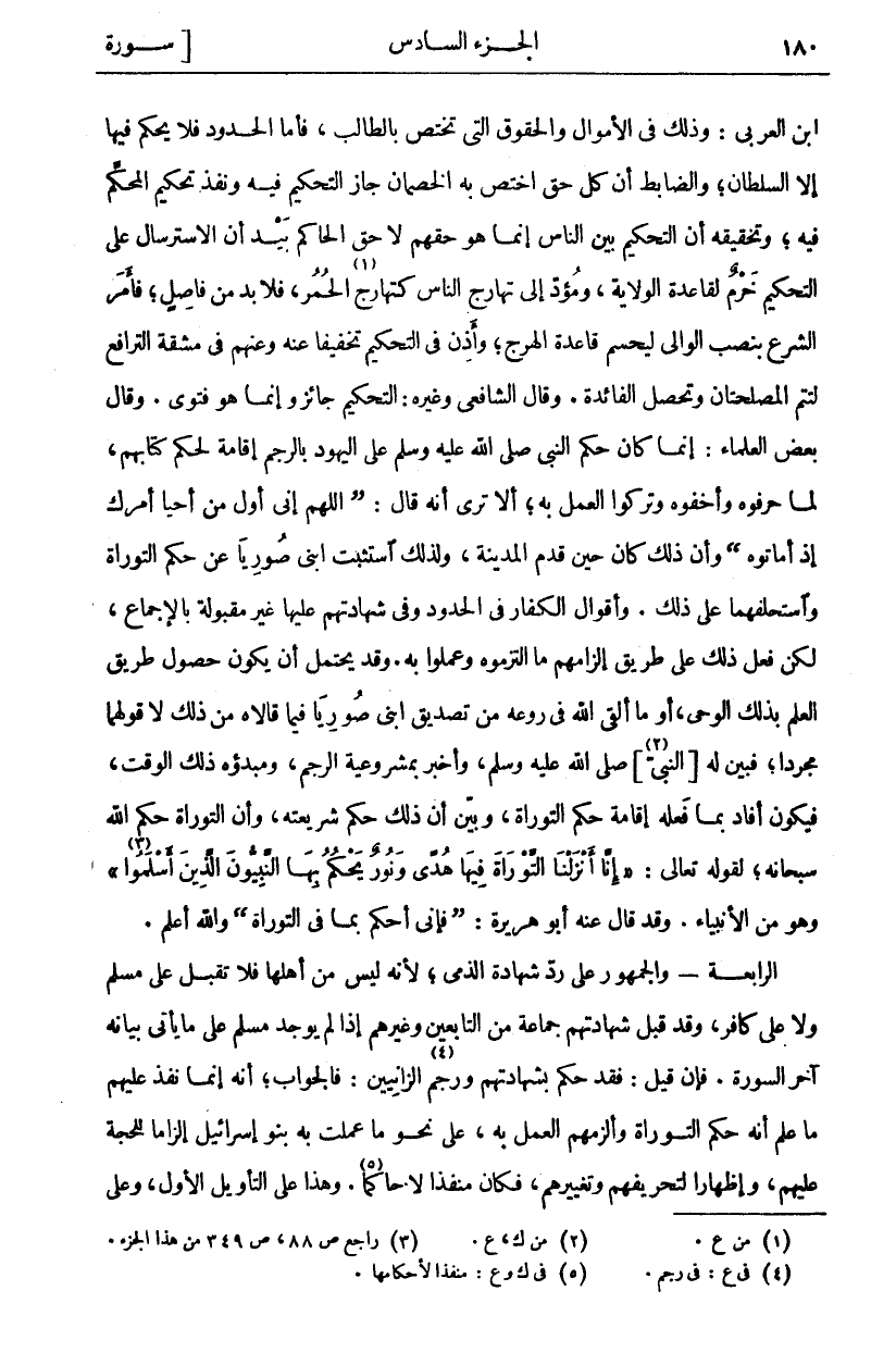ابْنُ الْعَرَبِيِّ: وَذَلِكَ فِي الْأَمْوَالِ وَالْحُقُوقِ الَّتِي تَخْتَصُّ بِالطَّالِبِ، فَأَمَّا الْحُدُودُ فَلَا يَحْكُمُ فِيهَا إِلَّا السُّلْطَانَ، وَالضَّابِطُ أَنَّ كُلَّ حَقٍّ اخْتُصَّ بِهِ الْخَصْمَانِ جَازَ التَّحْكِيمُ فِيهِ وَنُفِّذَ تَحْكِيمُ الْمُحَكَّمِ فِيهِ، وَتَحْقِيقُهُ أَنَّ التَّحْكِيمَ بَيْنَ النَّاسِ إِنَّمَا هُوَ حَقُّهُمْ لَا حَقَّ الْحَاكِمِ بَيْدَ أَنَّ الِاسْتِرْسَالَ عَلَى التَّحْكِيمِ خَرْمٌ لِقَاعِدَةِ الْوِلَايَةِ، وَمُؤَدٍّ إِلَى تَهَارُجِ النَّاسِ كَتَهَارُجِ «١» الْحُمُرِ، فَلَا بُدَّ مِنْ فَاصِلٍ، فَأَمَرَ الشَّرْعُ بِنَصْبِ الْوَالِي لِيَحْسِمَ قَاعِدَةَ الْهَرْجِ، وَأَذِنَ فِي التَّحْكِيمِ تَخْفِيفًا عَنْهُ وَعَنْهُمْ فِي مَشَقَّةِ التَّرَافُعِ لِتَتِمَّ الْمَصْلَحَتَانِ وَتَحْصُلَ الْفَائِدَةُ. وَقَالَ الشَّافِعِيُّ وَغَيْرُهُ: التَّحْكِيمُ جَائِزٌ وَإِنَّمَا هُوَ فَتْوًى. وَقَالَ بَعْضُ الْعُلَمَاءِ: إِنَّمَا كَانَ حَكَمَ النَّبِيُّ صَلَّى اللَّهُ عَلَيْهِ وَسَلَّمَ عَلَى الْيَهُودِ بِالرَّجْمِ إِقَامَةً لِحُكْمِ كِتَابِهِمْ، لِمَا حَرَّفُوهُ وَأَخْفَوْهُ وَتَرَكُوا الْعَمَلَ بِهِ، أَلَا تَرَى أَنَّهُ قَالَ: (اللَّهُمَّ إِنِّي أَوَّلُ مَنْ أَحْيَا أَمْرَكَ إِذْ أَمَاتُوهُ) وَأَنَّ ذَلِكَ كَانَ حِينَ قَدِمَ الْمَدِينَةَ، وَلِذَلِكَ اسْتَثْبَتَ ابْنَيْ صُورِيَّا عَنْ حُكْمِ التَّوْرَاةِ وَاسْتَحْلَفَهُمَا عَلَى ذَلِكَ. وَأَقْوَالُ الْكُفَّارِ فِي الْحُدُودِ وَفِي شَهَادَتِهِمْ عَلَيْهَا غَيْرُ مَقْبُولَةٍ بِالْإِجْمَاعِ، لَكِنْ فَعَلَ ذَلِكَ عَلَى طَرِيقِ إِلْزَامِهِمْ مَا الْتَزَمُوهُ وَعَمِلُوا بِهِ. وَقَدْ يَحْتَمِلُ أَنْ بكون حُصُولُ طَرِيقِ الْعِلْمِ بِذَلِكَ الْوَحْيَ، أَوْ مَا أَلْقَى اللَّهُ فِي رَوْعِهِ مِنْ تَصْدِيقِ ابْنَيْ صُورِيَّا فِيمَا قَالَاهُ مِنْ ذَلِكَ لَا قَوْلُهُمَا مُجَرَّدًا، فَبَيَّنَ لَهُ [النَّبِيُّ] «٢» صَلَّى اللَّهُ عَلَيْهِ وَسَلَّمَ، وَأَخْبَرَ بِمَشْرُوعِيَّةِ الرَّجْمِ، وَمَبْدَؤُهُ ذَلِكَ الْوَقْتُ، فَيَكُونُ أَفَادَ بِمَا فَعَلَهُ إِقَامَةَ حُكْمِ التَّوْرَاةِ، وَبَيَّنَ أَنَّ ذَلِكَ حُكْمُ شَرِيعَتِهِ، وَأَنَّ التَّوْرَاةَ حُكْمُ اللَّهِ سُبْحَانَهُ، لِقَوْلِهِ تَعَالَى:" إِنَّا أَنْزَلْنَا التَّوْراةَ فِيها هُدىً وَنُورٌ يَحْكُمُ بِهَا النَّبِيُّونَ الَّذِينَ أَسْلَمُوا" [المائدة: ٤٤] «٣» وَهُوَ مِنَ الْأَنْبِيَاءِ. وَقَدْ قَالَ عَنْهُ أَبُو هُرَيْرَةَ: (فَإِنِّي أَحْكُمُ بِمَا فِي التَّوْرَاةِ) وَاللَّهُ أَعْلَمُ. الرَّابِعَةُ- وَالْجُمْهُورُ عَلَى رَدِّ شَهَادَةِ الذِّمِّيِّ، لِأَنَّهُ لَيْسَ مِنْ أَهْلِهَا فَلَا تُقْبَلُ عَلَى مُسْلِمٍ وَلَا عَلَى كَافِرٍ، وَقَدْ قَبِلَ شَهَادَتَهُمْ جماعة من التابعين وغيرهم إذا لَمْ يُوجَدْ مُسْلِمٌ عَلَى مَا يَأْتِي بَيَانُهُ آخِرَ السُّورَةِ. فَإِنْ قِيلَ: فَقَدْ حَكَمَ بِشَهَادَتِهِمْ وَرَجَمَ الزَّانِيَيْنِ «٤»: فَالْجَوَابُ، أَنَّهُ إِنَّمَا نَفَّذَ عَلَيْهِمْ مَا عَلِمَ أَنَّهُ حُكْمُ التَّوْرَاةِ وَأَلْزَمَهُمُ الْعَمَلَ بِهِ، عَلَى نَحْوِ مَا عَمِلَتْ بِهِ بَنُو إِسْرَائِيلَ إِلْزَامًا لِلْحُجَّةِ عَلَيْهِمْ، وَإِظْهَارًا لِتَحْرِيفِهِمْ وَتَغْيِيرِهِمْ، فَكَانَ مُنَفِّذًا لَا حَاكِمًا «٥». وَهَذَا عَلَى التَّأْوِيلِ الأول، وعلى
