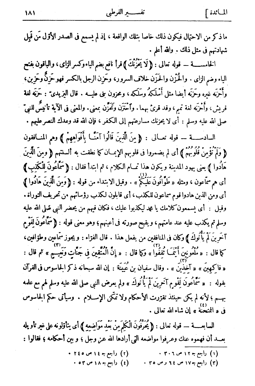 مَا ذُكِرَ مِنِ الِاحْتِمَالِ فَيَكُونُ ذَلِكَ خَاصًّا بِتِلْكَ الْوَاقِعَةِ، إِذْ لَمْ يُسْمَعْ فِي الصَّدْرِ الْأَوَّلِ مَنْ قَبِلَ شَهَادَتَهُمْ فِي مِثْلِ ذَلِكَ. وَاللَّهُ أَعْلَمُ. الْخَامِسَةُ- قَوْلُهُ تَعَالَى:" لَا يَحْزُنْكَ" قَرَأَ نَافِعٌ بِضَمِّ الْيَاءِ وَكَسْرِ الزَّايِ، وَالْبَاقُونَ بِفَتْحِ الْيَاءِ وَضَمِّ الزَّايِ. وَالْحُزْنُ وَالْحَزَنُ خِلَافُ السُّرُورِ، وَحَزِنَ الرَّجُلُ بِالْكَسْرِ فَهُوَ حَزِنٌ وَحَزِينٌ، وَأَحْزَنَهُ غَيْرُهُ وَحَزَنَهُ أَيْضًا مِثْلُ أَسْلَكَهُ وَسَلَكَهُ، وَمَحْزُونٌ بُنِيَ عَلَيْهِ. قَالَ الْيَزِيدِيُّ: حَزَنَهُ لُغَةُ قُرَيْشٍ، وَأَحْزَنَهُ لُغَةْ تَمِيمٍ، وَقَدْ قُرِئَ بِهِمَا. وَاحْتَزَنَ وَتَحَزَّنَ بِمَعْنًى. وَالْمَعْنَى فِي الْآيَةِ تَأْنِيسٌ لِلنَّبِيِّ صَلَّى اللَّهُ عَلَيْهِ وَسَلَّمَ: أَيْ لَا يَحْزُنْكَ مُسَارَعَتُهُمْ إِلَى الْكُفْرِ، فَإِنَّ اللَّهَ قَدْ وَعَدَكَ النَّصْرَ عَلَيْهِمْ. السَّادِسَةُ- قَوْلُهُ تَعَالَى: (مِنَ الَّذِينَ قالُوا آمَنَّا بِأَفْواهِهِمْ) وَهُمُ الْمُنَافِقُونَ (وَلَمْ تُؤْمِنْ قُلُوبُهُمْ) أَيْ لَمْ يُضْمِرُوا فِي قُلُوبِهِمُ الْإِيمَانَ كَمَا نَطَقَتْ بِهِ أَلْسِنَتُهُمْ (وَمِنَ الَّذِينَ هادُوا) يَعْنِي يَهُودَ الْمَدِينَةِ وَيَكُونُ هَذَا تَمَامَ الْكَلَامِ، ثُمَّ ابْتَدَأَ فَقَالَ" سَمَّاعُونَ لِلْكَذِبِ" أَيْ هم سماعون، ومثله" طَوَّافُونَ عَلَيْكُمْ" «١»] النور: ٥٨]. وَقِيلَ الِابْتِدَاءُ مِنْ قَوْلِهِ:" وَمِنَ الَّذِينَ هادُوا" أي وَمِنَ الذِينَ هَادُوا قَوْمٌ سَمَّاعُونَ لِلْكَذِبِ، أَيْ قَابِلُونَ لِكَذِبِ رُؤَسَائِهِمْ مِنْ تَحْرِيفِ التَّوْرَاةِ. وَقِيلَ: أَيْ يَسْمَعُونَ كَلَامَكَ يَا مُحَمَّدُ لِيَكْذِبُوا عَلَيْكَ، فَكَانَ فِيهِمْ مَنْ يَحْضُرُ النَّبِيَّ صَلَّى اللَّهُ عَلَيْهِ وَسَلَّمَ ثُمَّ يَكْذِبُ عَلَيْهِ عِنْدَ عَامَّتِهِمْ، وَيُقَبِّحُ صُورَتَهُ فِي أَعْيُنِهِمْ، وَهُوَ مَعْنَى قَوْلِهِ (سَمَّاعُونَ لِقَوْمٍ آخَرِينَ لَمْ يَأْتُوكَ) وَكَانَ فِي الْمُنَافِقِينَ مَنْ يَفْعَلُ هَذَا. قَالَ الْفَرَّاءُ: وَيَجُوزُ سَمَّاعِينَ وَطَوَّافِينَ، كَمَا قَالَ:" مَلْعُونِينَ أَيْنَما ثُقِفُوا" «٢» وَكَمَا قَالَ:" إِنَّ الْمُتَّقِينَ فِي جَنَّاتٍ وَنَعِيمٍ" «٣»] الطور: ١٧] ثُمَّ قَالَ:" فاكِهِينَ"" آخِذِينَ" «٤». وَقَالَ سُفْيَانُ بْنُ عُيَيْنَةَ: إِنَّ اللَّهَ سُبْحَانَهُ ذَكَرَ الْجَاسُوسَ فِي الْقُرْآنِ بِقَوْلِهِ:" سَمَّاعُونَ لِقَوْمٍ آخَرِينَ لَمْ يَأْتُوكَ" وَلَمْ يَعْرِضِ النَّبِيُّ صَلَّى اللَّهُ عَلَيْهِ وَسَلَّمَ لَهُمْ مَعَ عِلْمِهِ بِهِمْ، لِأَنَّهُ لَمْ يَكُنْ حِينَئِذٍ تَقَرَّرَتِ الْأَحْكَامُ وَلَا تَمَكَّنَ الْإِسْلَامُ. وَسَيَأْتِي حُكْمُ الْجَاسُوسِ فِي" الْمُمْتَحِنَةِ" «٥» إِنْ شَاءَ اللَّهُ تَعَالَى. السَّابِعَةُ- قَوْلُهُ تَعَالَى: (يُحَرِّفُونَ الْكَلِمَ مِنْ بَعْدِ مَواضِعِهِ) أَيْ يَتَأَوَّلُونَهُ عَلَى غَيْرِ تَأْوِيلِهِ بَعْدَ أَنْ فَهِمُوهُ عَنْكَ وَعَرَفُوا مَوَاضِعَهُ الَّتِي أَرَادَهَا اللَّهُ عَزَّ وَجَلَّ، وَبَيَّنَ أَحْكَامَهُ، فَقَالُوا: