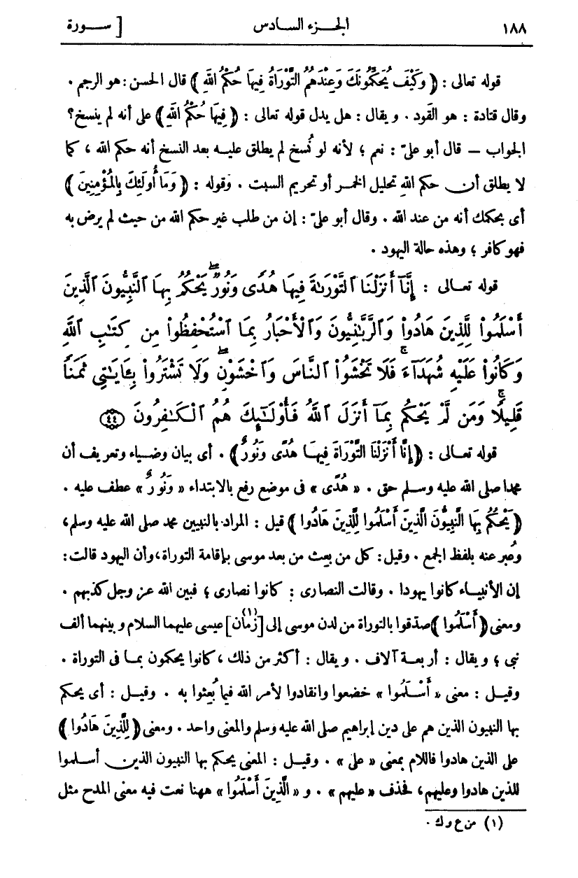 قوله تَعَالَى: (إِنَّا أَنْزَلْنَا التَّوْراةَ فِيها هُدىً وَنُورٌ). أَيْ بَيَانٌ وَضِيَاءٌ وَتَعْرِيفٌ أَنَّ مُحَمَّدًا صَلَّى اللَّهُ عَلَيْهِ وَسَلَّمَ حَقٌّ." هُدىً" فِي مَوْضِعِ رَفْعٍ بِالِابْتِدَاءِ" وَنُورٌ" عَطْفٌ عَلَيْهِ (يَحْكُمُ بِهَا النَّبِيُّونَ الَّذِينَ أَسْلَمُوا لِلَّذِينَ هادُوا) قِيلَ: الْمُرَادُ بِالنَّبِيِّينَ مُحَمَّدٌ صَلَّى اللَّهُ عَلَيْهِ وَسَلَّمَ، وَعَبَّرَ عَنْهُ بِلَفْظِ الْجَمْعِ. وَقِيلَ: كُلُّ مَنْ بُعِثَ مِنْ بَعْدِ مُوسَى بِإِقَامَةِ التَّوْرَاةِ، وَأَنَّ الْيَهُودَ قَالَتْ: إِنَّ الْأَنْبِيَاءَ كَانُوا يَهُودًا. وَقَالَتْ النَّصَارَى: كَانُوا نَصَارَى، فَبَيَّنَ اللَّهُ عَزَّ وَجَلَّ كَذِبَهُمْ. وعمني (أَسْلَمُوا) صَدَّقُوا بِالتَّوْرَاةِ مِنْ لَدُنْ مُوسَى إِلَى] زَمَانِ [«١» عِيسَى عَلَيْهِمَا السَّلَامُ وَبَيْنَهُمَا أَلْفُ نَبِيٍّ، وَيُقَالُ: أَرْبَعَةُ آلَافٍ. وَيُقَالُ: أَكْثَرُ مِنْ ذَلِكَ، كَانُوا يَحْكُمُونَ بِمَا فِي التَّوْرَاةِ. وَقِيلَ: مَعْنَى" أَسْلَمُوا" خَضَعُوا وَانْقَادُوا لِأَمْرِ اللَّهِ فِيمَا بُعِثُوا بِهِ. وَقِيلَ: أَيْ يَحْكُمُ بِهَا النَّبِيُّونَ الَّذِينَ هُمْ عَلَى دِينِ إِبْرَاهِيمَ صَلَّى اللَّهُ عَلَيْهِ وَسَلَّمَ وَالْمَعْنَى وَاحِدٌ. وَمَعْنَى" (لِلَّذِينَ هادُوا) " عَلَى الَّذِينَ هَادُوا فَاللَّامُ بِمَعْنَى (عَلَى). وَقِيلَ: الْمَعْنَى يَحْكُمُ بِهَا النَّبِيُّونَ الَّذِينَ أَسْلَمُوا لِلَّذِينَ هَادُوا وعليهم، فحذف (عليهم). و" الَّذِينَ أَسْلَمُوا" هاهنا نعت فيه معنى المدح مثل