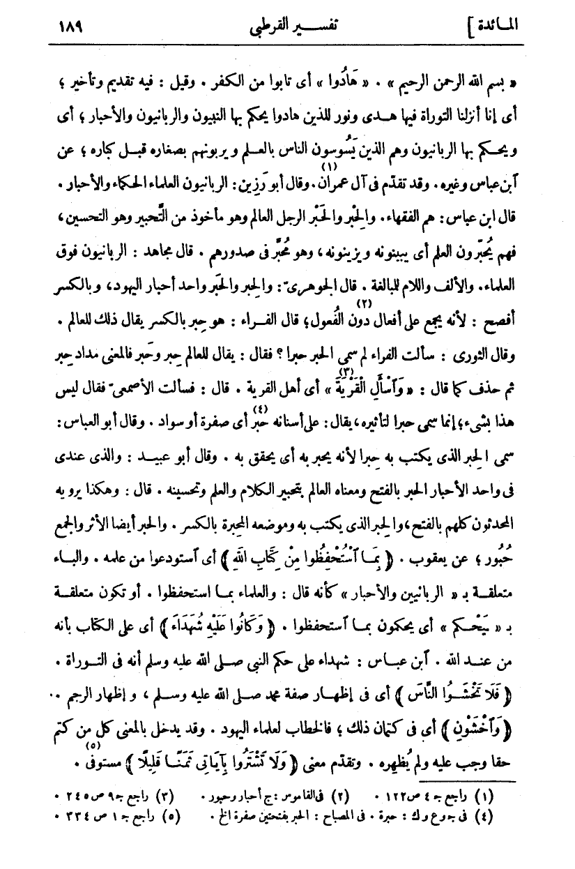 " بِسْمِ اللَّهِ الرَّحْمنِ الرَّحِيمِ"." هادُوا" أَيْ تَابُوا مِنَ الْكُفْرِ. وَقِيلَ: فِيهِ تَقْدِيمٌ وَتَأْخِيرٌ، أَيْ إِنَّا أَنْزَلْنَا التَّوْرَاةَ فِيهَا هُدًى وَنُورٌ لِلَّذِينَ هَادُوا يَحْكُمُ بِهَا النَّبِيُّونَ وَالرَّبَّانِيُّونَ وَالْأَحْبَارُ، أَيْ وَيَحْكُمُ بِهَا الرَّبَّانِيُّونَ وَهُمُ الَّذِينَ يَسُوسُونَ النَّاسَ بِالْعِلْمِ وَيُرَبُّونَهُمْ بِصِغَارِهِ قَبْلَ كِبَارِهِ، عَنِ ابْنِ عَبَّاسٍ وَغَيْرِهِ. وَقَدْ تَقَدَّمَ فِي آلِ عِمْرَانَ «١». وَقَالَ أَبُو رَزِينٍ: الرَّبَّانِيُّونَ الْعُلَمَاءُ الْحُكَمَاءُ وَالْأَحْبَارُ. قَالَ ابْنُ عَبَّاسٍ: هُمُ الْفُقَهَاءُ: وَالْحِبْرُ وَالْحَبْرُ الرجل العالم وهو مأخوذ من الحبير وَهُوَ التَّحْسِينُ، فَهُمْ يُحَبِّرُونَ الْعِلْمَ أَيْ يُبَيِّنُونَهُ وَيُزَيِّنُونَهُ، وَهُوَ مُحَبَّرٌ فِي صُدُورِهِمْ. قَالَ مُجَاهِدٌ: الرَّبَّانِيُّونَ فَوْقَ الْعُلَمَاءِ. وَالْأَلِفُ وَاللَّامُ لِلْمُبَالَغَةِ. قَالَ الْجَوْهَرِيُّ: وَالْحِبْرُ وَالْحَبْرُ وَاحِدُ أَحْبَارِ الْيَهُودِ، وَبِالْكَسْرِ أَفْصَحُ: لِأَنَّهُ يُجْمَعُ عَلَى أَفْعَالٍ دُونَ «٢» الْفُعُولِ، قَالَ الْفَرَّاءُ: هُوَ حِبْرٌ بِالْكَسْرِ يُقَالُ ذَلِكَ لِلْعَالِمِ. وَقَالَ الثَّوْرِيُّ: سَأَلْتُ الْفَرَّاءَ لِمَ سُمِّيَ الْحِبْرُ حِبْرًا؟ فَقَالَ: يُقَالُ لِلْعَالِمِ حِبْرٌ وَحَبْرٌ فَالْمَعْنَى مِدَادُ حِبْرٍ ثُمَّ حُذِفَ كَمَا قَالَ:" وَسْئَلِ الْقَرْيَةَ" «٣» [يوسف: ٨٢] أَيْ أَهْلَ الْقَرْيَةِ. قَالَ: فَسَأَلْتُ الْأَصْمَعِيَّ فَقَالَ لَيْسَ هَذَا بِشَيْءٍ، إِنَّمَا سُمِّيَ حِبْرًا لِتَأْثِيرِهِ، يُقَالُ: عَلَى أَسْنَانِهِ حِبْرٌ «٤» أَيْ صُفْرَةٌ أَوْ سَوَادٌ. وَقَالَ أَبُو الْعَبَّاسِ: سُمِّيَ الْحِبْرُ الَّذِي يُكْتَبُ بِهِ حِبْرًا لِأَنَّهُ يُحْبَرُ بِهِ أَيْ يُحَقَّقُ بِهِ. وَقَالَ أَبُو عُبَيْدٍ: وَالَّذِي عِنْدِي فِي وَاحِدِ الْأَحْبَارِ الْحَبْرُ بِالْفَتْحِ وَمَعْنَاهُ الْعَالِمُ بِتَحْبِيرِ الْكَلَامِ وَالْعِلْمِ وَتَحْسِينِهِ. قَالَ: وَهَكَذَا يَرْوِيهِ الْمُحَدِّثُونَ كُلُّهُمْ بِالْفَتْحِ، وَالْحِبْرُ الَّذِي يُكْتَبُ بِهِ وَمَوْضِعُهُ الْمِحْبَرَةُ بِالْكَسْرِ. وَالْحِبْرُ أَيْضًا الْأَثَرُ وَالْجَمْعُ حُبُورٌ، عَنْ يَعْقُوبَ. (بِمَا اسْتُحْفِظُوا مِنْ كِتابِ اللَّهِ) أَيِ اسْتُوْدِعُوا مِنْ عِلْمِهِ. وَالْبَاءُ مُتَعَلِّقَةٌ ب" الرَّبَّانِيُّونَ وَالْأَحْبارُ" كَأَنَّهُ قَالَ: وَالْعُلَمَاءُ بِمَا اسْتُحْفِظُوا. أَوْ تَكُونُ مُتَعَلِّقَةً بِ"- يَحْكُمُ" أَيْ يَحْكُمُونَ بِمَا اسْتُحْفِظُوا. (وَكانُوا عَلَيْهِ شُهَداءَ) أَيْ عَلَى الْكِتَابِ بأنه مِنْ عِنْدِ اللَّهِ. ابْنُ عَبَّاسٍ: شُهَدَاءُ عَلَى حُكْمِ النَّبِيِّ صَلَّى اللَّهُ عَلَيْهِ وَسَلَّمَ أَنَّهُ فِي التَّوْرَاةِ (فَلا تَخْشَوُا النَّاسَ) أَيْ فِي إِظْهَارِ صِفَةِ مُحَمَّدٍ صَلَّى اللَّهُ عَلَيْهِ وَسَلَّمَ، وَإِظْهَارِ الرَّجْمِ (وَاخْشَوْنِ) أَيْ فِي كِتْمَانِ ذَلِكَ، فَالْخِطَابُ لِعُلَمَاءِ الْيَهُودِ. وَقَدْ يَدْخُلُ بِالْمَعْنَى كُلُّ مَنْ كَتَمَ حَقًّا وَجَبَ عَلَيْهِ وَلَمْ يُظْهِرْهُ. وَتَقَدَّمَ مَعْنَى" وَلا تَشْتَرُوا بِآياتِي ثَمَناً قَلِيلًا" مستوفى «٥».