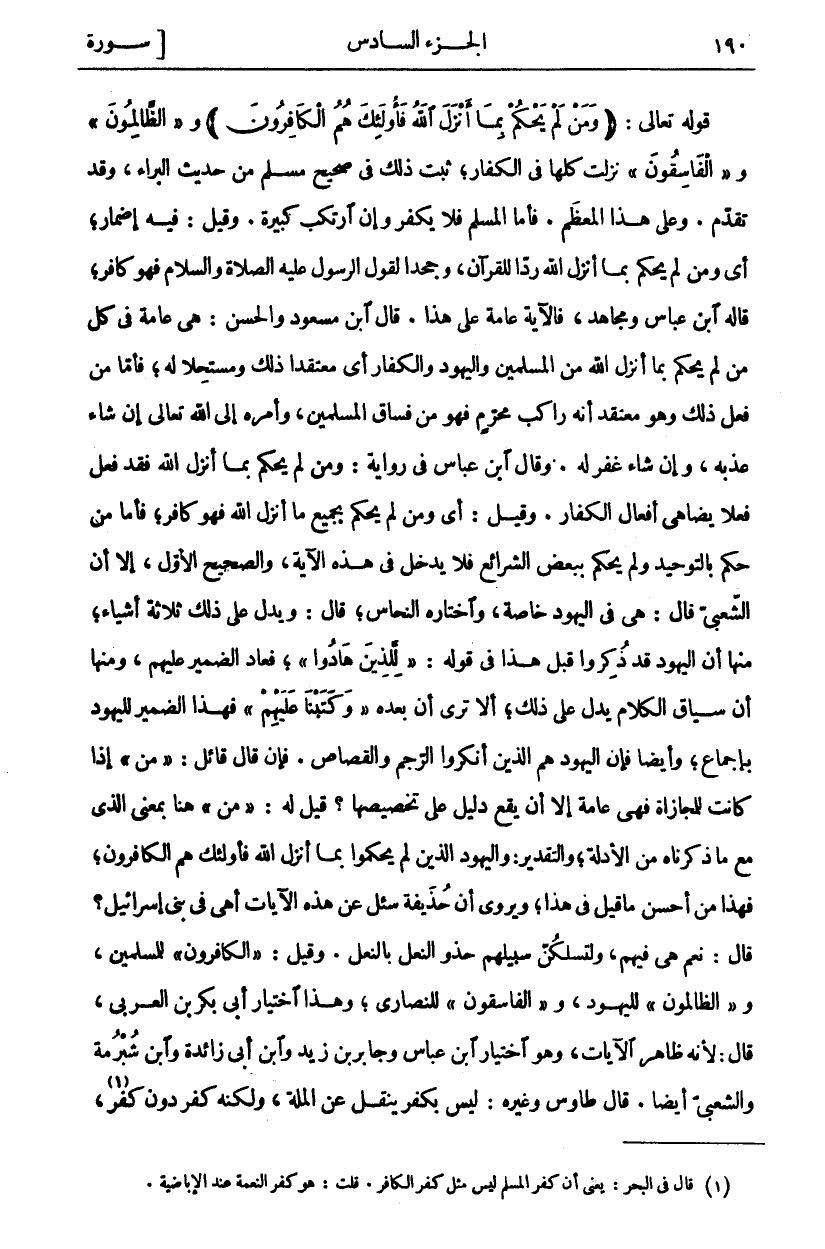 قَوْلُهُ تَعَالَى: (وَمَنْ لَمْ يَحْكُمْ بِما أَنْزَلَ اللَّهُ فَأُولئِكَ هُمُ الْكافِرُونَ) و (الظَّالِمُونَ) و (الْفاسِقُونَ) نَزَلَتْ كُلُّهَا فِي الْكُفَّارِ، ثَبَتَ ذَلِكَ فِي صَحِيحِ مُسْلِمٍ مِنْ حَدِيثِ الْبَرَاءِ، وَقَدْ تَقَدَّمَ. وَعَلَى هَذَا الْمُعْظَمِ. فَأَمَّا الْمُسْلِمُ فَلَا يَكْفُرُ وَإِنِ ارْتَكَبَ كَبِيرَةً. وَقِيلَ: فِيهِ إِضْمَارٌ، أَيْ وَمَنْ لَمْ يَحْكُمْ بِمَا أَنْزَلَ اللَّهُ رَدًّا لِلْقُرْآنِ، وَجَحْدًا لِقَوْلِ الرَّسُولِ عَلَيْهِ الصَّلَاةُ وَالسَّلَامُ فَهُوَ كَافِرٌ، قَالَهُ ابْنُ عَبَّاسٍ وَمُجَاهِدٌ، فَالْآيَةُ عَامَّةٌ عَلَى هَذَا. قَالَ ابْنُ مَسْعُودٍ وَالْحَسَنُ: هِيَ عَامَّةٌ فِي كُلِّ مَنْ لَمْ يَحْكُمْ بِمَا أَنْزَلَ اللَّهُ مِنَ الْمُسْلِمِينَ وَالْيَهُودِ وَالْكُفَّارِ أَيْ مُعْتَقِدًا ذَلِكَ وَمُسْتَحِلًّا لَهُ، فَأَمَّا مَنْ فَعَلَ ذَلِكَ وَهُوَ مُعْتَقِدٌ أَنَّهُ رَاكِبُ مُحَرَّمٍ فَهُوَ مِنْ فُسَّاقِ الْمُسْلِمِينَ، وَأَمْرُهُ إِلَى اللَّهِ تَعَالَى إِنْ شَاءَ عَذَّبَهُ، وَإِنْ شَاءَ غَفَرَ لَهُ. وَقَالَ ابْنُ عَبَّاسٍ فِي رِوَايَةٍ: وَمَنْ لَمْ يَحْكُمْ بِمَا أَنْزَلَ اللَّهُ فَقَدْ فَعَلَ فِعْلًا يُضَاهِي أَفْعَالَ الْكُفَّارِ. وَقِيلَ: أَيْ وَمَنْ لَمْ يَحْكُمْ بِجَمِيعِ مَا أَنْزَلَ اللَّهُ فَهُوَ كَافِرٌ، فَأَمَّا مَنْ حَكَمَ بِالتَّوْحِيدِ وَلَمْ يَحْكُمْ بِبَعْضِ الشَّرَائِعِ فَلَا يَدْخُلُ فِي هَذِهِ الْآيَةِ، وَالصَّحِيحُ الْأَوَّلُ، إِلَّا أَنَّ الشَّعْبِيَّ قَالَ: هِيَ فِي الْيَهُودِ خَاصَّةً، وَاخْتَارَهُ النَّحَّاسُ، قَالَ: وَيَدُلُّ عَلَى ذَلِكَ ثَلَاثَةُ أَشْيَاءَ، مِنْهَا أَنَّ الْيَهُودَ قَدْ ذُكِرُوا قَبْلَ هَذَا فِي قَوْلِهِ:" لِلَّذِينَ هادُوا"، فَعَادَ الضَّمِيرُ عَلَيْهِمْ، وَمِنْهَا أَنَّ سِيَاقَ الْكَلَامِ يَدُلُّ عَلَى ذَلِكَ، أَلَا تَرَى أَنَّ بَعْدَهُ" وَكَتَبْنا عَلَيْهِمْ" فَهَذَا الضَّمِيرُ لِلْيَهُودِ بِإِجْمَاعٍ، وَأَيْضًا فَإِنَّ الْيَهُودَ هُمُ الَّذِينَ أَنْكَرُوا الرَّجْمَ وَالْقِصَاصَ. فَإِنْ قَالَ قَائِلٌ:" مَنْ" إِذَا كَانَتْ لِلْمُجَازَاةِ فَهِيَ عَامَّةٌ إِلَّا أَنْ يَقَعَ دَلِيلٌ على تخصيصها؟ قيل له:" فَمَنْ" هُنَا بِمَعْنَى الَّذِي مَعَ مَا ذَكَرْنَاهُ مِنَ الْأَدِلَّةِ، وَالتَّقْدِيرُ: وَالْيَهُودُ الَّذِينَ لَمْ يَحْكُمُوا بِمَا أَنْزَلَ اللَّهُ فَأُولَئِكَ هُمُ الْكَافِرُونَ، فَهَذَا مِنْ أَحْسَنِ مَا قِيلَ فِي هَذَا، وَيُرْوَى أَنَّ حُذَيْفَةَ سُئِلَ عَنْ هَذِهِ الْآيَاتِ أَهِيَ فِي بَنِي إِسْرَائِيلَ؟ قَالَ: نَعَمْ هِيَ فِيهِمْ، وَلَتَسْلُكُنَّ سَبِيلَهُمْ حَذْوَ النَّعْلِ بِالنَّعْلِ. وَقِيلَ:" الْكافِرُونَ" لِلْمُسْلِمِينَ، و" الظَّالِمُونَ" لليهود، و" الَفاسِقُونَ" لِلنَّصَارَى، وَهَذَا اخْتِيَارُ أَبِي بَكْرِ بْنِ الْعَرَبِيِّ، قَالَ: لِأَنَّهُ ظَاهِرُ الْآيَاتِ. وَهُوَ اخْتِيَارُ ابْنِ عَبَّاسٍ وَجَابِرِ بْنِ زَيْدٍ وَابْنِ أَبِي زَائِدَةَ وابن شبرمة والشعب أَيْضًا. قَالَ طَاوُسٌ وَغَيْرُهُ: لَيْسَ بِكُفْرٍ يَنْقُلُ عن الملة، ولكنه كفر دون كفر، «١»