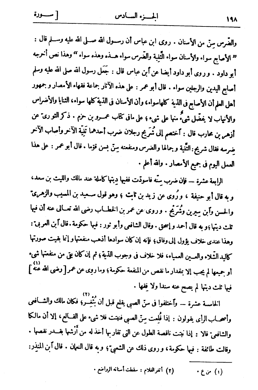وَالضِّرْسُ سِنٌّ مِنَ الْأَسْنَانِ. رَوَى ابْنِ عَبَّاسٍ أَنَّ رَسُولَ اللَّهِ صَلَّى اللَّهُ عَلَيْهِ وَسَلَّمَ قَالَ: (الْأَصَابِعُ سَوَاءٌ وَالْأَسْنَانُ سَوَاءٌ الثَّنِيَّةُ وَالضِّرْسُ سَوَاءٌ هَذِهِ وَهَذِهِ سَوَاءٌ) وَهَذَا نَصٌّ أَخْرَجَهُ أَبُو دَاوُدَ. وَرَوَى أَبُو دَاوُدَ أَيْضًا عَنِ ابْنِ عَبَّاسٍ قَالَ: جَعَلَ رَسُولُ اللَّهِ صَلَّى اللَّهُ عَلَيْهِ وَسَلَّمَ أَصَابِعَ الْيَدَيْنِ وَالرِّجْلَيْنِ سَوَاءً. قَالَ أَبُو عُمَرَ: عَلَى هَذِهِ الْآثَارِ جَمَاعَةُ فُقَهَاءِ الْأَمْصَارِ وَجُمْهُورُ أَهْلِ الْعِلْمِ أَنَّ الْأَصَابِعَ فِي الدِّيَةِ كُلُّهَا سَوَاءٌ، وَأَنَّ الْأَسْنَانَ فِي الدِّيَةِ كُلُّهَا سَوَاءٌ، الثَّنَايَا وَالْأَضْرَاسُ وَالْأَنْيَابُ لَا يفضل شي منها على شي، عَلَى مَا فِي كِتَابِ عَمْرِو بْنِ حَزْمٍ. ذَكَرَ الثَّوْرِيُّ عَنْ أَزْهَرَ بْنِ مُحَارِبٍ قَالَ: اخْتَصَمَ إِلَى شُرَيْحٍ رَجُلَانِ ضَرَبَ أَحَدُهُمَا ثَنِيَّةَ الْآخَرِ وَأَصَابَ الْآخَرُ ضِرْسَهُ فَقَالَ شُرَيْحٌ: الثَّنِيَّةُ وَجَمَالُهَا وَالضِّرْسُ وَمَنْفَعَتُهُ سِنٌّ بِسِنٍّ قُوِّمَا. قَالَ أَبُو عُمَرَ: عَلَى هَذَا الْعَمَلُ الْيَوْمَ فِي جَمِيعِ الْأَمْصَارِ. وَاللَّهُ أَعْلَمُ. الرَّابِعَةَ عَشْرَةَ- فَإِنْ ضَرَبَ سِنَّهُ فَاسْوَدَّتْ فَفِيهَا دِيَتُهَا كَامِلَةً عِنْدَ مَالِكٍ وَاللَّيْثِ بْنِ سَعْدٍ، وَبِهِ قَالَ أَبُو حَنِيفَةَ، وَرُوِيَ عَنْ زَيْدِ بْنِ ثَابِتٍ، وَهُوَ قَوْلُ سَعِيدِ بْنِ الْمُسَيَّبِ وَالزُّهْرِيِّ وَالْحَسَنِ وَابْنِ سِيرِينَ وَشُرَيْحٍ. وَرُوِيَ عَنْ عُمَرَ بْنِ الْخَطَّابِ رَضِيَ اللَّهُ تَعَالَى عَنْهُ أَنَّ فِيهَا ثُلُثَ دِيَتِهَا، وَبِهِ قَالَ أَحْمَدُ وَإِسْحَاقُ. وَقَالَ الشَّافِعِيُّ وَأَبُو ثَوْرٍ: فِيهَا حُكُومَةٌ. قَالَ ابْنُ الْعَرَبِيِّ: وهذا عندي خلاف يؤول إِلَى وِفَاقٍ، فَإِنَّهُ إِنْ كَانَ سَوَادُهَا أَذْهَبَ مَنْفَعَتَهَا وَإِنَّمَا بَقِيَتْ صُورَتُهَا كَالْيَدِ الشَّلَّاءِ وَالْعَيْنِ الْعَمْيَاءِ، فَلَا خِلَافَ فِي وُجُوبِ الدِّيَةِ، ثُمَّ إن كان بقي من منفعتها شي أو جميعه لَمْ يَجِبْ إِلَّا بِمِقْدَارِ مَا نَقَصَ مِنَ الْمَنْفَعَةِ حُكُومَةٌ، وَمَا رُوِيَ عَنْ عُمَرَ] رَضِيَ اللَّهُ عَنْهُ [«١» فِيهَا ثُلُثُ دِيَتِهَا لَمْ يَصِحْ عَنْهُ سَنَدًا وَلَا فِقْهًا. الْخَامِسَةَ عَشْرَةَ- وَاخْتَلَفُوا فِي سِنِّ الصَّبِيِّ يُقْلَعُ قَبْلَ أَنْ يُثْغِرَ «٢»، فَكَانَ مَالِكٌ وَالشَّافِعِيُّ وَأَصْحَابُ الرَّأْيِ يَقُولُونَ: إِذَا قلعت سن الصبي فنبتت فلا شي عَلَى الْقَالِعِ، إِلَّا أَنَّ مَالِكًا وَالشَّافِعِيَّ قَالَا: إِذَا نَبَتَتْ نَاقِصَةَ الطُّولِ عَنِ التِي تُقَارِبُهَا أُخِذَ لَهُ مِنْ أَرْشِهَا بِقَدْرِ نَقْصِهَا. وَقَالَتْ طَائِفَةٌ: فِيهَا حُكُومَةٌ، وَرُوِيَ ذَلِكَ عَنِ الشَّعْبِيِّ، وبه قال النعمان. قال ابن المنذر: