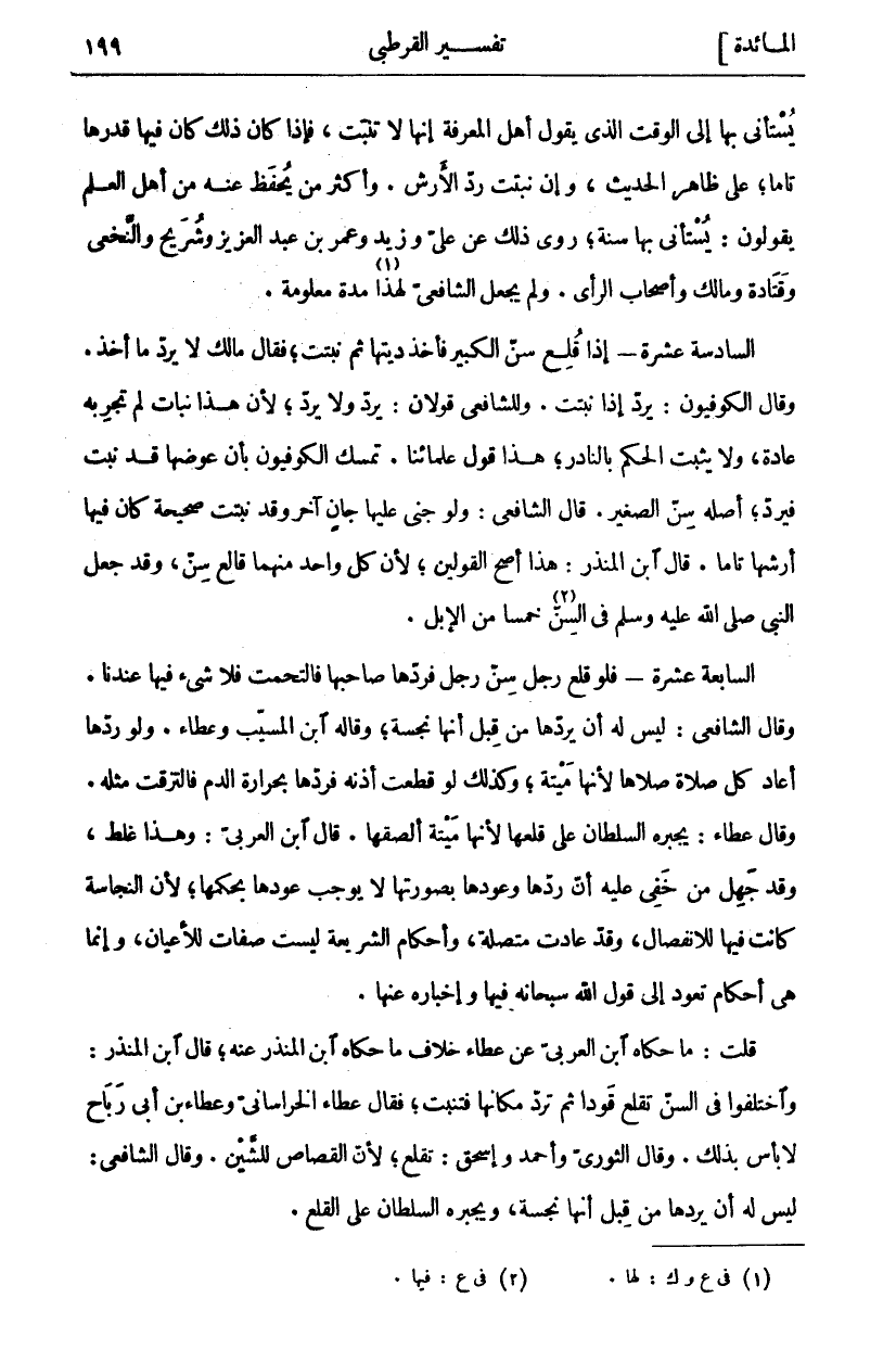 يُسْتَأْنَى بِهَا إِلَى الْوَقْتِ الَّذِي يَقُولُ أَهْلُ الْمَعْرِفَةِ إِنَّهَا لَا تَنْبُتُ، فَإِذَا كَانَ ذَلِكَ كَانَ فِيهَا قَدْرُهَا تَامًّا، عَلَى ظَاهِرِ الْحَدِيثِ، وَإِنْ نَبَتَتْ رُدَّ الْأَرْشُ. وَأَكْثَرُ مَنْ يُحْفَظُ عَنْهُ مِنْ أَهْلِ الْعِلْمِ يَقُولُونَ: يُسْتَأْنَى بِهَا سَنَةٌ، رُوِيَ ذَلِكَ عَنْ عَلِيٍّ وَزَيْدٍ وَعُمَرَ بْنِ عَبْدِ الْعَزِيزِ وَشُرَيْحٍ وَالنَّخَعِيِّ وَقَتَادَةَ وَمَالِكٍ وأصحاب الرأي. ولم يجعل الشافع لِهَذَا «١» مُدَّةً مَعْلُومَةً. السَّادِسَةَ عَشْرَةَ- إِذَا قُلِعَ سِنُّ الْكَبِيرِ فَأَخَذَ دِيَتَهَا ثُمَّ نَبَتَتْ، فَقَالَ مَالِكٌ لَا يَرُدُّ مَا أَخَذَ. وَقَالَ الْكُوفِيُّونَ: يَرُدُّ إِذَا نَبَتَتْ. وَلِلشَّافِعِيِّ قَوْلَانِ: يَرُدُّ وَلَا يرد، لان هذا نبات لم تجربه عَادَةٌ، وَلَا يَثْبُتُ الْحُكْمُ بِالنَّادِرِ، هَذَا قَوْلُ عُلَمَائِنَا. تَمَسَّكَ الْكُوفِيُّونَ بِأَنَّ عِوَضَهَا قَدْ نَبَتَ فَيُرَدُّ، أَصْلُهُ سِنُّ الصَّغِيرِ. قَالَ الشَّافِعِيُّ: وَلَوْ جَنَى عَلَيْهَا جَانٍ آخَرَ وَقَدْ نَبَتَتْ صَحِيحَةً كَانَ فِيهَا أَرْشُهَا تَامًّا. قَالَ ابْنُ الْمُنْذِرِ: هَذَا أَصَحُّ الْقَوْلَيْنِ، لِأَنَّ كُلَّ وَاحِدٍ مِنْهُمَا قَالِعُ سِنٍّ، وَقَدْ جَعَلَ النَّبِيُّ صَلَّى اللَّهُ عَلَيْهِ وَسَلَّمَ فِي السِّنِّ «٢» خَمْسًا مِنَ الْإِبِلِ. السَّابِعَةَ عَشْرَةَ- فَلَوْ قَلَعَ رَجُلٌ سِنَّ رَجُلٍ فردها صاحبها فالتحمت فلا شي فِيهَا عِنْدَنَا. وَقَالَ الشَّافِعِيُّ: لَيْسَ لَهُ أَنْ يَرُدَّهَا مِنْ قِبَلِ أَنَّهَا نَجِسَةٌ، وَقَالَهُ ابْنُ الْمُسَيَّبِ وَعَطَاءٌ. وَلَوْ رَدَّهَا أَعَادَ كُلَّ صَلَاةٍ صَلَّاهَا لِأَنَّهَا مَيْتَةٌ، وَكَذَلِكَ لَوْ قُطِعَتْ أُذُنُهُ فَرَدَّهَا بِحَرَارَةِ الدَّمِ فَالْتَزَقَتْ مِثْلَهُ. وَقَالَ عَطَاءٌ: يُجْبِرُهُ السُّلْطَانُ عَلَى قَلْعِهَا لِأَنَّهَا مَيْتَةٌ أَلْصَقَهَا. قَالَ ابْنُ الْعَرَبِيِّ: وَهَذَا غَلَطٌ، وَقَدْ جَهِلَ مَنْ خَفِيَ عَلَيْهِ أَنَّ رَدَّهَا وَعَوْدَهَا بِصُورَتِهَا لَا يُوجِبُ عَوْدَهَا بِحُكْمِهَا، لِأَنَّ النَّجَاسَةَ كَانَتْ فِيهَا لِلِانْفِصَالِ، وَقَدْ عَادَتْ مُتَّصِلَةٌ، وَأَحْكَامُ الشَّرِيعَةِ لَيْسَتْ صِفَاتٌ لِلْأَعْيَانِ، وَإِنَّمَا هِيَ أَحْكَامٌ تَعُودُ إِلَى قَوْلِ اللَّهِ سُبْحَانَهُ فِيهَا وَإِخْبَارِهِ عَنْهَا. قُلْتُ: مَا حَكَاهُ ابْنُ الْعَرَبِيِّ عَنْ عَطَاءٍ خِلَافَ مَا حَكَاهُ ابْنُ الْمُنْذِرِ عَنْهُ، قَالَ ابْنُ الْمُنْذِرِ: وَاخْتَلَفُوا فِي السِّنِّ تُقْلَعُ قَوَدًا ثُمَّ تُرَدُّ مَكَانَهَا فَتَنْبُتُ، فَقَالَ عَطَاءٌ الْخُرَاسَانِيُّ وَعَطَاءُ بْنُ أَبِي رَبَاحٍ: لَا بَأْسَ بِذَلِكَ. وَقَالَ الثَّوْرِيُّ وَأَحْمَدُ وَإِسْحَاقُ: تُقْلَعُ، لِأَنَّ الْقِصَاصَ لِلشِّيْنِ. وَقَالَ الشَّافِعِيُّ: لَيْسَ لَهُ أَنْ يَرُدَّهَا مِنْ قِبَلِ أَنَّهَا نَجِسَةٌ، وَيُجْبِرَهُ السُّلْطَانُ عَلَى القلع.