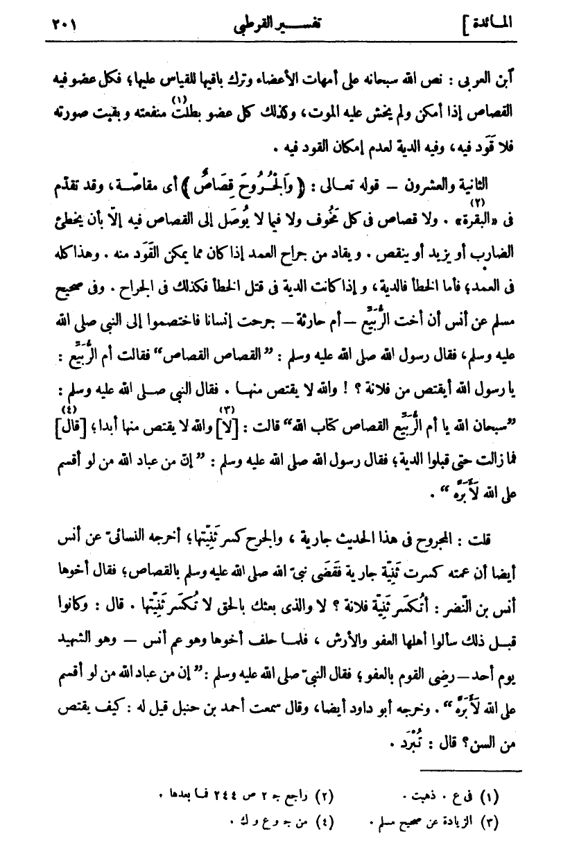 ابْنُ الْعَرَبِيِّ: نَصَّ اللَّهُ سُبْحَانَهُ عَلَى أُمَّهَاتِ الْأَعْضَاءِ وَتَرَكَ بَاقِيَهَا لِلْقِيَاسِ عَلَيْهَا، فَكُلُّ عُضْوٍ فِيهِ الْقِصَاصُ إِذَا أَمْكَنَ وَلَمْ يُخْشَ عَلَيْهِ الْمَوْتُ، وَكَذَلِكَ كُلُّ عُضْوٍ بَطَلَتْ «١» مَنْفَعَتُهُ وَبَقِيَتْ صُورَتُهُ فَلَا قَوَدَ فِيهِ، وَفِيهِ الدِّيَةُ لِعَدَمِ إِمْكَانِ الْقَوَدِ فِيهِ. الثَّانِيَةُ وَالْعِشْرُونَ- قَوْلُهُ تَعَالَى: (وَالْجُرُوحَ قِصاصٌ) أَيْ مُقَاصَّةٌ، وَقَدْ تَقَدَّمَ فِي" الْبَقَرَةِ" «٢». وَلَا قِصَاصَ فِي كُلِّ مَخُوفٍ وَلَا فِيمَا لَا يُوصَلُ إِلَى الْقِصَاصِ فِيهِ إِلَّا بِأَنْ يُخْطِئَ الضَّارِبُ أَوْ يَزِيدَ أَوْ يَنْقُصَ. وَيُقَادُ مِنْ جِرَاحِ الْعَمْدِ إِذَا كَانَ مِمَّا يُمْكِنُ الْقَوَدُ مِنْهُ. وَهَذَا كُلُّهُ فِي الْعَمْدِ، فَأَمَّا الْخَطَأُ فَالدِّيَةُ، وَإِذَا كَانَتِ الدِّيَةُ فِي قَتْلِ الْخَطَأِ فَكَذَلِكَ فِي الْجِرَاحِ. وَفِي صَحِيحِ مُسْلِمٍ عَنْ أَنَسٍ أَنَّ أُخْتَ الرُّبَيِّعِ- أُمَّ حَارِثَةَ- جَرَحَتْ إِنْسَانًا فَاخْتَصَمُوا إِلَى النَّبِيِّ صَلَّى اللَّهُ عَلَيْهِ وَسَلَّمَ، فَقَالَ رَسُولُ اللَّهِ صَلَّى اللَّهُ عَلَيْهِ وَسَلَّمَ: (الْقِصَاصُ الْقِصَاصُ)، فَقَالَتْ أُمُّ الربيع: يا رسول الله أيقتص من فلانة؟! وَاللَّهِ لَا يُقْتَصُّ مِنْهَا. فَقَالَ النَّبِيُّ صَلَّى اللَّهُ عَلَيْهِ وَسَلَّمَ: سُبْحَانَ اللَّهِ يَا أُمَّ الرُّبَيِّعِ الْقِصَاصُ كِتَابُ اللَّهِ) قَالَتْ:] لَا [«٣» وَاللَّهِ لَا يُقْتَصُّ مِنْهَا أَبَدًا،] قَالَ [«٤» فَمَا زَالَتْ حَتَّى قَبِلُوا الدِّيَةَ، فَقَالَ رَسُولُ اللَّهِ صَلَّى اللَّهُ عَلَيْهِ وَسَلَّمَ: (إِنَّ مِنْ عِبَادِ اللَّهِ مَنْ لَوْ أَقْسَمَ عَلَى اللَّهِ لَأَبَرَّهُ). قُلْتُ: الْمَجْرُوحُ فِي هَذَا الْحَدِيثِ جَارِيَةٌ، وَالْجُرْحُ كَسْرُ ثَنِيَّتُهَا، أَخْرَجَهُ النَّسَائِيُّ عَنْ أَنَسٍ أَيْضًا أَنَّ عَمَّتَهُ كَسَرَتْ ثَنِيَّةَ جَارِيَةٍ فَقَضَى نَبِيُّ اللَّهِ صَلَّى اللَّهُ عَلَيْهِ وَسَلَّمَ بِالْقِصَاصِ، فَقَالَ أَخُوهَا أَنَسُ بْنُ النَّضْرِ: أَتُكْسَرُ ثَنِيَّةُ فُلَانَةٍ؟ لَا وَالَّذِي بَعَثَكَ بِالْحَقِّ لَا تُكْسَرُ ثَنِيَّتُهَا. قَالَ: وَكَانُوا قَبْلَ ذَلِكَ سَأَلُوا أَهْلَهَا الْعَفْوَ وَالْأَرْشَ، فَلَمَّا حَلَفَ أَخُوهَا وَهُوَ عَمُّ أَنَسٍ- وَهُوَ الشَّهِيدُ يَوْمَ أُحُدٍ- رَضِيَ الْقَوْمُ بِالْعَفْوِ، فَقَالَ النَّبِيُّ صَلَّى اللَّهُ عَلَيْهِ وَسَلَّمَ: (إِنَّ من عِبَادِ اللَّهِ مَنْ لَوْ أَقْسَمَ عَلَى اللَّهِ لَأَبَرَّهُ). وَخَرَّجَهُ أَبُو دَاوُدَ أَيْضًا، وَقَالَ سَمِعْتُ أَحْمَدَ بْنِ حَنْبَلٍ قِيلَ لَهُ: كَيْفَ يُقْتَصُّ من السن؟ قال: تبرد.