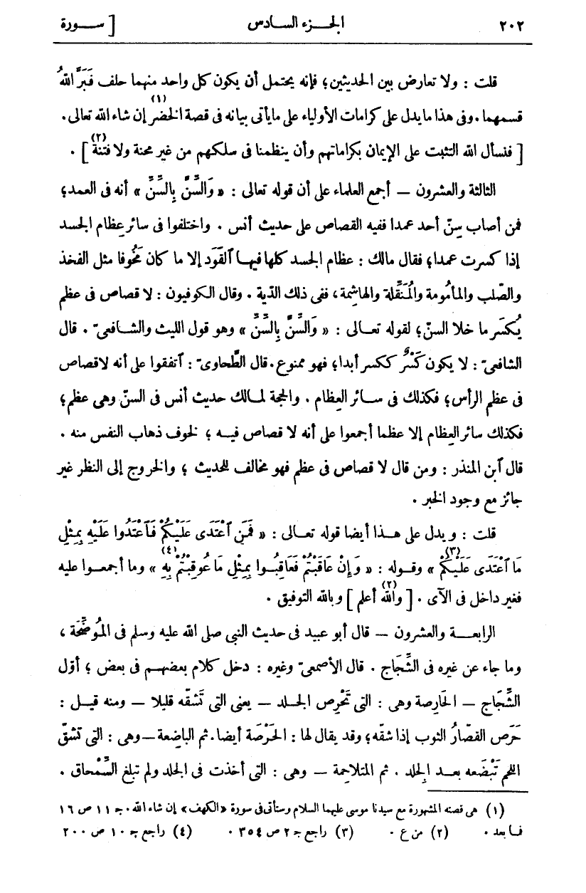 قُلْتُ: وَلَا تَعَارُضَ بَيْنَ الْحَدِيثَيْنِ، فَإِنَّهُ يَحْتَمِلُ أَنْ يَكُونَ كُلُّ وَاحِدٍ مِنْهُمَا حَلَفَ فَبَرَّ اللَّهُ قَسَمَهُمَا. وَفِي هَذَا مَا يَدُلُّ عَلَى كَرَامَاتِ الْأَوْلِيَاءِ عَلَى مَا يَأْتِي بَيَانُهُ فِي قِصَّةِ الْخَضِرِ «١» إِنْ شَاءَ اللَّهُ تَعَالَى.] فَنَسْأَلُ اللَّهَ التَّثَبُّتَ عَلَى الْإِيمَانِ بِكَرَامَاتِهِمْ وَأَنْ يَنْظِمَنَا فِي سِلْكِهِمْ مِنْ غَيْرِ مِحْنَةٍ وَلَا فِتْنَةٍ [«٢». الثَّالِثَةُ وَالْعِشْرُونَ- أَجْمَعَ الْعُلَمَاءُ عَلَى أَنَّ قَوْلَهُ تَعَالَى:" وَالسِّنَّ بِالسِّنِّ" أَنَّهُ فِي الْعَمْدِ، فَمَنْ أَصَابَ سِنَّ أَحَدٍ عَمْدًا فَفِيهِ الْقِصَاصُ عَلَى حَدِيثِ أَنَسٍ. وَاخْتَلَفُوا فِي سَائِرِ عِظَامِ الْجَسَدِ إِذَا كُسِرَتْ عَمْدًا، فَقَالَ مَالِكٌ: عِظَامُ الْجَسَدِ كُلُّهَا فِيهَا الْقَوَدُ إِلَّا مَا كَانَ مَخُوفًا مِثْلَ الْفَخِذِ وَالصُّلْبِ وَالْمَأْمُومَةِ وَالْمُنَقِّلَةِ وَالْهَاشِمَةِ، فَفِي ذَلِكَ الدِّيَةُ. وَقَالَ الْكُوفِيُّونَ: لَا قِصَاصَ فِي عَظْمٍ يُكْسَرُ مَا خَلَا السِّنَّ، لِقَوْلِهِ تَعَالَى:" وَالسِّنَّ بِالسِّنِّ" وَهُوَ قَوْلُ اللَّيْثِ وَالشَّافِعِيِّ. قَالَ الشَّافِعِيُّ: لَا يَكُونُ كَسْرٌ كَكَسْرٍ أَبَدًا، فَهُوَ مَمْنُوعٌ. قَالَ الطَّحَاوِيُّ: اتَّفَقُوا عَلَى أَنَّهُ لَا قِصَاصَ فِي عَظْمِ الرَّأْسِ، فَكَذَلِكَ فِي سَائِرِ الْعِظَامِ. وَالْحُجَّةُ لِمَالِكٍ حَدِيثُ أَنَسٍ فِي السِّنِّ وَهِيَ عَظْمٌ، فَكَذَلِكَ سَائِرُ الْعِظَامِ إِلَّا عَظْمًا أَجْمَعُوا عَلَى أَنَّهُ لَا قِصَاصَ فِيهِ، لِخَوْفِ ذَهَابِ النَّفْسِ مِنْهُ. قَالَ ابْنُ الْمُنْذِرِ: وَمَنْ قَالَ لَا قِصَاصَ فِي عَظْمٍ فَهُوَ مُخَالِفٌ للحديث، والخروج إلى النظر غَيْرُ جَائِزٍ مَعَ وُجُودِ الْخَبَرِ. قُلْتُ: وَيَدُلُّ عَلَى هَذَا أَيْضًا قَوْلُهُ تَعَالَى:" فَمَنِ اعْتَدى عَلَيْكُمْ فَاعْتَدُوا عَلَيْهِ بِمِثْلِ مَا اعْتَدى عَلَيْكُمْ" «٣»] البقرة: ١٩٤]، وَقَوْلُهُ:" وَإِنْ عاقَبْتُمْ فَعاقِبُوا بِمِثْلِ مَا عُوقِبْتُمْ بِهِ" «٤»] النحل: ١٢٦] وما أجمعوا عليه فغير داخل في الآي. [وَاللَّهُ «٥» أَعْلَمُ] وَبِاللَّهِ التَّوْفِيقُ. الرَّابِعَةُ وَالْعِشْرُونَ- قَالَ أَبُو عُبَيْدٍ فِي حَدِيثِ النَّبِيِّ صَلَّى اللَّهُ عَلَيْهِ وَسَلَّمَ فِي الْمُوضِحَةِ، وَمَا جَاءَ عَنْ غَيْرِهِ فِي الشِّجَاجِ. قَالَ الْأَصْمَعِيُّ وَغَيْرُهُ: دَخَلَ كَلَامُ بَعْضِهِمْ فِي بَعْضٍ، أَوَّلُ الشِّجَاجِ- الْحَارِصَةُ وَهِيَ: الَّتِي تَحْرِصُ الْجِلْدَ- يَعْنِي الَّتِي تَشُقُّهُ قَلِيلًا- وَمِنْهُ قِيلَ: حَرَصَ الْقَصَّارُ الثَّوْبَ إِذَا شَقَّهُ، وَقَدْ يُقَالُ لَهَا: الْحَرْصَةُ أَيْضًا. ثُمَّ الْبَاضِعَةُ- وَهِيَ: الَّتِي تَشُقُّ اللَّحْمَ تَبْضَعُهُ بَعْدَ الْجِلْدِ. ثُمَّ الْمُتَلَاحِمَةُ- وَهِيَ: الَّتِي أَخَذَتْ فِي الجلد ولم تبلغ السمحاق.