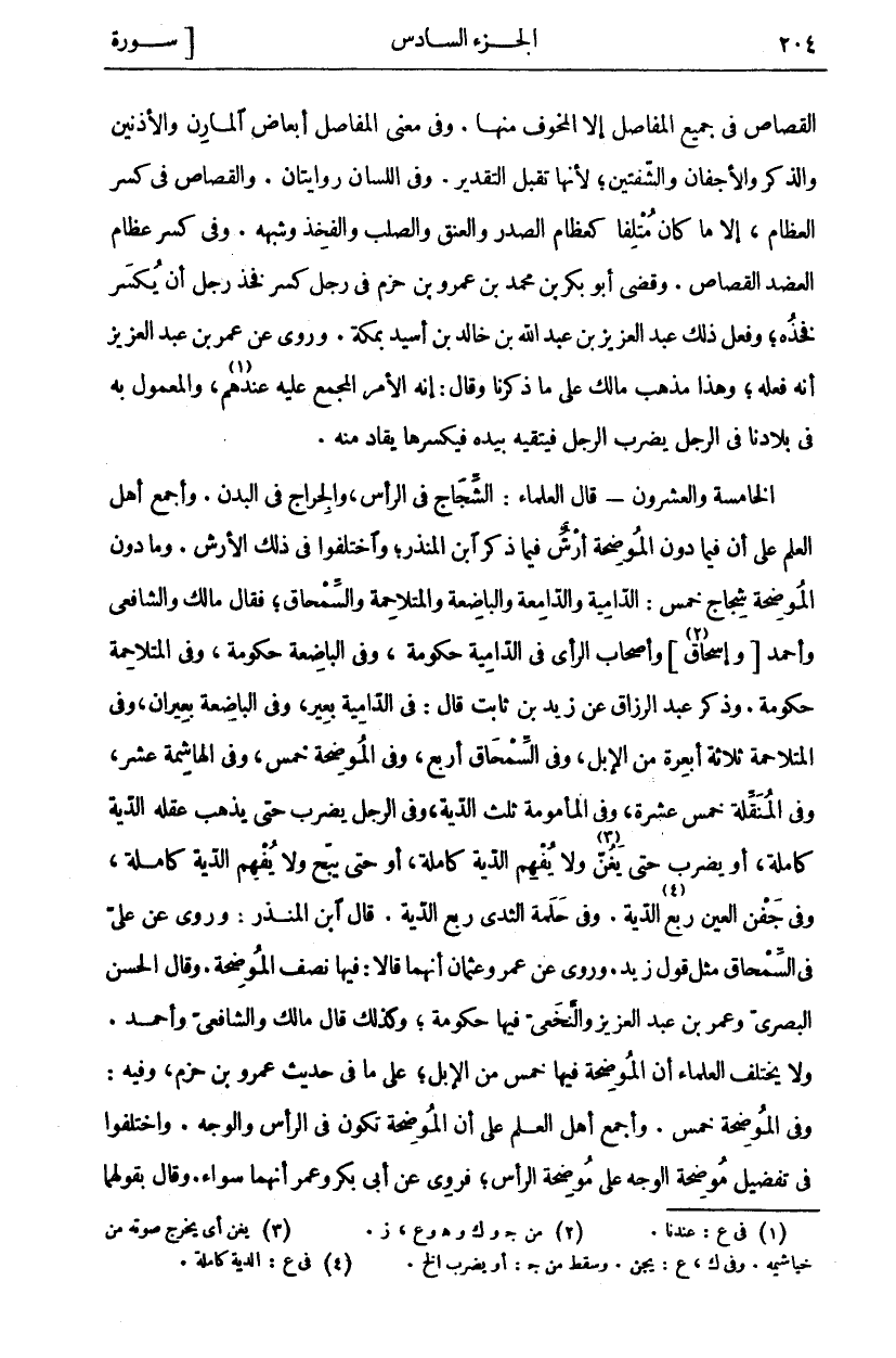 الْقِصَاصُ فِي جَمِيعِ الْمَفَاصِلِ إِلَّا الْمَخُوفِ مِنْهَا. وَفِي مَعْنَى الْمَفَاصِلِ أَبْعَاضُ الْمَارِنِ وَالْأُذُنَيْنِ وَالذَّكَرِ وَالْأَجْفَانِ وَالشَّفَتَيْنِ، لِأَنَّهَا تَقْبَلُ التَّقْدِيرَ. وَفِي اللِّسَانِ رِوَايَتَانِ. وَالْقِصَاصُ فِي كَسْرِ الْعِظَامِ، إِلَّا مَا كَانَ مُتْلِفًا كَعِظَامِ الصَّدْرِ وَالْعُنُقِ وَالصُّلْبِ وَالْفَخِذِ وَشِبْهِهِ. وَفِي كَسْرِ عِظَامِ الْعَضُدِ الْقِصَاصُ. وَقَضَى أَبُو بَكْرِ بْنِ مُحَمَّدِ بْنِ عَمْرِو بْنِ حَزْمٍ فِي رَجُلٍ كَسَرَ فَخِذَ رَجُلٍ أَنْ يُكْسَرَ فَخِذَهُ، وَفَعَلَ ذَلِكَ عَبْدُ الْعَزِيزِ بْنُ عَبْدِ اللَّهِ بْنِ خَالِدِ بْنِ أَسِيدِ بِمَكَّةَ. وَرُوِيَ عَنْ عُمَرَ بْنِ عَبْدِ الْعَزِيزِ أَنَّهُ فَعَلَهُ، وَهَذَا مَذْهَبُ مَالِكٍ عَلَى مَا ذَكَرْنَا، وَقَالَ: إِنَّهُ الْأَمْرُ الْمُجْمَعُ عَلَيْهِ عِنْدَهُمْ «١»، وَالْمَعْمُولُ بِهِ فِي بِلَادِنَا فِي الرَّجُلِ يَضْرِبُ الرَّجُلَ فيتقيه بيده فكسرها يُقَادُ مِنْهُ. الْخَامِسَةُ وَالْعِشْرُونَ- قَالَ الْعُلَمَاءُ: الشِّجَاجُ فِي الرَّأْسِ، وَالْجِرَاحُ فِي الْبَدَنِ. وَأَجْمَعَ أَهْلُ الْعِلْمِ عَلَى أَنَّ فِيمَا دُونَ الْمُوضِحَةِ أَرْشٌ فيا ذَكَرَ ابْنُ الْمُنْذِرِ، وَاخْتَلَفُوا فِي ذَلِكَ الْأَرْشِ. وَمَا دُونَ الْمُوضِحَةِ شِجَاجٌ خَمْسٌ: الدَّامِيَةُ وَالدَّامِعَةُ وَالْبَاضِعَةُ وَالْمُتَلَاحِمَةُ وَالسِّمْحَاقُ، فَقَالَ مَالِكٌ وَالشَّافِعِيُّ وَأَحْمَدُ] وَإِسْحَاقُ [«٢» وَأَصْحَابُ الرَّأْيِ فِي الدَّامِيَةِ حُكُومَةٌ، وَفِي الْبَاضِعَةِ حُكُومَةٌ، وَفِي الْمُتَلَاحِمَةِ حُكُومَةٌ. وَذَكَرَ عَبْدُ الرَّزَّاقِ عَنْ زَيْدِ بْنِ ثَابِتٍ قَالَ: فِي الدَّامِيَةِ بَعِيرٌ، وَفِي الْبَاضِعَةِ بَعِيرَانِ، وَفِي الْمُتَلَاحِمَةِ ثَلَاثَةُ أَبْعِرَةٍ مِنَ الْإِبِلِ، وَفِي السِّمْحَاقُ أَرْبَعٌ، وَفِي الْمُوضِحَةِ خَمْسٌ، وَفِي الْهَاشِمَةِ عَشْرٌ، وَفِي الْمُنَقِّلَةِ خَمْسَ عَشْرَةَ، وَفِي الْمَأْمُومَةِ ثُلُثُ الدِّيَةِ، وَفِي الرَّجُلِ يُضْرَبُ حَتَّى يَذْهَبَ عَقْلُهُ الدِّيَةُ كَامِلَةً، أَوْ يُضْرَبُ حَتَّى يُغَنَّ «٣» وَلَا يُفْهِمُ الدِّيَةُ كَامِلَةً، أَوْ حَتَّى يُبَحَّ وَلَا يُفْهِمُ الدِّيَةُ كَامِلَةً، وَفِي جَفْنِ الْعَيْنِ رُبُعُ «٤» الدِّيَةِ. وَفِي حَلَمَةِ الثَّدْيِ رُبُعُ الدِّيَةِ. قَالَ ابْنُ الْمُنْذِرِ: وَرُوِيَ عَنْ عَلِيٍّ فِي السِّمْحَاقِ مِثْلُ قَوْلِ زَيْدٍ. وَرُوِيَ عَنْ عُمَرَ وَعُثْمَانَ أَنَّهُمَا قَالَا: فِيهَا نِصْفُ الْمُوضِحَةِ. وَقَالَ الْحَسَنُ الْبَصْرِيُّ وَعُمَرُ بْنُ عَبْدِ الْعَزِيزِ وَالنَّخَعِيُّ فِيهَا حُكُومَةٌ، وَكَذَلِكَ قَالَ مَالِكٌ وَالشَّافِعِيُّ وَأَحْمَدُ. وَلَا يَخْتَلِفُ الْعُلَمَاءُ أَنَّ الْمُوضِحَةَ فِيهَا خَمْسٌ مِنَ الْإِبِلِ، عَلَى مَا فِي حَدِيثِ عَمْرِو بْنِ حَزْمٍ، وَفِيهِ: وَفِي الْمُوضِحَةِ خَمْسٌ. وَأَجْمَعَ أَهْلُ الْعِلْمِ عَلَى أَنَّ الْمُوضِحَةَ تَكُونُ فِي الرَّأْسِ وَالْوَجْهِ. وَاخْتَلَفُوا فِي تَفْضِيلِ مُوضِحَةِ الْوَجْهِ عَلَى مُوضِحَةِ الرَّأْسِ، فَرُوِيَ عَنْ أَبِي بَكْرٍ وَعُمَرَ أَنَّهُمَا سواء. وقال بقولهما