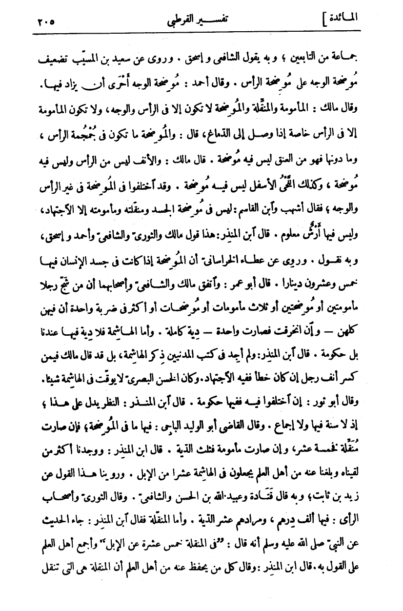 جَمَاعَةٌ مِنَ التَّابِعِينَ، وَبِهِ يَقُولُ الشَّافِعِيُّ وَإِسْحَاقُ. وَرُوِيَ عَنْ سَعِيدِ بْنِ الْمُسَيَّبِ تَضْعِيفُ مُوضِحَةِ الْوَجْهِ عَلَى مُوضِحَةِ الرَّأْسِ. وَقَالَ أَحْمَدُ: مُوضِحَةُ الْوَجْهِ أَحْرَى أَنْ يُزَادَ فِيهَا. وَقَالَ مَالِكٌ: الْمَأْمُومَةُ وَالْمُنَقِّلَةُ وَالْمُوضِحَةُ لَا تَكُونُ إِلَّا فِي الرَّأْسِ وَالْوَجْهِ، وَلَا تَكُونُ الْمَأْمُومَةُ إِلَّا فِي الرَّأْسِ خَاصَّةً إِذَا وَصَلَ إِلَى الدِّمَاغِ، قَالَ: وَالْمُوضِحَةُ مَا تَكُونُ فِي جُمْجُمَةِ الرَّأْسِ، وَمَا دُونَهَا فَهُوَ مِنَ الْعُنُقِ لَيْسَ فِيهِ مُوضِحَةٌ. قَالَ مَالِكٌ: وَالْأَنْفُ لَيْسَ مِنَ الرَّأْسِ وَلَيْسَ فِيهِ مُوضِحَةٌ، وَكَذَلِكَ اللَّحْيُ الْأَسْفَلُ لَيْسَ فِيهِ مُوضِحَةٌ. وَقَدِ اخْتَلَفُوا فِي الْمُوضِحَةِ فِي غَيْرِ الرَّأْسِ وَالْوَجْهِ، فَقَالَ أَشْهَبُ وَابْنُ الْقَاسِمِ: لَيْسَ فِي مُوضِحَةِ الْجَسَدِ وَمُنَقِّلَتِهِ وَمَأْمُومَتِهِ إِلَّا الِاجْتِهَادُ، وَلَيْسَ فِيهَا أَرْشٌ مَعْلُومٌ. قَالَ ابْنُ الْمُنْذِرِ: هَذَا قَوْلُ مَالِكٍ وَالثَّوْرِيِّ وَالشَّافِعِيِّ وَأَحْمَدَ وَإِسْحَاقَ، وَبِهِ نَقُولُ. وَرُوِيَ عَنْ عَطَاءٍ الْخُرَاسَانِيِّ أَنَّ الْمُوضِحَةَ إِذَا كَانَتْ فِي جَسَدِ الْإِنْسَانِ فِيهَا خَمْسٌ وَعِشْرُونَ دِينَارًا. قَالَ أَبُو عُمَرَ: وَاتَّفَقَ مَالِكٌ وَالشَّافِعِيُّ وَأَصْحَابُهُمَا أَنَّ مَنْ شَجَّ رَجُلًا مَأْمُومَتَيْنِ أَوْ مُوضِحَتَيْنِ أَوْ ثَلَاثَ مَأْمُومَاتٍ أَوْ مُوضِحَاتٍ أَوْ أَكْثَرَ فِي ضَرْبَةٍ وَاحِدَةٍ أَنَّ فِيهِنَّ كُلِّهِنَّ- وَإِنِ انْخَرَقَتْ فَصَارَتْ وَاحِدَةً- دِيَةً كَامِلَةً. وَأَمَّا الْهَاشِمَةُ فَلَا دِيَةَ فِيهَا عِنْدَنَا بَلْ حُكُومَةً. قَالَ ابْنُ الْمُنْذِرِ: وَلَمْ أَجِدْ فِي كُتُبِ الْمَدَنِيِّينَ ذِكْرَ الْهَاشِمَةِ، بَلْ قَدْ قَالَ مَالِكٌ فِيمَنْ كَسَرَ أَنْفَ رَجُلٍ إِنْ كَانَ خَطَأً فَفِيهِ الِاجْتِهَادُ. وَكَانَ الْحَسَنُ الْبَصْرِيُّ لَا يُوَقِّتُ فِي الْهَاشِمَةِ شَيْئًا. وَقَالَ أَبُو ثَوْرٍ: إِنِ اخْتَلَفُوا فِيهِ فَفِيهَا حُكُومَةٌ. قَالَ ابْنُ الْمُنْذِرِ: النَّظَرُ يَدُلُّ عَلَى هَذَا، إِذْ لَا سُنَّةَ فِيهَا وَلَا إِجْمَاعَ. وَقَالَ الْقَاضِي أَبُو الْوَلِيدِ الْبَاجِيُّ: فِيهَا مَا فِي الْمُوضِحَةِ، فَإِنْ صَارَتْ مُنَقِّلَةً فَخَمْسَةَ عَشَرَ، وَإِنْ صَارَتْ مَأْمُومَةً فَثُلُثُ الدِّيَةِ. قَالَ ابْنُ الْمُنْذِرِ: وَوَجَدْنَا أَكْثَرَ مَنْ لَقِينَاهُ وَبَلَغَنَا عَنْهُ مِنْ أَهْلِ الْعِلْمِ يَجْعَلُونَ فِي الْهَاشِمَةِ عَشْرًا مِنَ الْإِبِلِ. وَرُوِّينَا هَذَا الْقَوْلَ عَنْ زَيْدِ بْنِ ثَابِتٍ، وَبِهِ قَالَ قَتَادَةُ وَعُبَيْدُ اللَّهِ بْنُ الْحَسَنِ وَالشَّافِعِيُّ. وَقَالَ الثَّوْرِيُّ وَأَصْحَابُ الرَّأْيِ: فِيهَا أَلْفُ دِرْهَمٍ، وَمُرَادُهُمْ عُشْرُ الدِّيَةِ. وَأَمَّا الْمُنَقِّلَةُ فَقَالَ ابْنُ الْمُنْذِرِ: جَاءَ؟ الْحَدِيثُ عَنِ النَّبِيِّ صَلَّى اللَّهُ عَلَيْهِ وَسَلَّمَ أَنَّهُ قَالَ: (فِي الْمُنَقِّلَةِ خَمْسَ عَشْرَةَ مِنَ الْإِبِلِ) وَأَجْمَعَ أَهْلُ الْعِلْمِ عَلَى الْقَوْلِ بِهِ. قَالَ ابْنُ الْمُنْذِرِ: وَقَالَ كُلُّ مَنْ يُحْفَظُ عَنْهُ مِنْ أَهْلِ الْعِلْمِ إِنَّ الْمُنَقِّلَةَ هِيَ الَّتِي تُنْقَلُ
