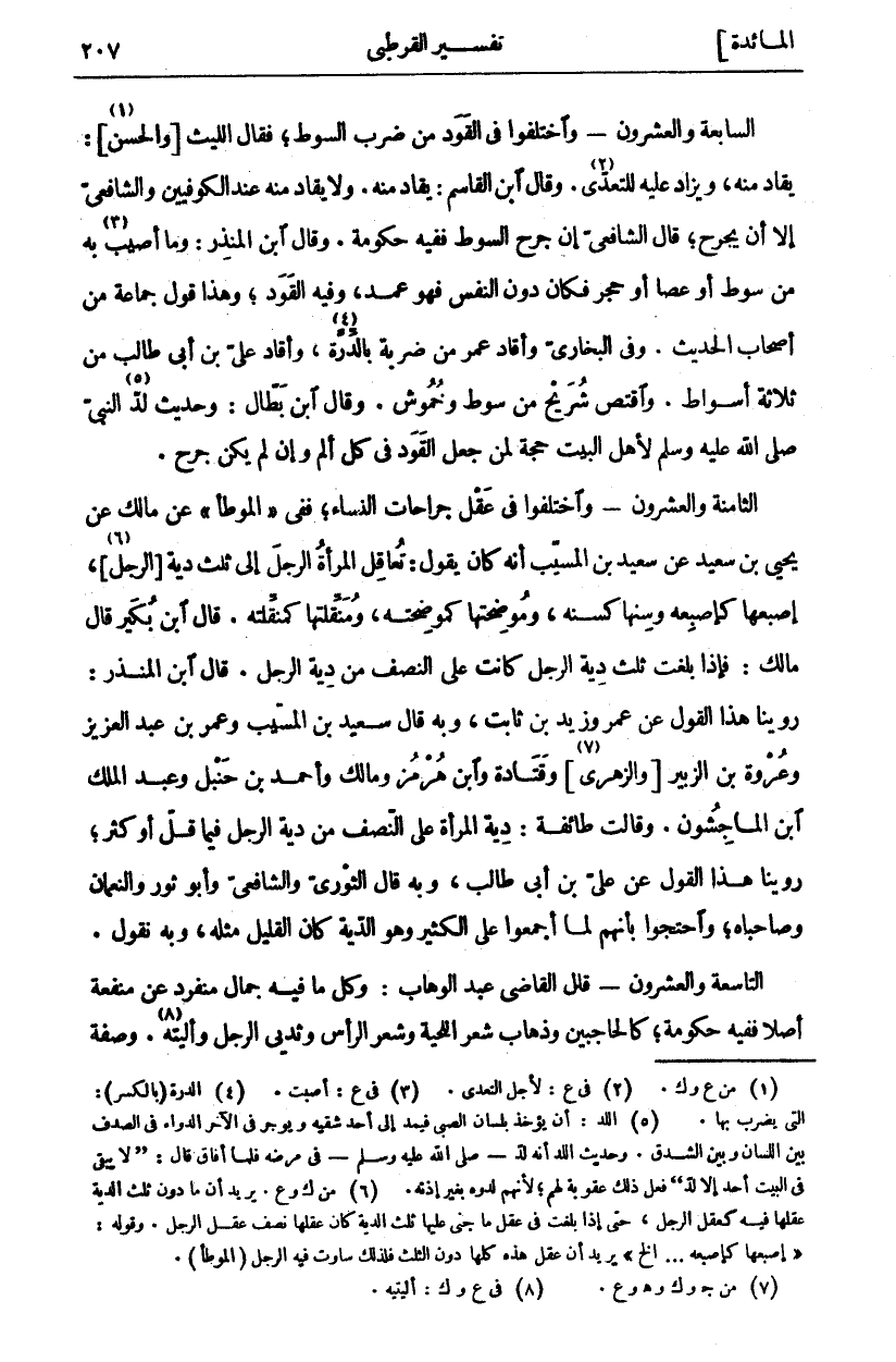 السَّابِعَةُ وَالْعِشْرُونَ- وَاخْتَلَفُوا فِي الْقَوَدِ مِنْ ضَرْبِ السَّوْطِ، فَقَالَ اللَّيْثُ] وَالْحَسَنُ [«١»: يُقَادُ مِنْهُ، وَيُزَادُ عَلَيْهِ لِلتَّعَدِّي «٢». وَقَالَ ابْنُ الْقَاسِمِ: يُقَادُ مِنْهُ. وَلَا يُقَادُ مِنْهُ عِنْدَ الْكُوفِيِّينَ وَالشَّافِعِيِّ إِلَّا أَنْ يُجْرَحَ، قَالَ الشَّافِعِيُّ إِنْ جَرَحَ السَّوْطُ فَفِيهِ حُكُومَةٌ. وَقَالَ ابْنُ الْمُنْذِرِ: وَمَا أُصِيبَ «٣» بِهِ مِنْ سَوْطٍ أَوْ عَصًا أَوْ حَجَرٍ فَكَانَ دُونَ النَّفْسِ فَهُوَ عَمْدٌ، وَفِيهِ الْقَوَدُ، وَهَذَا قَوْلُ جَمَاعَةٍ مِنْ أَصْحَابِ الْحَدِيثِ. وَفِي الْبُخَارِيِّ وَأَقَادَ عُمَرُ مِنْ ضَرْبَةٍ بِالدِّرَّةِ «٤»، وَأَقَادَ عَلِيُّ بْنُ أَبِي طَالِبٍ مِنْ ثَلَاثَةِ أَسْوَاطٍ. وَاقْتَصَّ شُرَيْحٌ مِنْ سَوْطٍ وَخُمُوشٍ. وَقَالَ ابْنُ بَطَّالٍ: وَحَدِيثُ لُدِّ «٥» النَّبِيِّ صَلَّى اللَّهُ عَلَيْهِ وَسَلَّمَ لِأَهْلِ الْبَيْتِ حُجَّةٌ لِمَنْ جَعَلَ الْقَوَدَ فِي كُلِّ أَلَمٍ وَإِنْ لَمْ يَكُنْ جُرْحٌ. الثَّامِنَةُ وَالْعِشْرُونَ- وَاخْتَلَفُوا فِي عَقْلِ جِرَاحَاتِ النِّسَاءِ، فَفِي" الْمُوَطَّأِ" عَنْ مَالِكٌ عَنْ يَحْيَى بْنِ سَعِيدٍ عَنْ سَعِيدِ بْنِ الْمُسَيَّبِ أَنَّهُ كَانَ يَقُولُ: تُعَاقِلُ الْمَرْأَةُ الرَّجُلَ إِلَى ثُلُثِ دِيَةِ] الرَّجُلِ [«٦»، إِصْبَعُهَا كَإِصْبَعِهِ وَسِنُّهَا كَسِنِّهِ، وَمُوضِحَتُهَا كَمُوضِحَتِهِ، وَمُنَقِّلَتُهَا كَمُنَقِّلَتِهِ. قَالَ ابْنُ بُكَيْرٍ قَالَ مَالِكٌ: فَإِذَا بَلَغَتْ ثُلُثَ دِيَةِ الرَّجُلِ كَانَتْ عَلَى النِّصْفِ مِنْ دِيَةِ الرَّجُلِ. قَالَ ابْنُ الْمُنْذِرِ: رُوِّينَا هَذَا الْقَوْلُ عَنْ عُمَرَ وَزَيْدِ بْنِ ثَابِتٍ، وَبِهِ قَالَ سَعِيدُ بْنُ الْمُسَيَّبِ وَعُمَرُ بْنُ عَبْدِ الْعَزِيزِ وَعُرْوَةُ بْنُ الزُّبَيْرِ [وَالزُّهْرِيُّ] «٧» وَقَتَادَةُ وَابْنُ هُرْمُزٍ وَمَالِكٌ وَأَحْمَدُ بْنُ حَنْبَلٍ وعبد الملك ابن الْمَاجِشُونِ. وَقَالَتْ طَائِفَةٌ: دِيَةَ الْمَرْأَةِ عَلَى النِّصْفِ مِنْ دِيَةِ الرَّجُلِ فِيمَا قَلَّ أَوْ كَثُرَ، رُوِّينَا هَذَا الْقَوْلُ عَنْ عَلِيِّ بْنِ أَبِي طَالِبٍ، وبه قَالَ الثَّوْرِيُّ وَالشَّافِعِيُّ وَأَبُو ثَوْرٍ وَالنُّعْمَانُ وَصَاحِبَاهُ، وَاحْتَجُّوا بِأَنَّهُمْ لَمَّا أَجْمَعُوا عَلَى الْكَثِيرِ وَهُوَ الدِّيَةُ كَانَ الْقَلِيلُ مِثْلَهُ، وَبِهِ نَقُولُ. التَّاسِعَةُ وَالْعِشْرُونَ- قَالَ الْقَاضِي عَبْدُ الْوَهَّابِ: وَكُلُّ مَا فِيهِ جَمَالٌ مُنْفَرِدٌ عَنْ مَنْفَعَةٍ أَصْلًا فَفِيهِ حُكُومَةٌ، كَالْحَاجِبَيْنِ وَذَهَابِ شَعْرِ اللِّحْيَةِ وَشَعْرِ؟؟ الرَّأْسِ وثديي؟؟ الرجل واليته «٨». وصفه