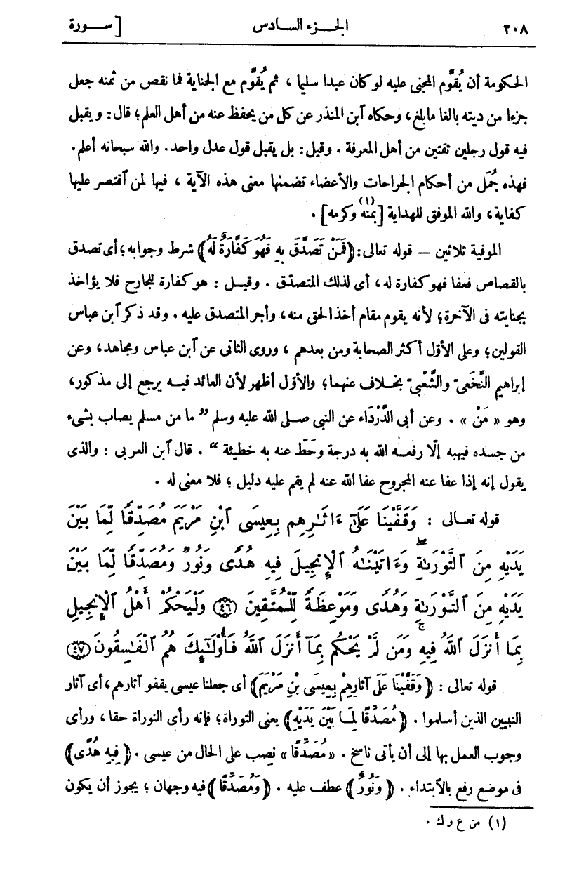 قَوْلُهُ تَعَالَى: (وَقَفَّيْنا عَلى آثارِهِمْ بِعِيسَى ابْنِ مَرْيَمَ) أَيْ جَعَلْنَا عِيسَى يَقْفُو آثَارَهُمْ، أَيْ آثَارَ النَّبِيِّينَ الَّذِينَ أَسْلَمُوا. (مُصَدِّقاً لِما بَيْنَ يَدَيْهِ) يَعْنِي التَّوْرَاةَ، فَإِنَّهُ رَأَى التَّوْرَاةَ حَقًّا، وَرَأَى وُجُوبَ الْعَمَلِ بِهَا إِلَى أَنْ يَأْتِيَ نَاسِخٌ." مُصَدِّقاً" نُصِبَ عَلَى الْحَالِ مِنْ عِيسَى. (فِيهِ هُدىً) فِي مَوْضِعِ رَفْعٍ بِالِابْتِدَاءِ. وَنُورٌ عُطِفَ عَلَيْهِ." وَمُصَدِّقاً" فِيهِ وَجْهَانِ، يَجُوزُ أَنْ يكون