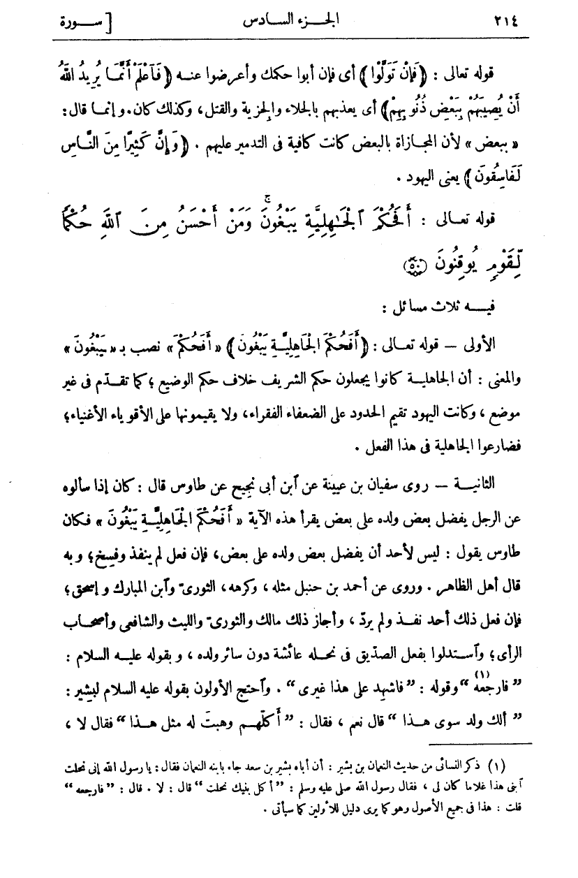 فِيهِ ثَلَاثُ مَسَائِلَ: الْأُولَى- قَوْلُهُ تَعَالَى: (أَفَحُكْمَ الْجاهِلِيَّةِ يَبْغُونَ) " أَفَحُكْمَ" نُصِبَ بِ"- يَبْغُونَ" وَالْمَعْنَى: أَنَّ الْجَاهِلِيَّةَ كَانُوا يَجْعَلُونَ حُكْمَ الشَّرِيفِ خِلَافَ حُكْمِ الْوَضِيعِ، كَمَا تَقَدَّمَ فِي غَيْرِ مَوْضِعٍ، وَكَانَتْ الْيَهُودُ تُقِيمُ الْحُدُودَ عَلَى الضُّعَفَاءِ الْفُقَرَاءِ، وَلَا يُقِيمُونَهَا عَلَى الْأَقْوِيَاءِ الْأَغْنِيَاءِ، فَضَارَعُوا الْجَاهِلِيَّةَ فِي هَذَا الْفِعْلِ. الثَّانِيَةُ- رَوَى سُفْيَانُ بْنُ عُيَيْنَةَ عَنِ ابْنِ أَبِي نَجِيحٍ عَنْ طَاوُسٍ قَالَ: كَانَ إِذَا سَأَلُوهُ عَنْ الرَّجُلِ يُفَضِّلُ بَعْضَ وَلَدِهِ عَلَى بَعْضٍ يَقْرَأُ هَذِهِ الْآيَةَ" أَفَحُكْمَ الْجاهِلِيَّةِ يَبْغُونَ" فَكَانَ طَاوُسٌ يَقُولُ: لَيْسَ لِأَحَدٍ أَنْ يُفَضِّلَ بَعْضَ وَلَدِهِ عَلَى بَعْضٍ، فَإِنْ فَعَلَ لَمْ يَنْفُذْ وَفُسِخَ، وَبِهِ قَالَ أَهْلُ الظَّاهِرِ. وَرُوِيَ عَنْ أَحْمَدَ بْنِ حَنْبَلٍ مِثْلُهُ، وَكَرِهَهُ، الثَّوْرِيُّ وَابْنُ الْمُبَارَكِ وَإِسْحَاقُ، فَإِنْ فَعَلَ ذَلِكَ أَحَدٌ نَفَذَ وَلَمْ يُرَدَّ، وَأَجَازَ ذَلِكَ مَالِكٌ وَالثَّوْرِيُّ وَاللَّيْثُ وَالشَّافِعِيُّ وَأَصْحَابُ الرَّأْيِ، وَاسْتَدَلُّوا بِفِعْلِ الصِّدِّيقِ فِي نَحْلِهِ عَائِشَةَ دُونَ سَائِرِ وَلَدِهِ، وَبِقَوْلِهِ عَلَيْهِ السَّلَامُ: (فَارْجِعْهُ) «١» وَقَوْلُهُ: (فَأَشْهِدْ عَلَى هَذَا غَيْرِي). وَاحْتَجَّ الْأَوَّلُونَ بِقَوْلِهِ عَلَيْهِ السَّلَامُ لِبَشِيرٍ: (أَلَكَ وَلَدٌ سِوَى هَذَا) قَالَ نَعَمْ، فَقَالَ: (أَكُلُّهُمْ وهبت له مثل هذا) فقال لا،