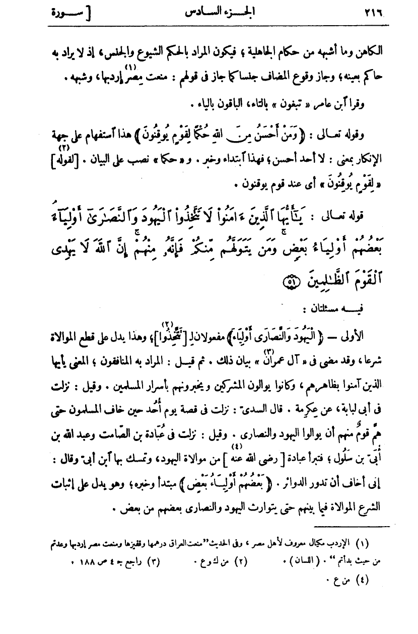 يَا أَيُّهَا الَّذِينَ آمَنُوا لَا تَتَّخِذُوا الْيَهُودَ وَالنَّصارى أَوْلِياءَ بَعْضُهُمْ أَوْلِياءُ بَعْضٍ وَمَنْ يَتَوَلَّهُمْ مِنْكُمْ فَإِنَّهُ مِنْهُمْ إِنَّ اللَّهَ لَا يَهْدِي الْقَوْمَ الظَّالِمِينَ (٥١)