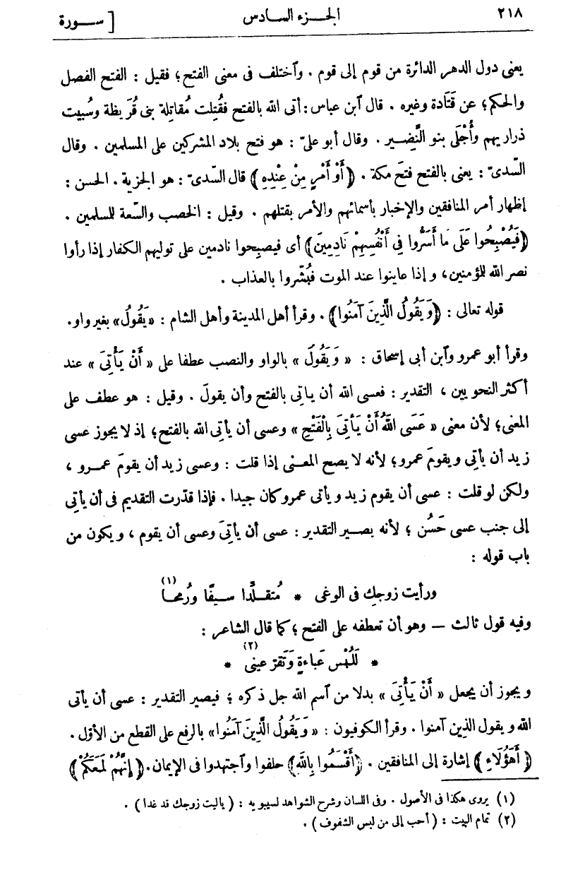 يَعْنِي دُوَلَ الدَّهْرِ الدَّائِرَةَ مِنْ قَوْمٍ إِلَى قَوْمٍ. وَاخْتُلِفَ فِي مَعْنَى الْفَتْحِ، فَقِيلَ: الْفَتْحُ الْفَصْلُ وَالْحُكْمُ، عَنْ قَتَادَةَ وَغَيْرِهِ. قَالَ ابْنُ عَبَّاسٍ: أَتَى اللَّهُ بِالْفَتْحِ فَقُتِلَتْ مُقَاتِلَةُ بَنِي قُرَيْظَةَ وَسُبِيَتْ ذَرَارِيُّهُمْ وَأُجْلِيَ بَنُو النَّضِيرِ. وَقَالَ أَبُو عَلِيٍّ: هُوَ فَتْحُ بِلَادِ الْمُشْرِكِينَ عَلَى الْمُسْلِمِينَ. وَقَالَ السُّدِّيُّ: يَعْنِي بِالْفَتْحِ فَتْحَ مَكَّةَ. (أَوْ أَمْرٍ مِنْ عِنْدِهِ) قَالَ السُّدِّيُّ: هُوَ الْجِزْيَةُ. الْحَسَنُ: إِظْهَارُ أَمْرِ الْمُنَافِقِينَ وَالْإِخْبَارِ بِأَسْمَائِهِمْ وَالْأَمْرِ بِقَتْلِهِمْ. وَقِيلَ: الْخِصْبُ وَالسَّعَةُ لِلْمُسْلِمِينَ (فَيُصْبِحُوا عَلى مَا أَسَرُّوا فِي أَنْفُسِهِمْ نادِمِينَ) أَيْ فَيُصْبِحُوا نَادِمِينَ عَلَى تَوَلِّيهِمِ الْكُفَّارَ إِذَا رَأَوْا نَصْرَ اللَّهِ لِلْمُؤْمِنِينَ، وَإِذَا عَايَنُوا عِنْدَ الْمَوْتِ فَبُشِّرُوا بِالْعَذَابِ. قَوْلُهُ تَعَالَى: (وَيَقُولُ الَّذِينَ آمَنُوا). وَقَرَأَ أَهْلُ الْمَدِينَةِ وَأَهْلُ الشَّامِ:" يَقُولُ" بِغَيْرِ وَاوٍ. وَقَرَأَ أَبُو عَمْرٍو وَابْنُ أَبِي إِسْحَاقَ:" وَيَقُولَ" بِالْوَاوِ وَالنَّصْبِ عَطْفًا عَلَى" أَنْ يَأْتِيَ" عِنْدَ أَكْثَرِ النَّحْوِيِّينَ، التَّقْدِيرُ: فَعَسَى اللَّهُ أَنْ يَأْتِيَ بِالْفَتْحِ وَأَنْ يَقُولَ. وَقِيلَ: هُوَ عَطْفٌ على المعنى، لان معنى" فَعَسَى اللَّهُ أَنْ يَأْتِيَ بِالْفَتْحِ" وعسى ن يَأْتِيَ اللَّهُ بِالْفَتْحِ، إِذْ لَا يَجُوزُ عَسَى زَيْدٌ أَنْ يَأْتِيَ وَيَقُومَ عَمْرٌو، لِأَنَّهُ لَا يَصِحُّ الْمَعْنَى إِذَا قُلْتَ: وَعَسَى زَيْدٌ أَنْ يَقُومَ عَمْرٌو، وَلَكِنْ لَوْ قُلْتُ: عَسَى أَنْ يَقُومَ زَيْدٌ وَيَأْتِيَ عَمْرٌو كَانَ جَيِّدًا. فَإِذَا قَدَّرْتَ التَّقْدِيمَ فِي أَنْ يَأْتِيَ إِلَى جَنْبِ عَسَى حَسُنَ، لِأَنَّهُ يَصِيرُ التَّقْدِيرُ: عَسَى أَنْ يَأْتِيَ وَعَسَى أَنْ يَقُومَ، وَيَكُونُ مِنْ بَابِ قَوْلِهِ: