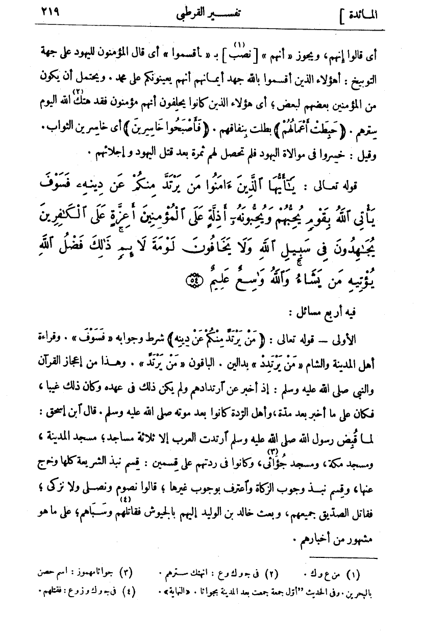 فِيهِ أَرْبَعُ مَسَائِلَ: الْأُولَى- قَوْلُهُ تَعَالَى:" مَنْ يَرْتَدَّ مِنْكُمْ عَنْ دِينِهِ" شَرْطٌ وَجَوَابُهُ" فَسَوْفَ". وَقِرَاءَةُ أَهْلِ الْمَدِينَةِ وَالشَّامِ" مَنْ يَرْتَدِدْ" بِدَالَيْنِ. الْبَاقُونَ" مَنْ يَرْتَدَّ". وَهَذَا مِنْ إِعْجَازِ الْقُرْآنِ وَالنَّبِيِّ صَلَّى اللَّهُ عَلَيْهِ وَسَلَّمَ: إِذْ أَخْبَرَ عَنِ ارْتِدَادِهِمْ وَلَمْ يَكُنْ ذَلِكَ فِي عَهْدِهِ وَكَانَ ذَلِكَ غَيْبًا، فَكَانَ عَلَى مَا أَخْبَرَ بَعْدَ مُدَّةٍ، وَأَهْلُ الرِّدَّةِ كَانُوا بَعْدَ مَوْتِهِ صَلَّى اللَّهُ عَلَيْهِ وَسَلَّمَ. قَالَ ابْنُ إِسْحَاقَ: لَمَّا قُبِضَ رَسُولُ اللَّهِ صَلَّى اللَّهُ عَلَيْهِ وَسَلَّمَ ارْتَدَّتِ الْعَرَبُ إِلَّا ثَلَاثَةَ مَسَاجِدَ، مَسْجِدِ الْمَدِينَةِ، وَمَسْجِدِ مَكَّةَ، وَمَسْجِدِ جُؤَاثَى «٣»، وَكَانُوا فِي رِدَّتِهِمْ عَلَى قِسْمَيْنِ: قِسْمٌ نَبَذَ الشَّرِيعَةَ كُلَّهَا وَخَرَجَ عَنْهَا، وَقِسْمٌ نَبَذَ وُجُوبَ الزَّكَاةِ وَاعْتَرَفَ بِوُجُوبِ غَيْرِهَا، قَالُوا نَصُومُ وَنُصَلِّي وَلَا نُزَكِّي، فَقَاتَلَ الصِّدِّيقُ جَمِيعَهُمْ، وَبَعَثَ خَالِدَ بْنَ الْوَلِيدِ إِلَيْهِمْ بِالْجُيُوشِ فَقَاتَلَهُمْ «٤» وَسَبَاهُمْ، على ما هو مشهور من أخبارهم.